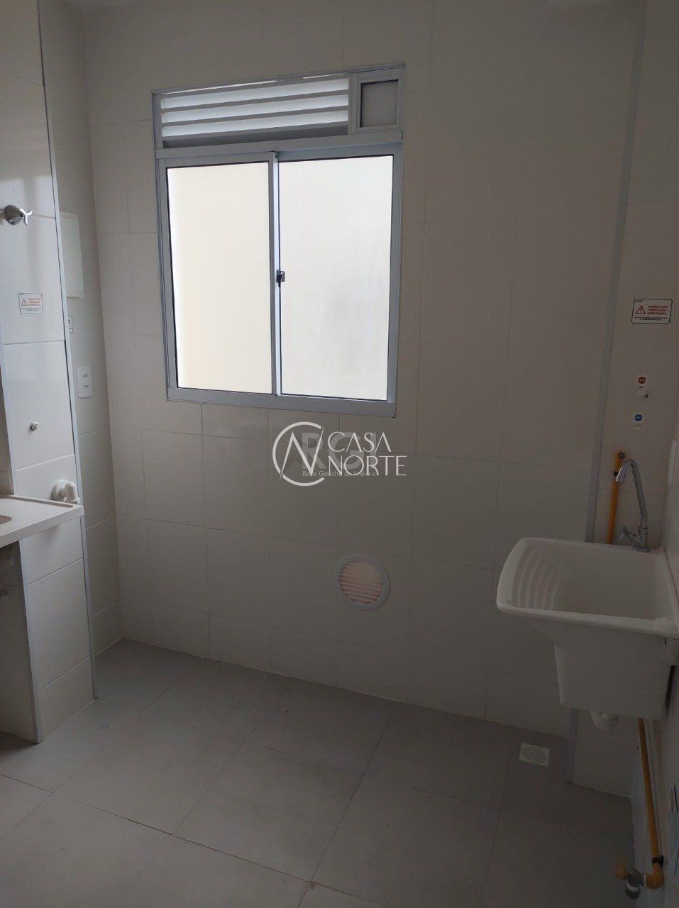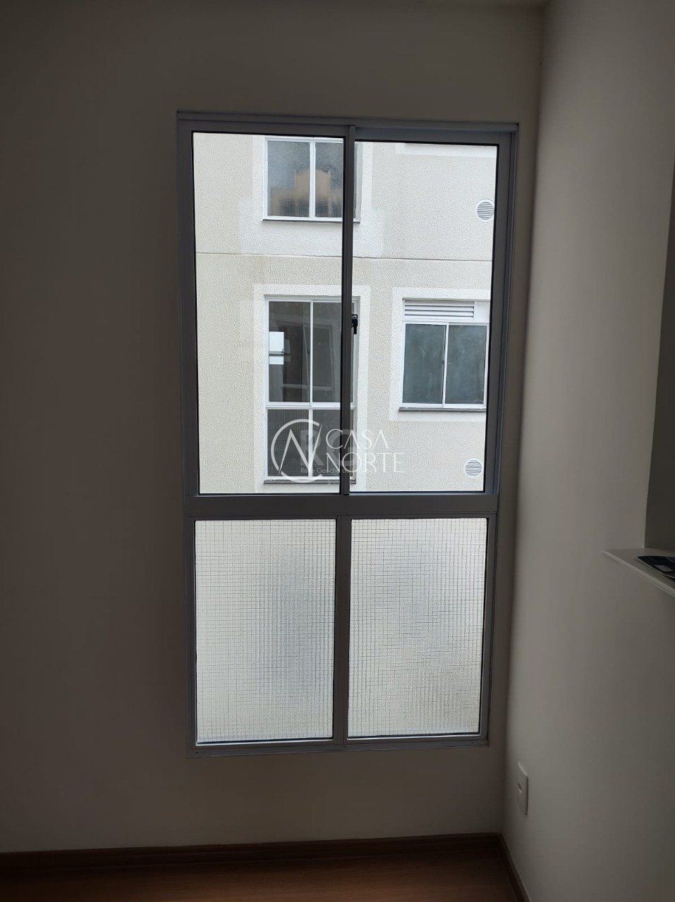 Possui piso laminado na sala e nos quartos, piso cerâmico na cozinha e banheiro, e aberturas em alumínio.