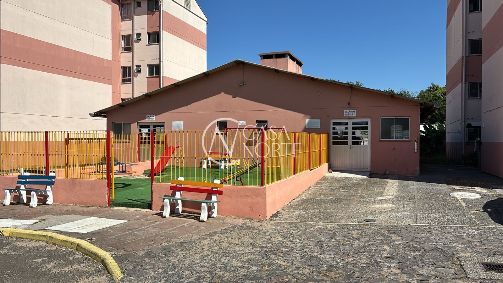 São 40m² distribuídos em 02 dormitórios, sendo 01 com armário, living 02 ambientes, cozinha com pia e armários, área de serviço com tanque e banheiro social.