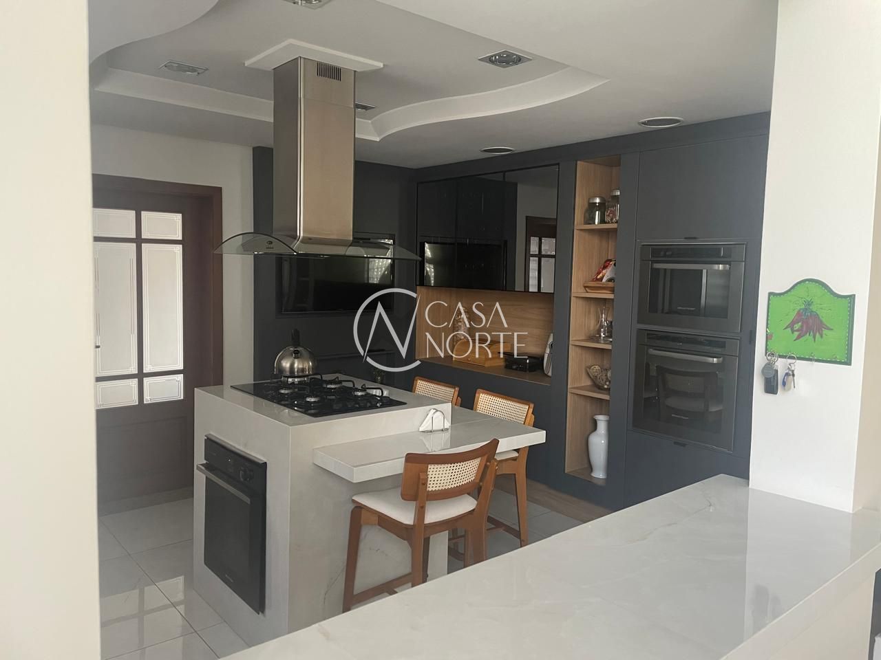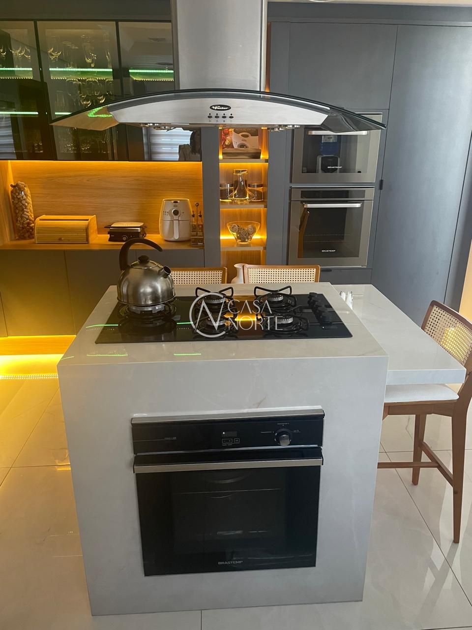 Cozinha e Lavanderia: A cozinha é funcional e bem distribuída, com três fornos embutidos, ilha com cooktop, exaustor, TV e ar condicionado split. A lavanderia e despensa foram planejadas para máxima organização, com armários do chão ao teto.