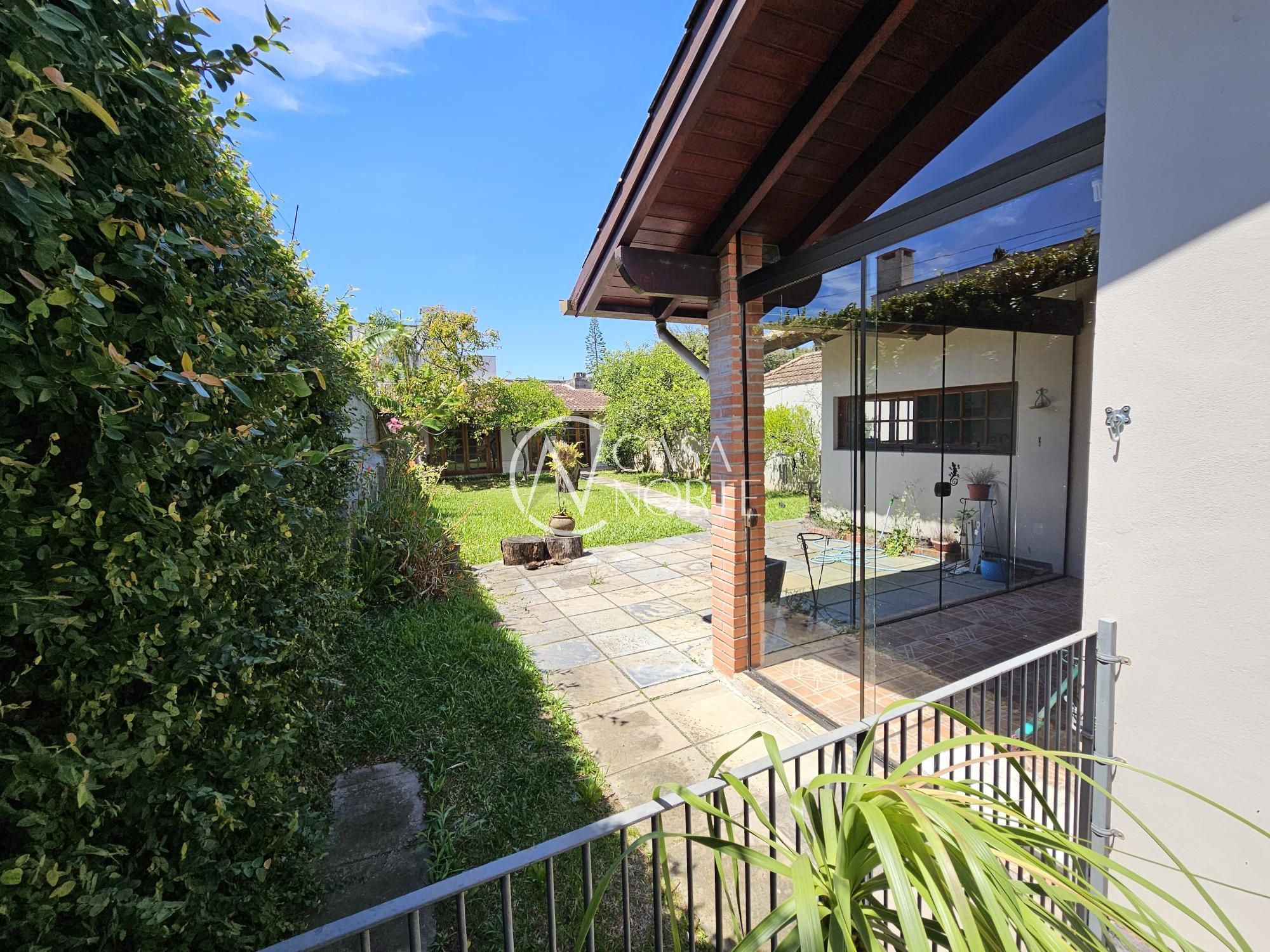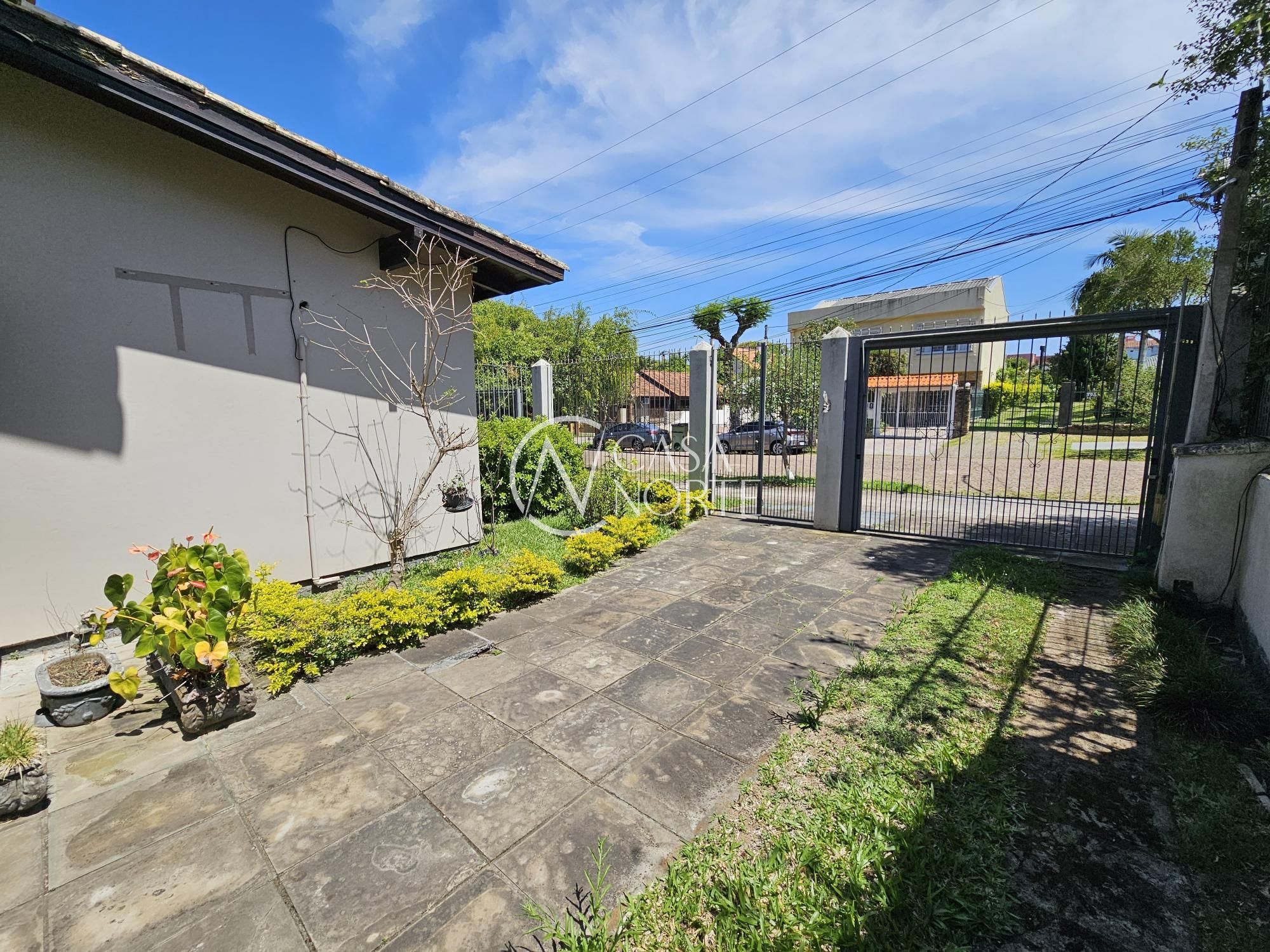 Casa com recuo, térreo com living de pé direito duplo, suíte + dormitório, cozinha, varanda e amplo pátio no fundos, com salão de festas e churrasqueira + banheiro.