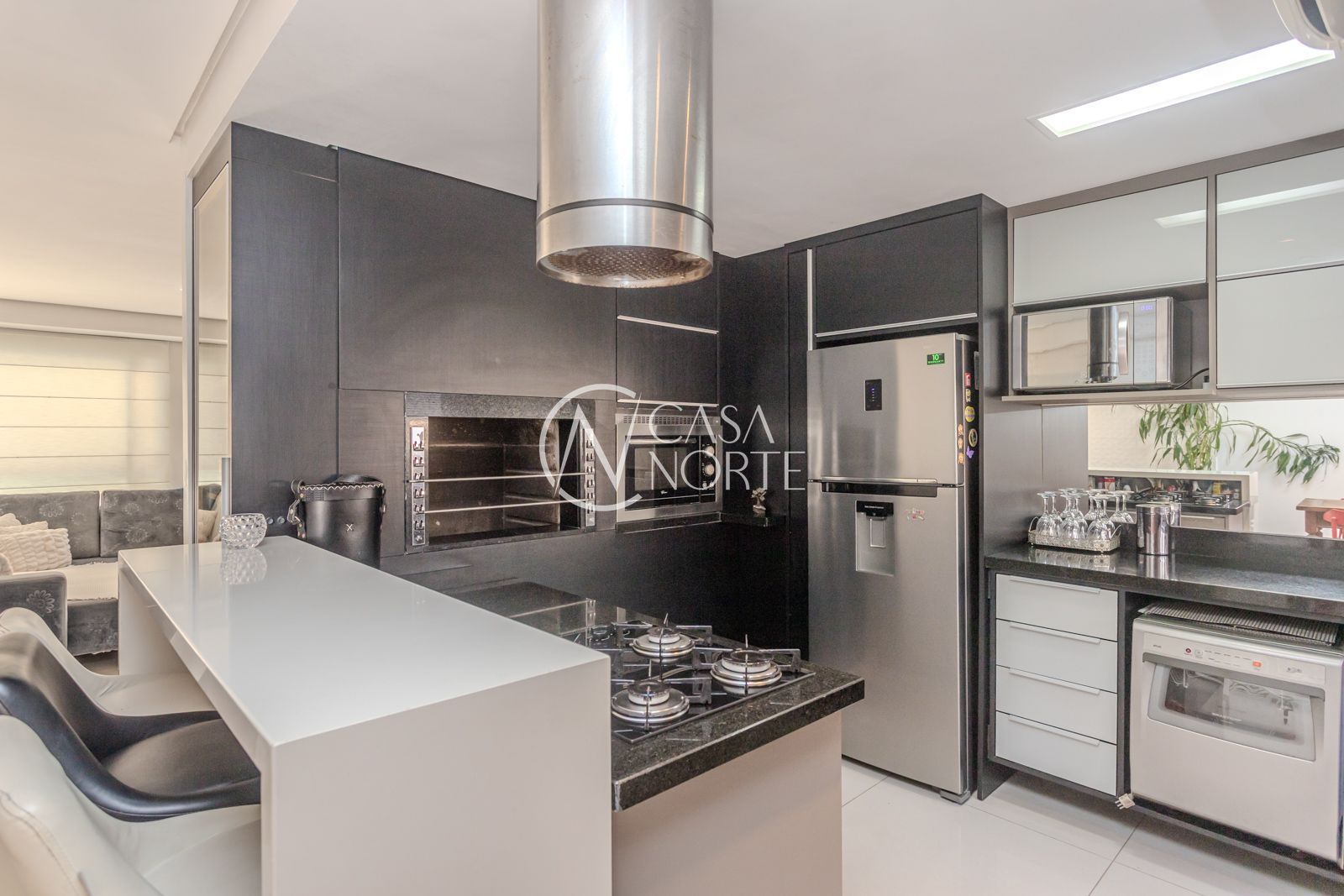 O living é generoso e convidativo, com lareira que traz aconchego ao ambiente e cria o cenário ideal tanto para o dia a dia quanto para receber. O lavabo complementa a área social. Já a cozinha, integrada ao espaço de churrasco, possui marcenaria planejada e um layout moderno que valoriza a convivência.