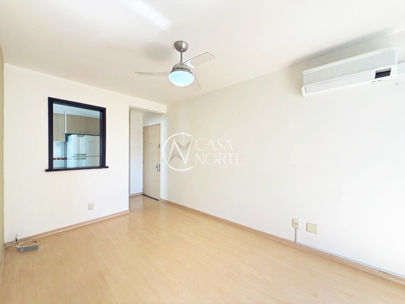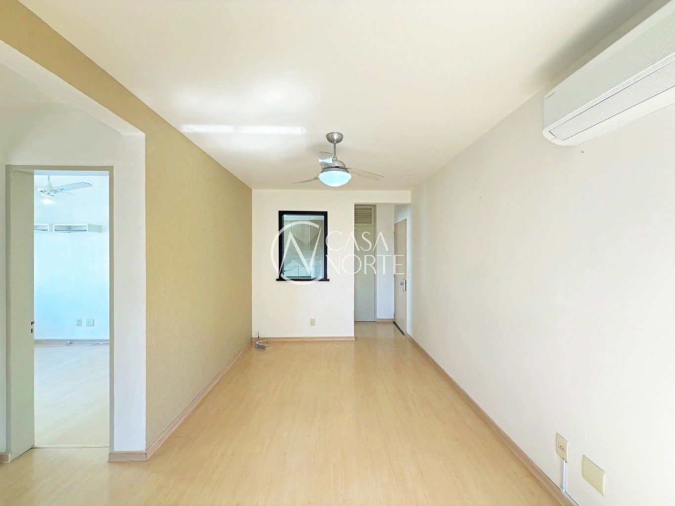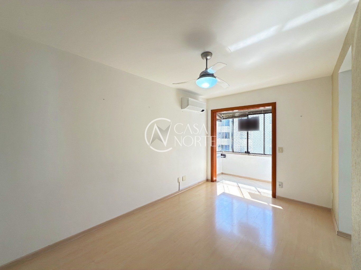 Sala ampla, arejada e bem iluminada, com piso laminado e pequena varanda, proporcionando conforto e boa ventilação natural.
