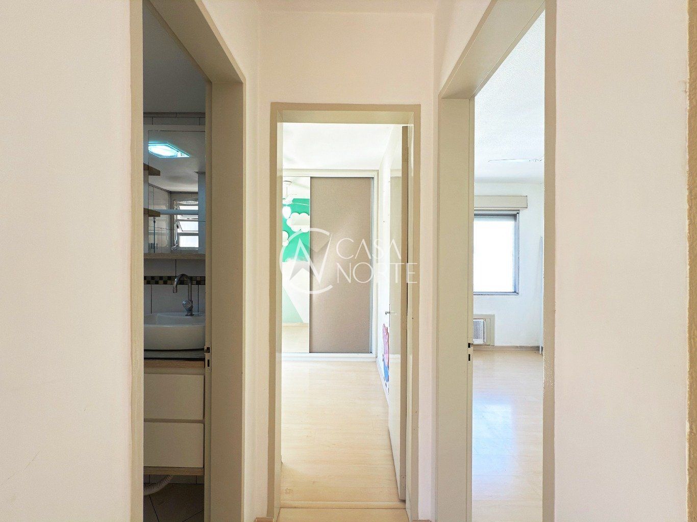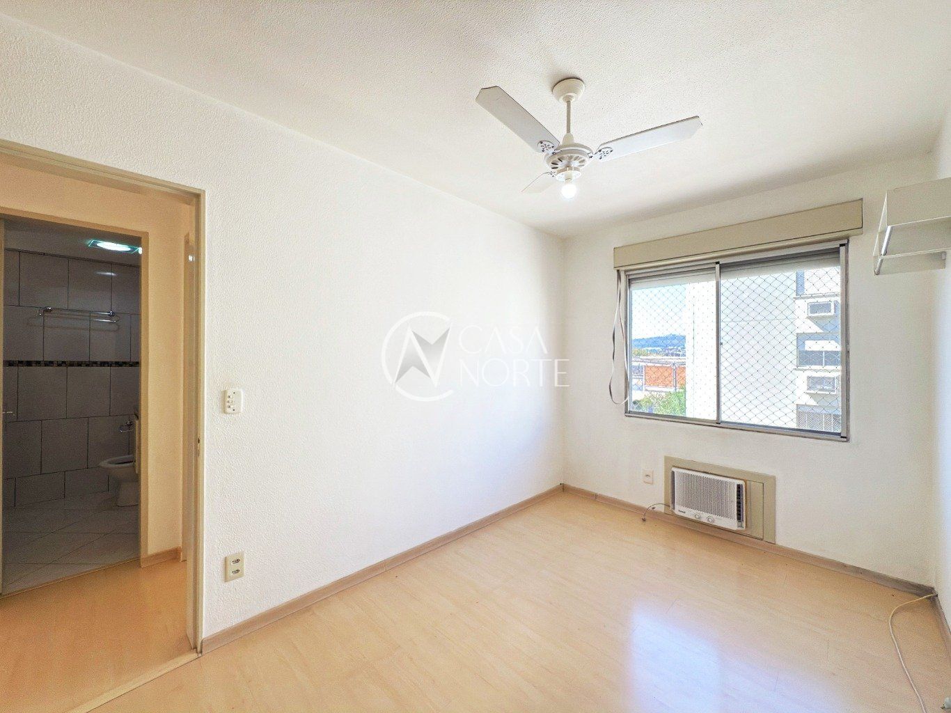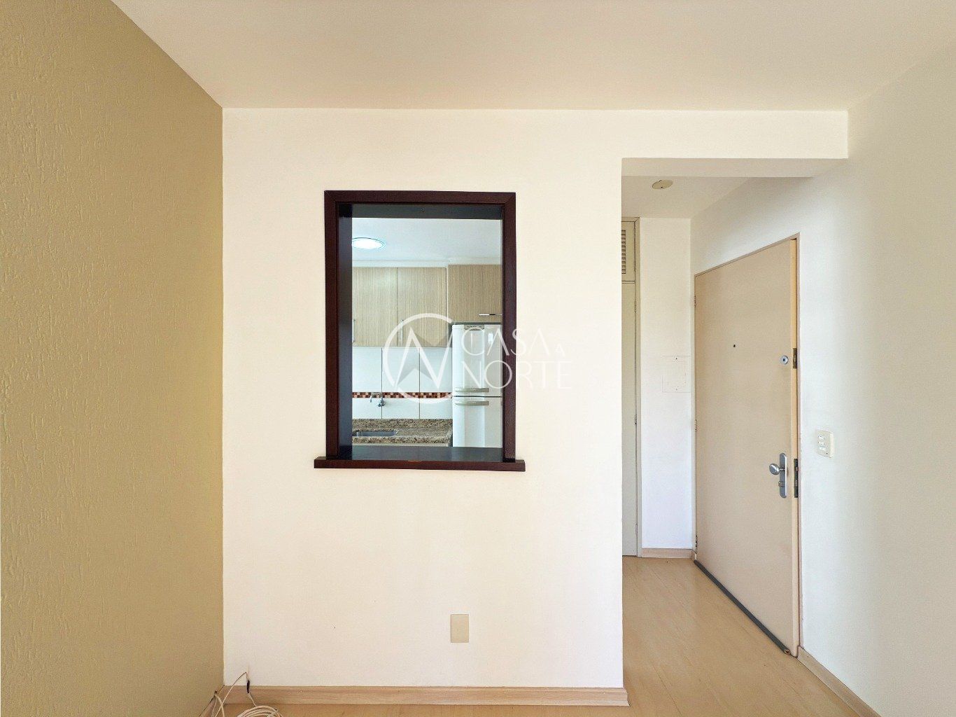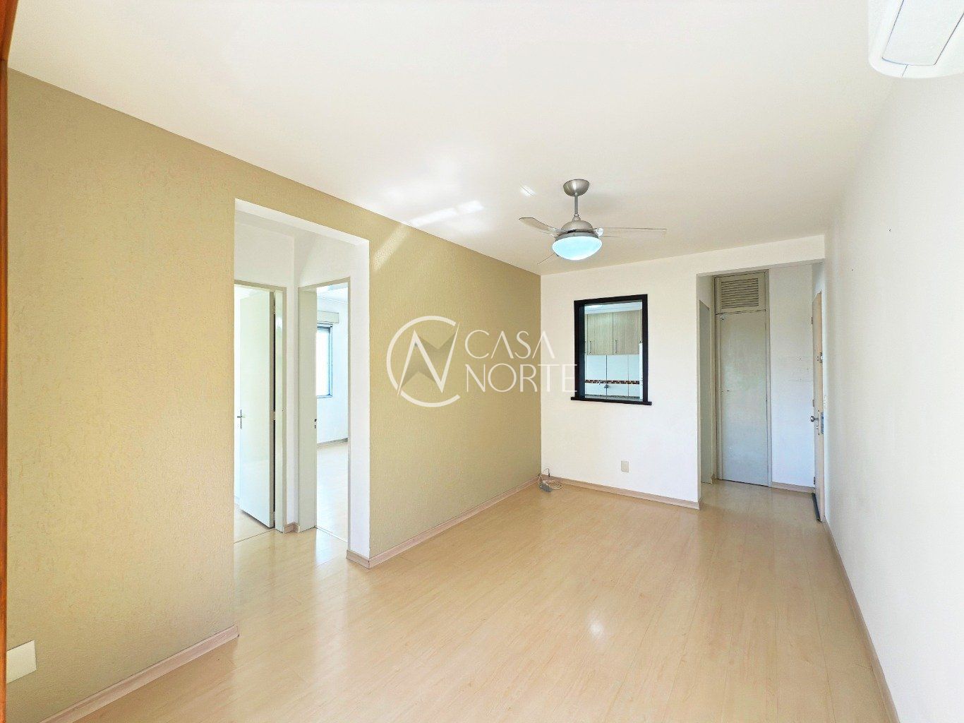 Sala ampla, arejada e bem iluminada, com piso laminado e pequena varanda, proporcionando conforto e boa ventilação natural.