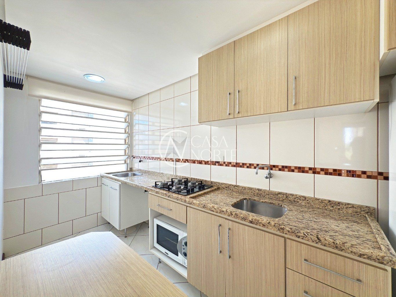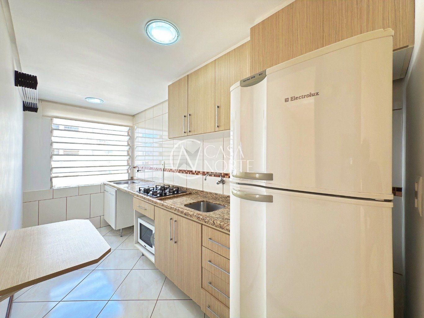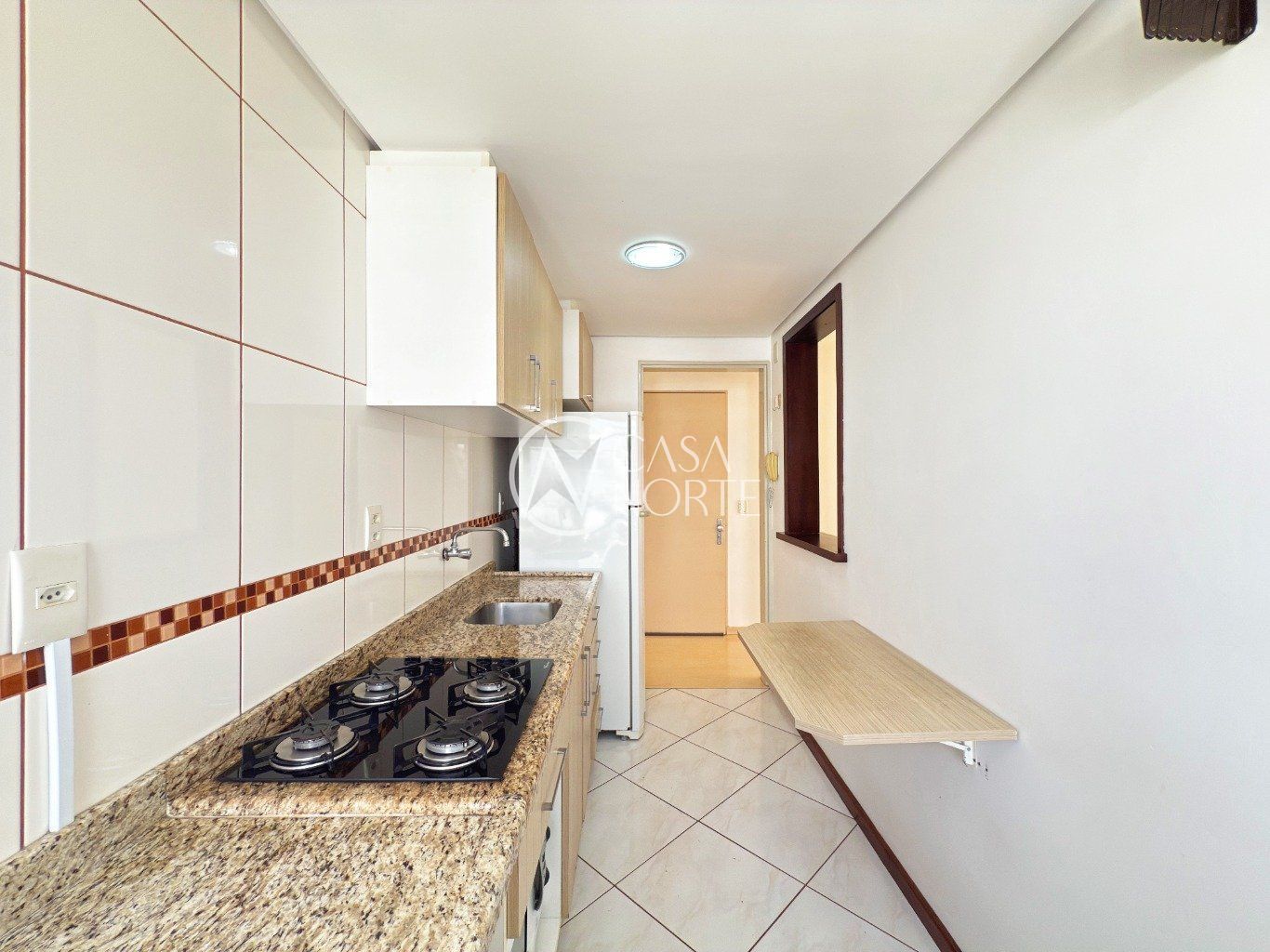 Cozinha espaçosa, ventilada e com excelente incidência de luz solar, equipada com janelas grandes, revestimento em cerâmica, móveis sob medida, geladeira, armários e pia em mármore com cooktop.
