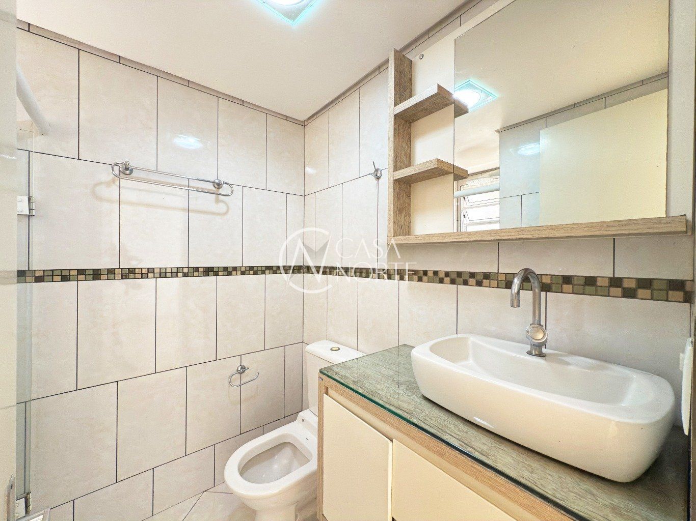 Banheiro totalmente revestido em cerâmica, com box de vidro, armários planejados e ambiente bem iluminado e arejado.