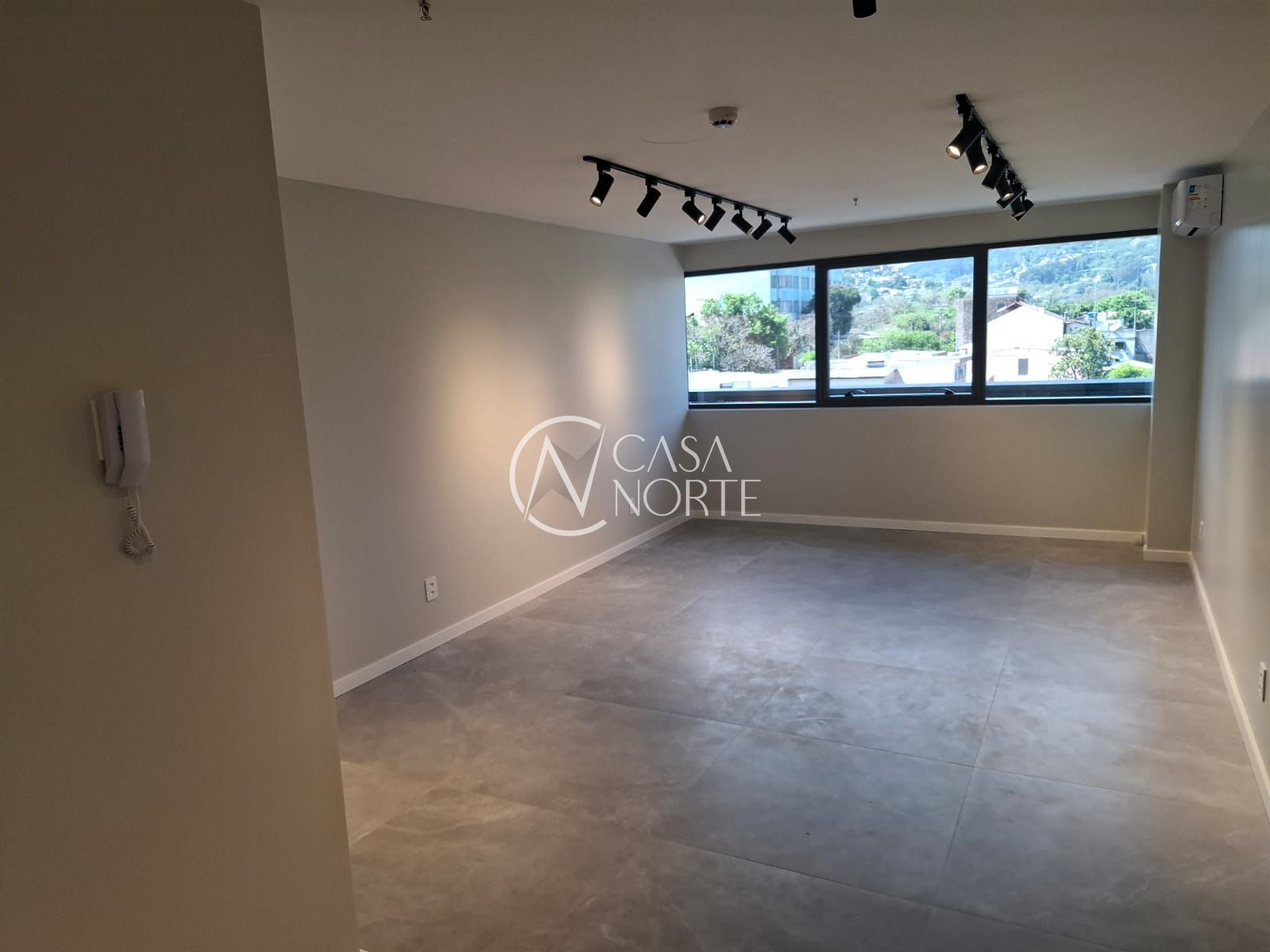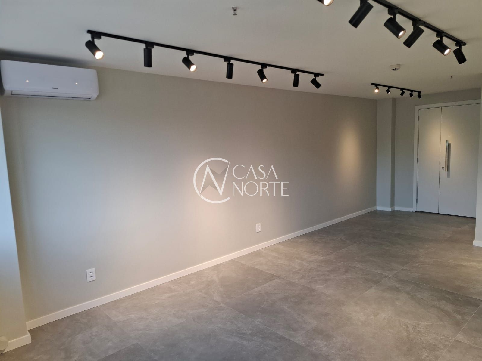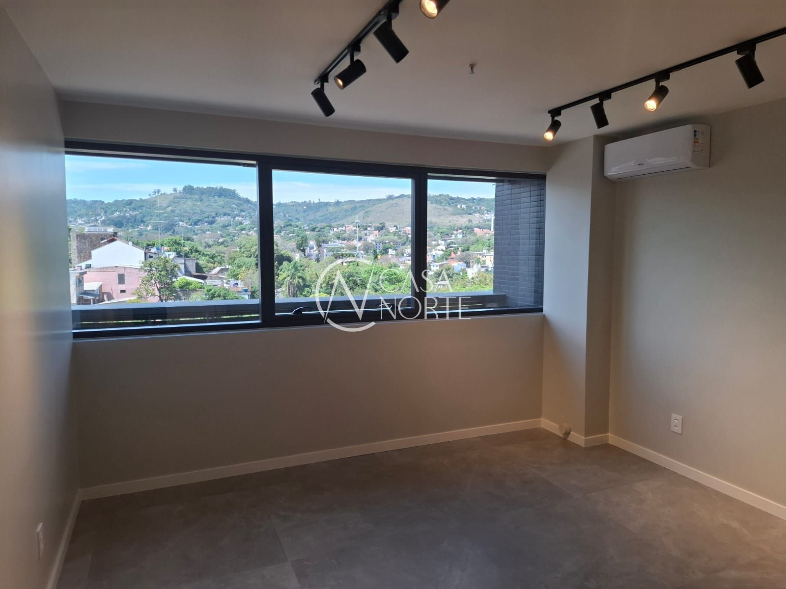 Sala comercial de frente com vista livre no sétimo andar com piso porcelanato, luminárias e 2 ar condicionado tipo split.