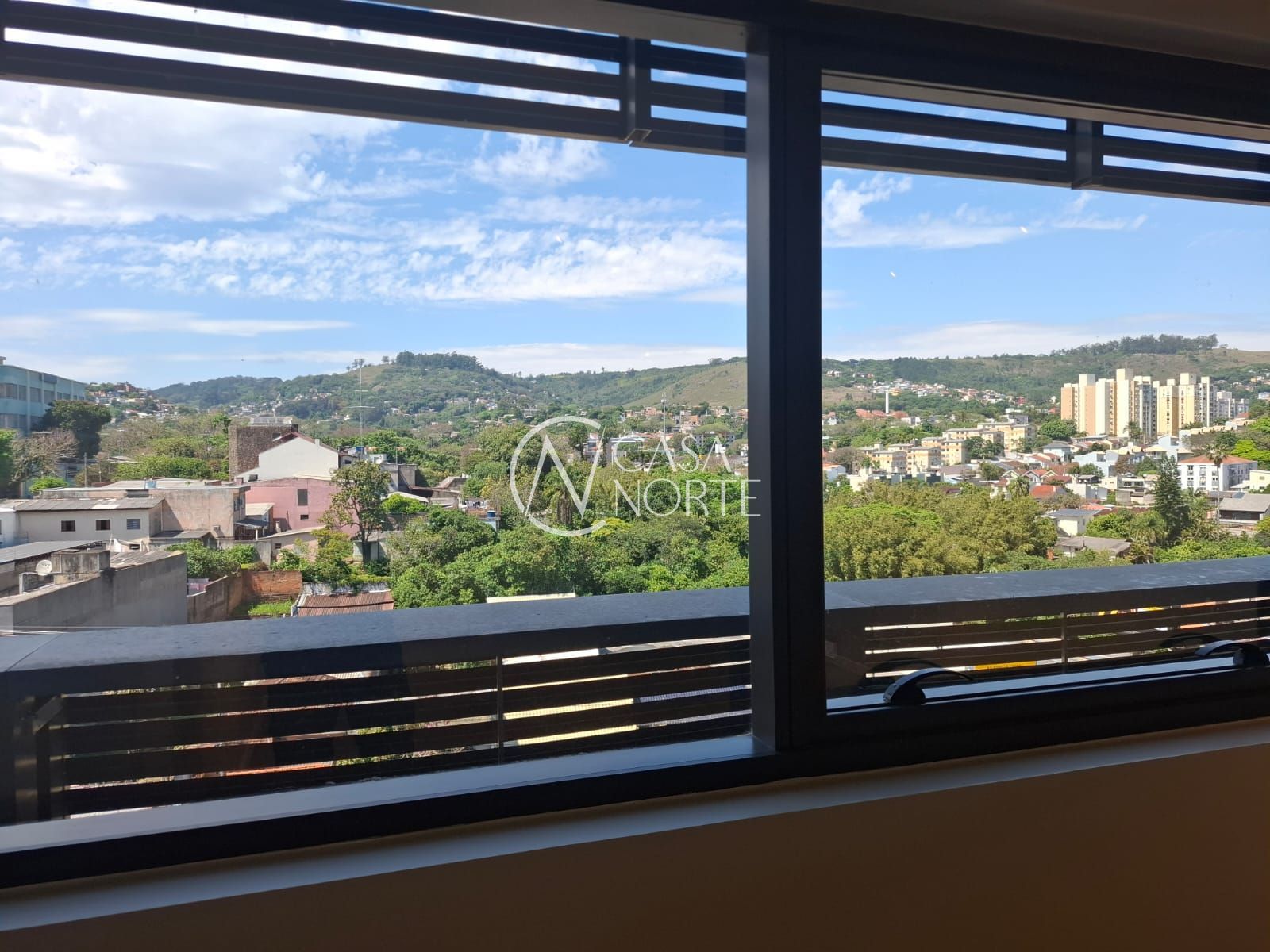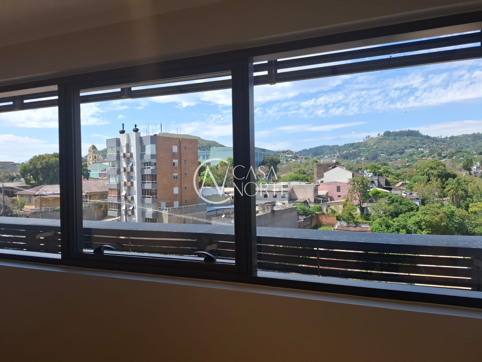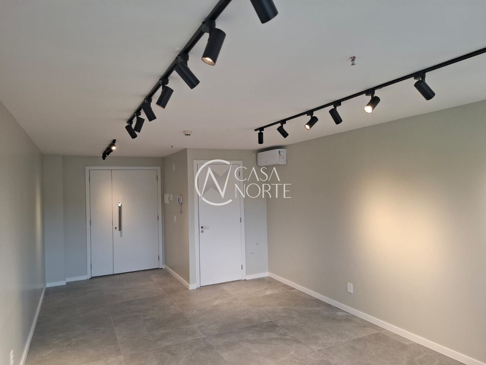 Sala comercial de frente com vista livre no sétimo andar com piso porcelanato, luminárias e 2 ar condicionado tipo split.