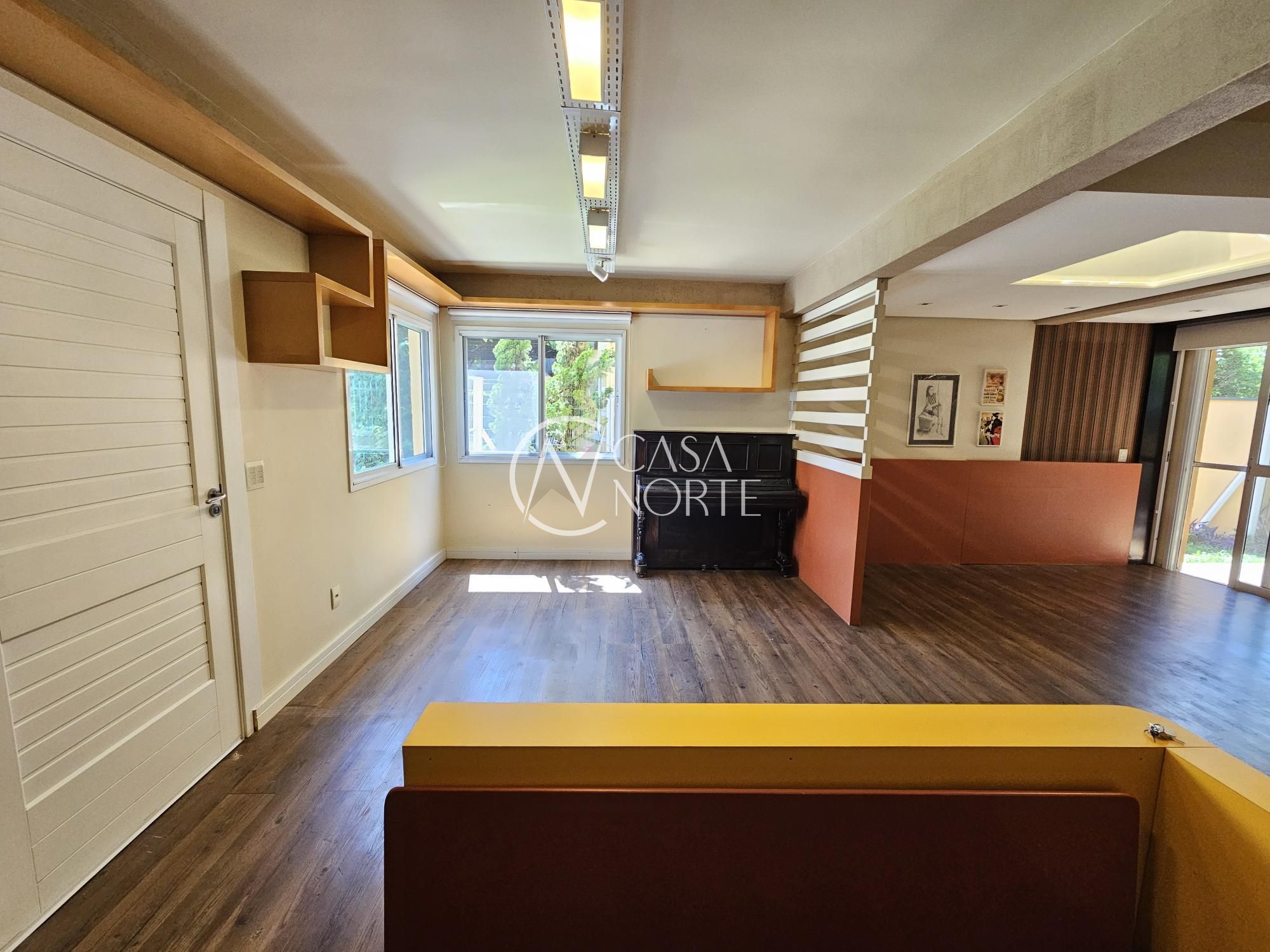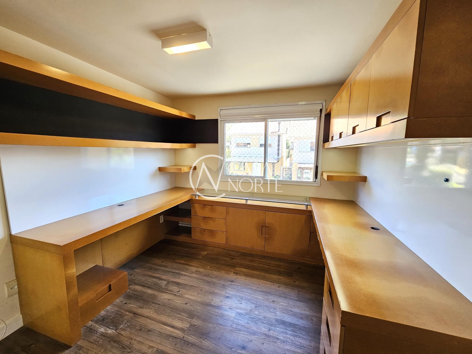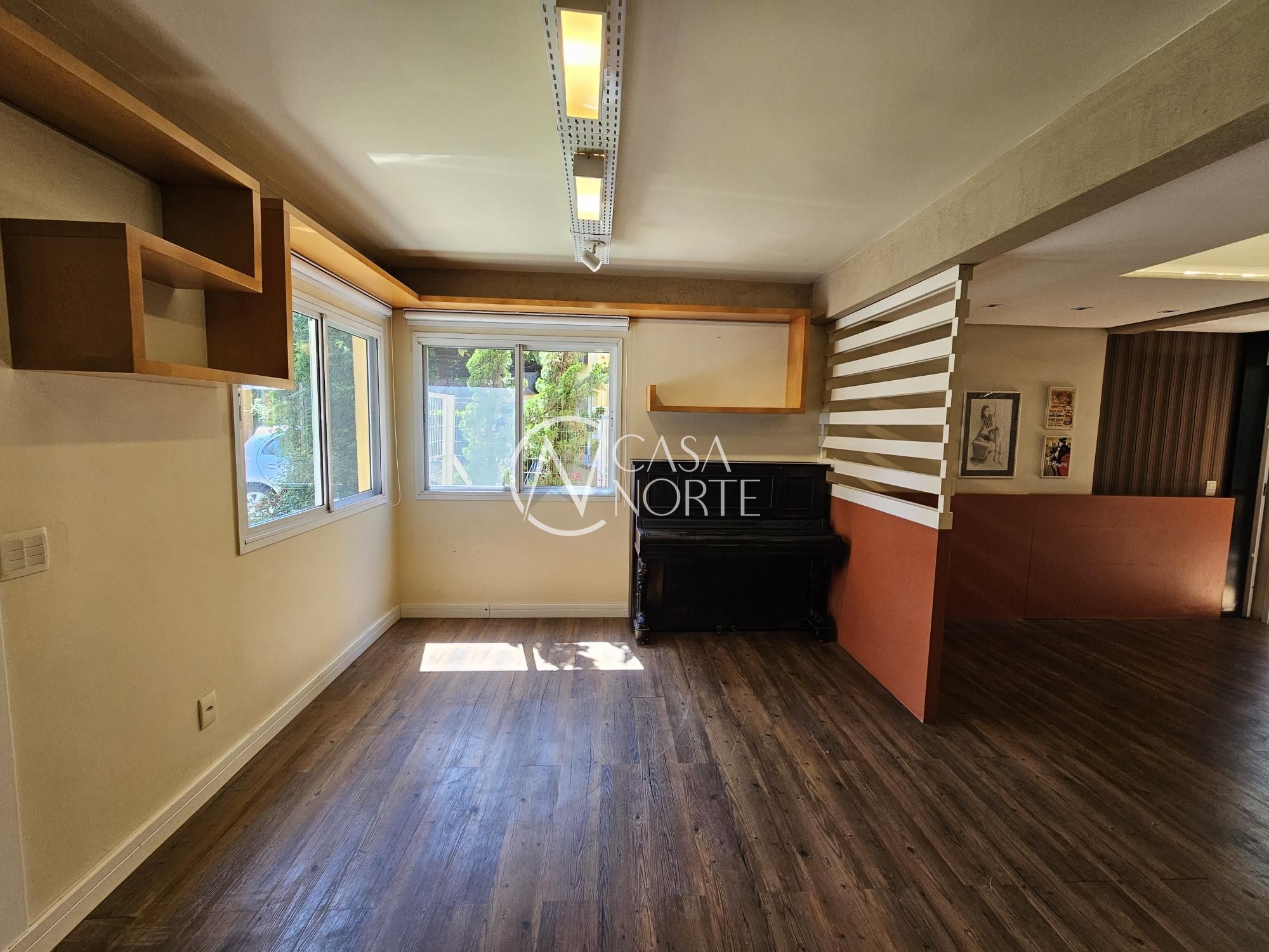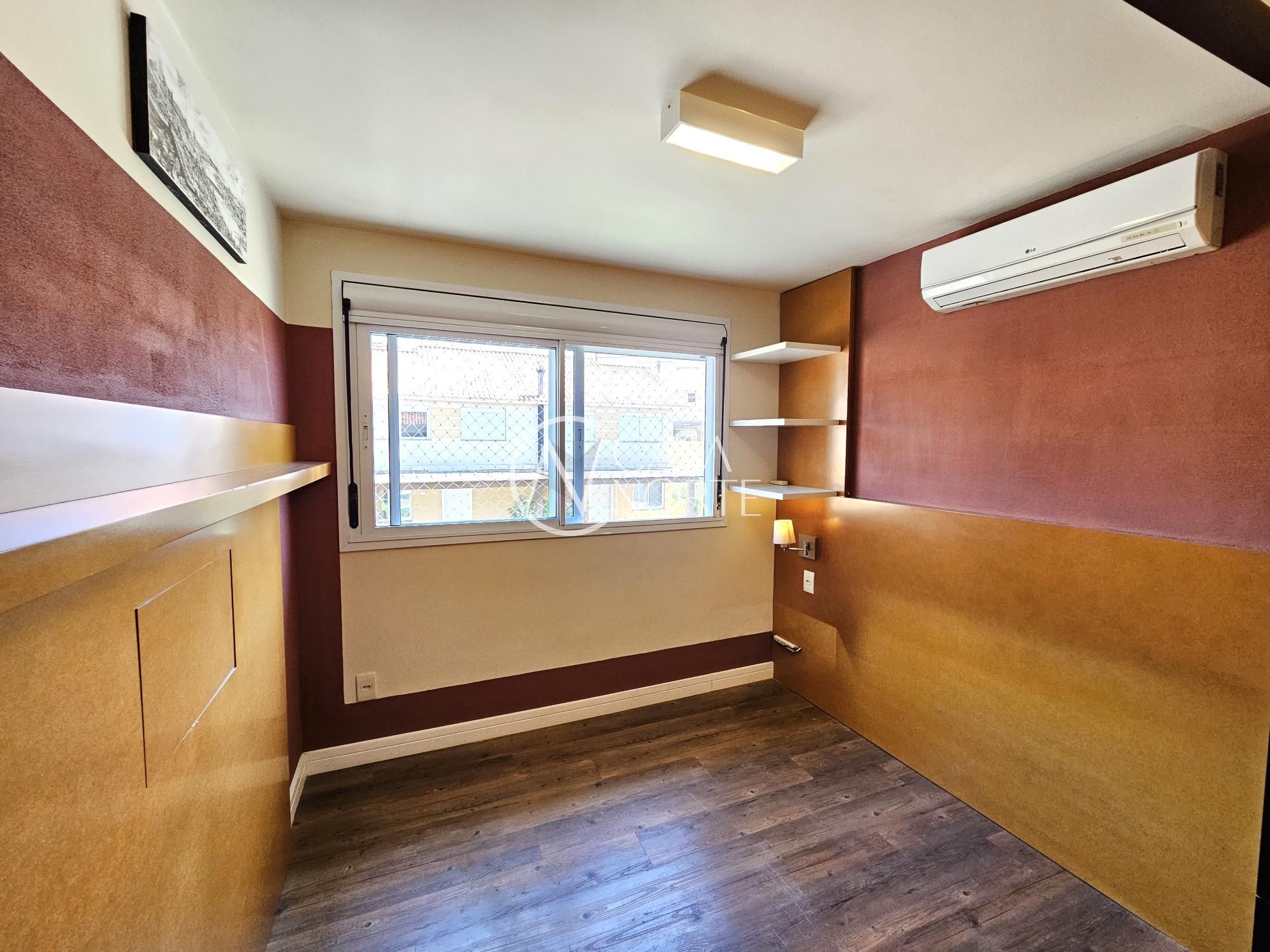 Desocupada e semimobiliada, casa com 3 dormitórios, sendo uma suíte, vaga para dois carros. Térreo tem living para 3 ambientes com lareira, cozinha com armários, área de serviço independente, varanda para o quintal de fundos. Na parte superior ficam os dormitórios, todos com armários sob medida.