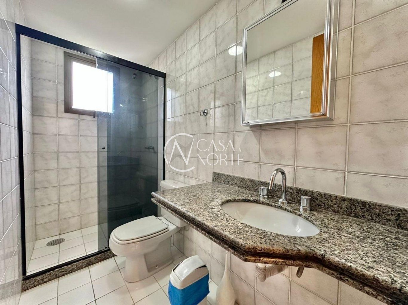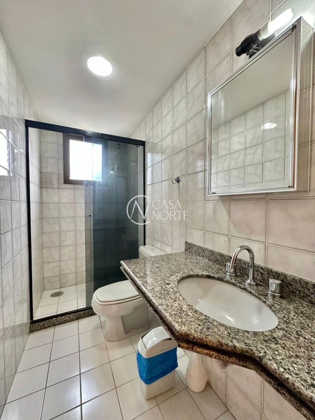 Banheiro totalmente revestido em cerâmica, box de vidro, armários planejados, ambiente arejado e bem iluminado. Área de serviço ampla, ventilada e iluminada.