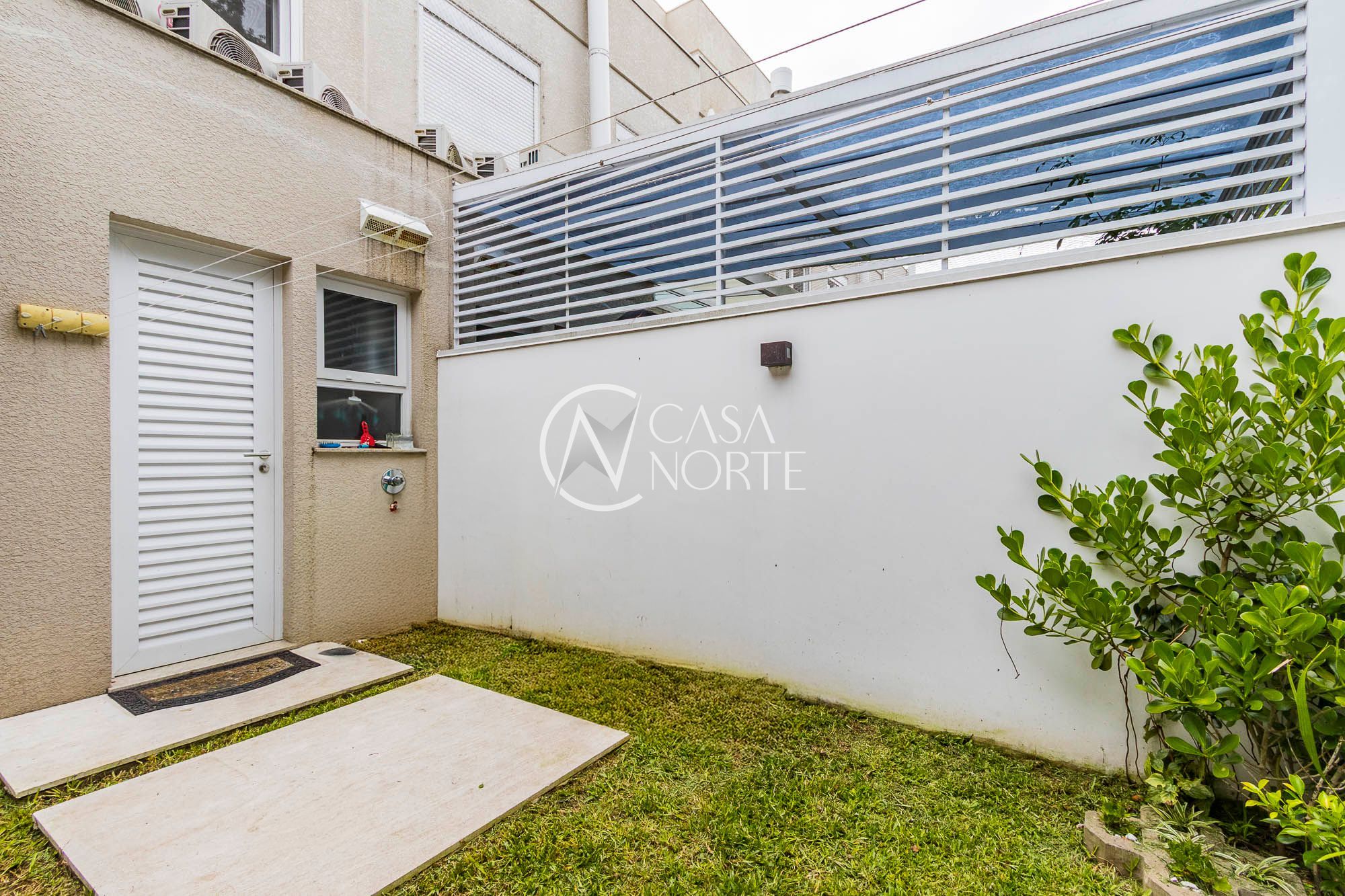 O pátio privativo, com pergolado e gramado, é perfeito para receber amigos e aproveitar momentos ao ar livre.