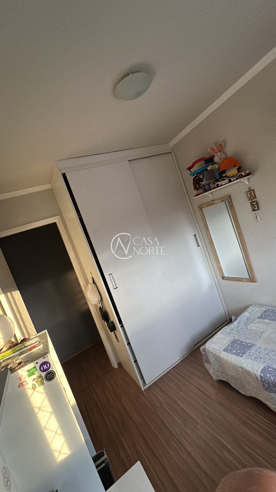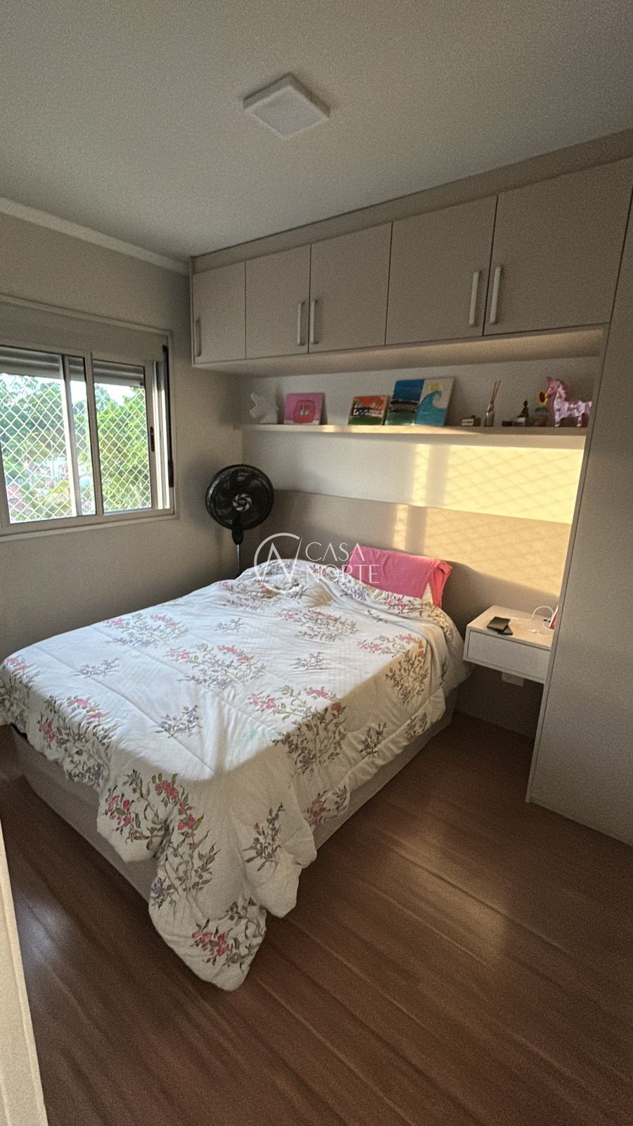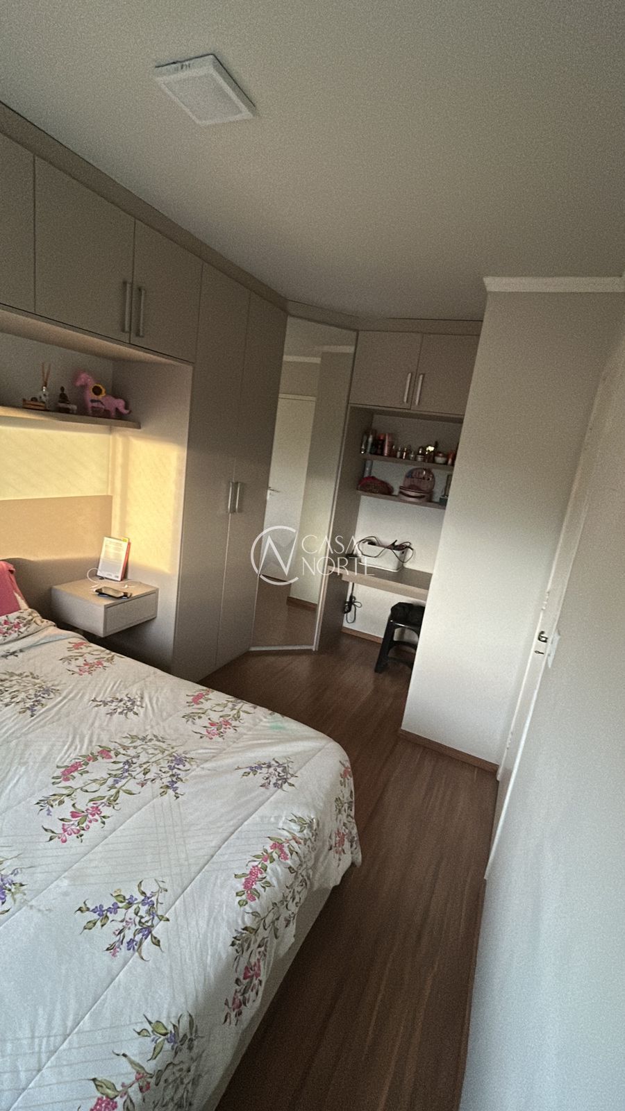 Segundo quarto mobiliado com cama e armários sob medida, espaço versátil que pode ser utilizado como closet, quarto de hóspedes, escritório, dependência, espaço fitness, sala de jogos, despensa, lavanderia, cinema privativo ou brinquedoteca.