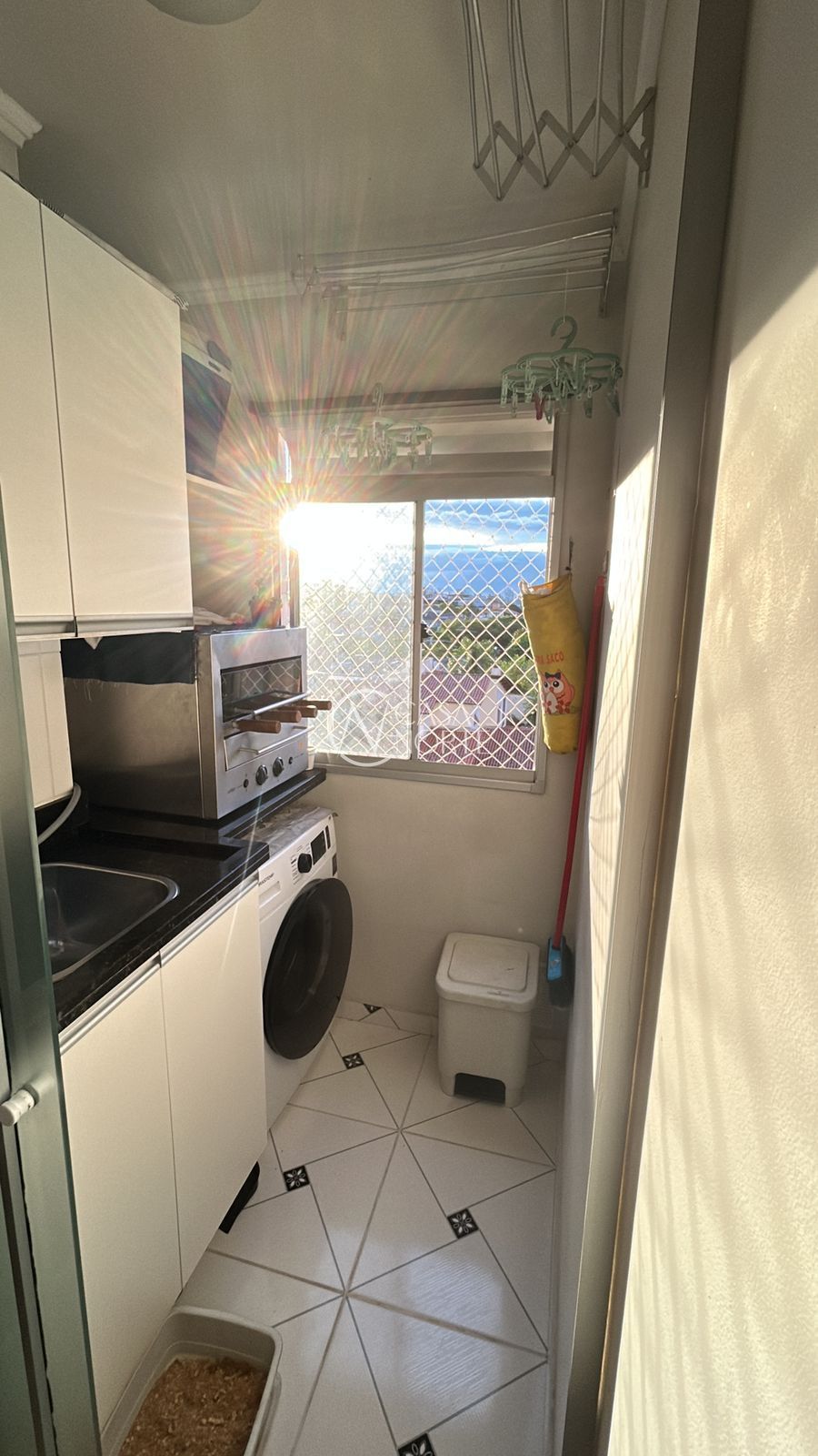 Lavanderia separada, arejada e iluminada, com máquina de lavar e armários.