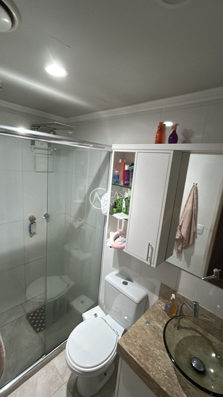 Banheiro mobiliado com armários sob medida, pia em mármore, box de vidro e chuveiro 220v, com possibilidade de instalação de aquecimento a gás.