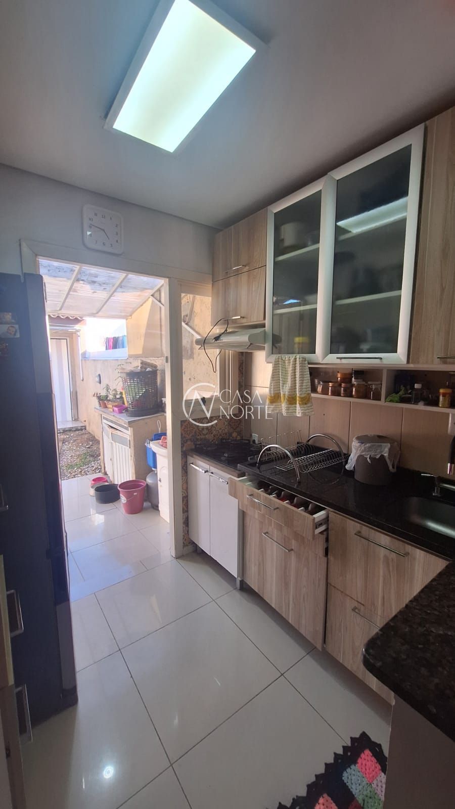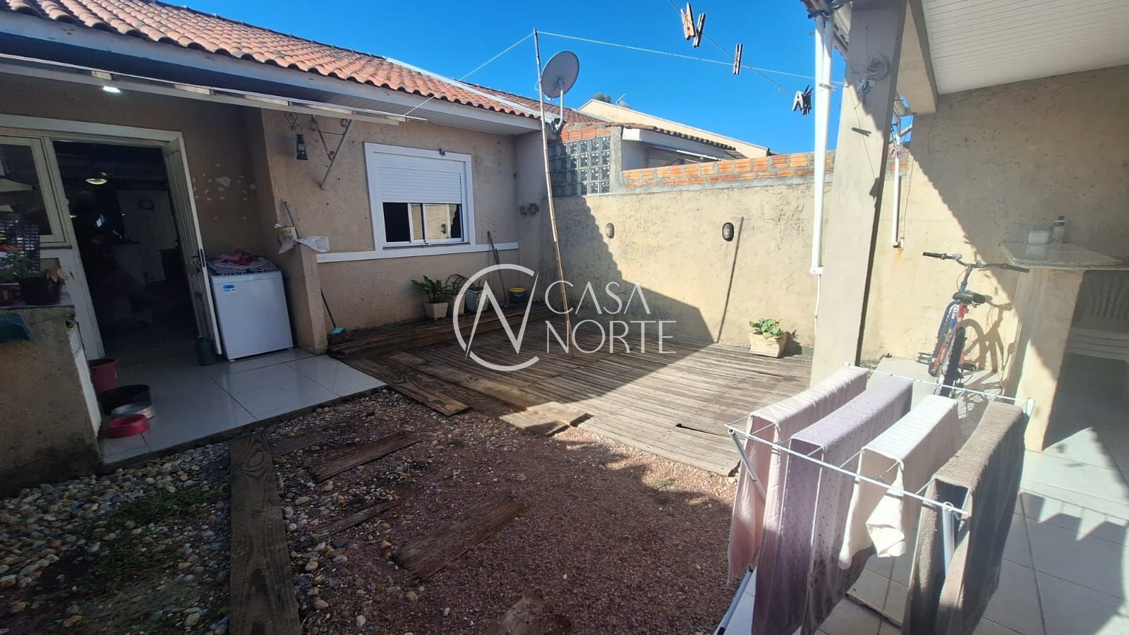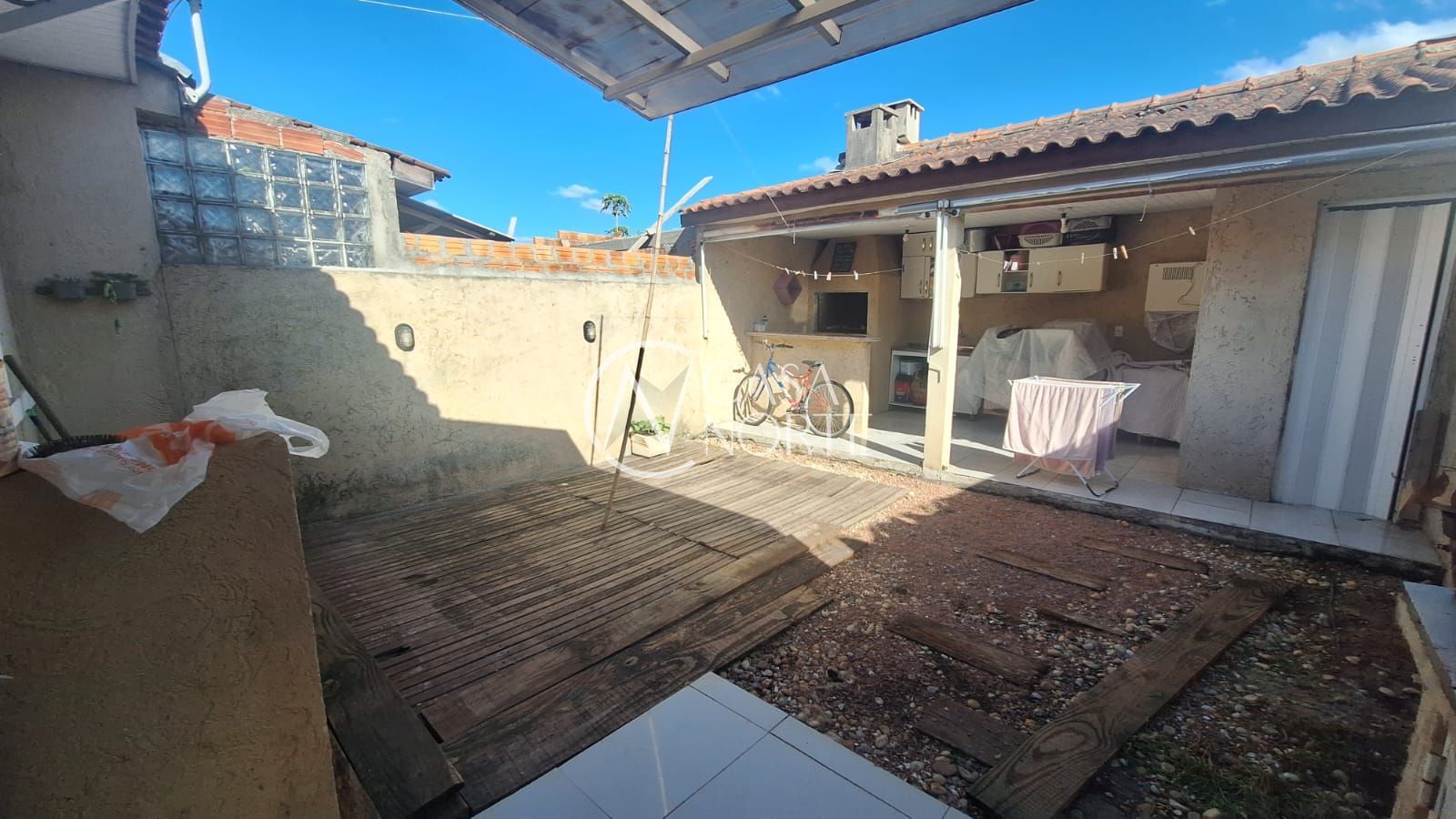 Na fachada da casa, pátio da frente com telhado e vaga para carro , na entrada da casa hall de entrada fechado com vidro. Ao entrar na sala, tem se a vista para a cozinha e o pátio dos fundos . Na entre sala/cozinha a entrada para os quartos e banheiro . Na cozinha, se chega a porta dos fundos que leva para o pátio , com espaço reservado para área de serviço coberta.