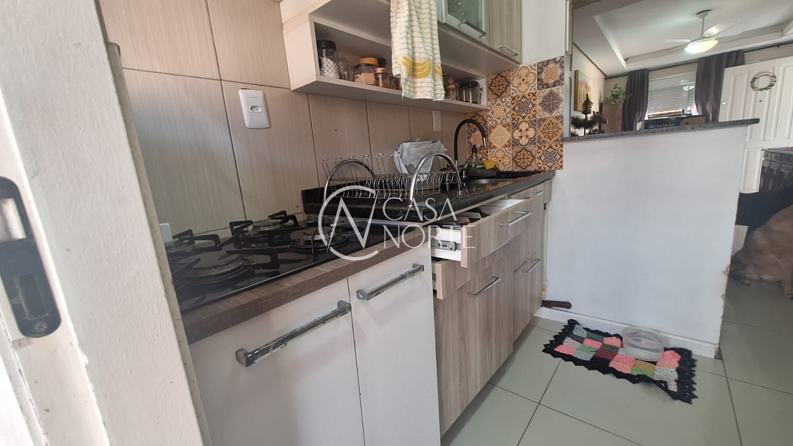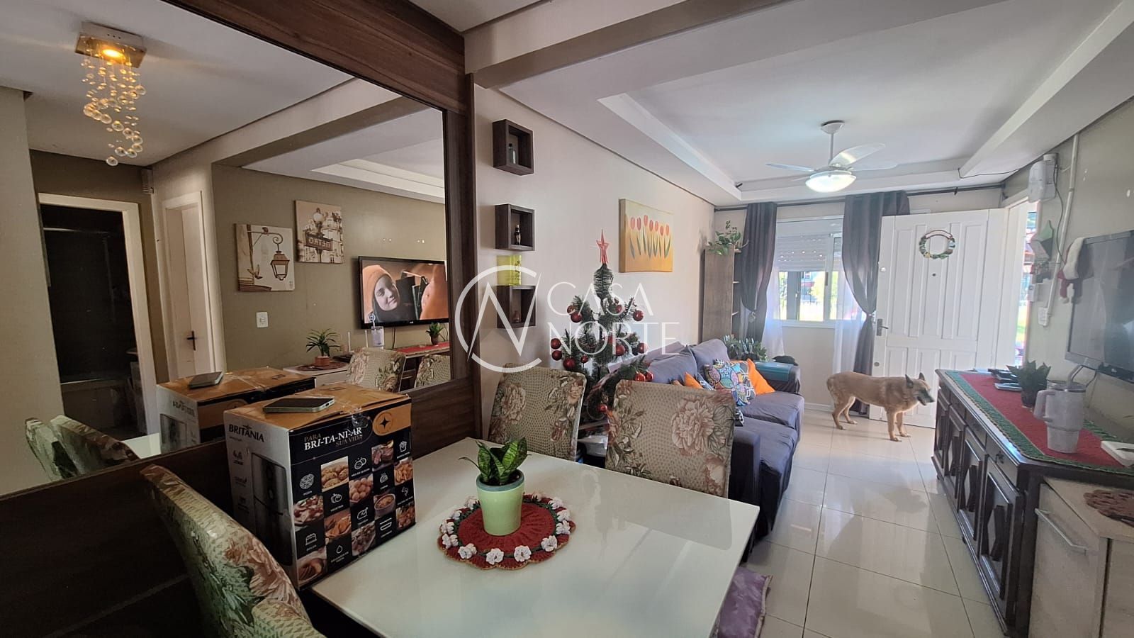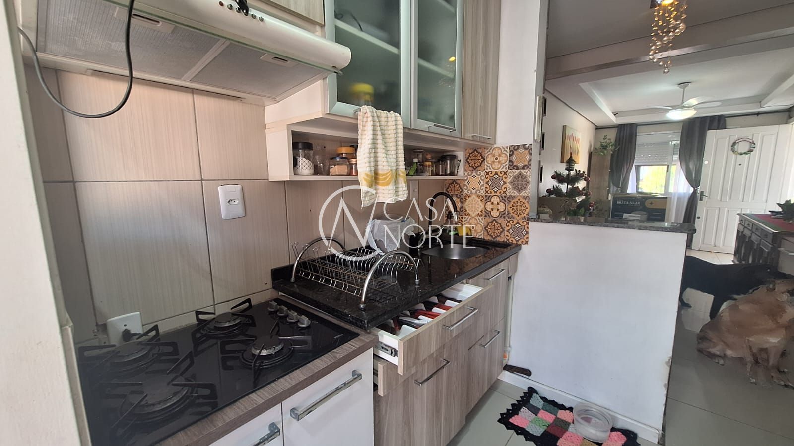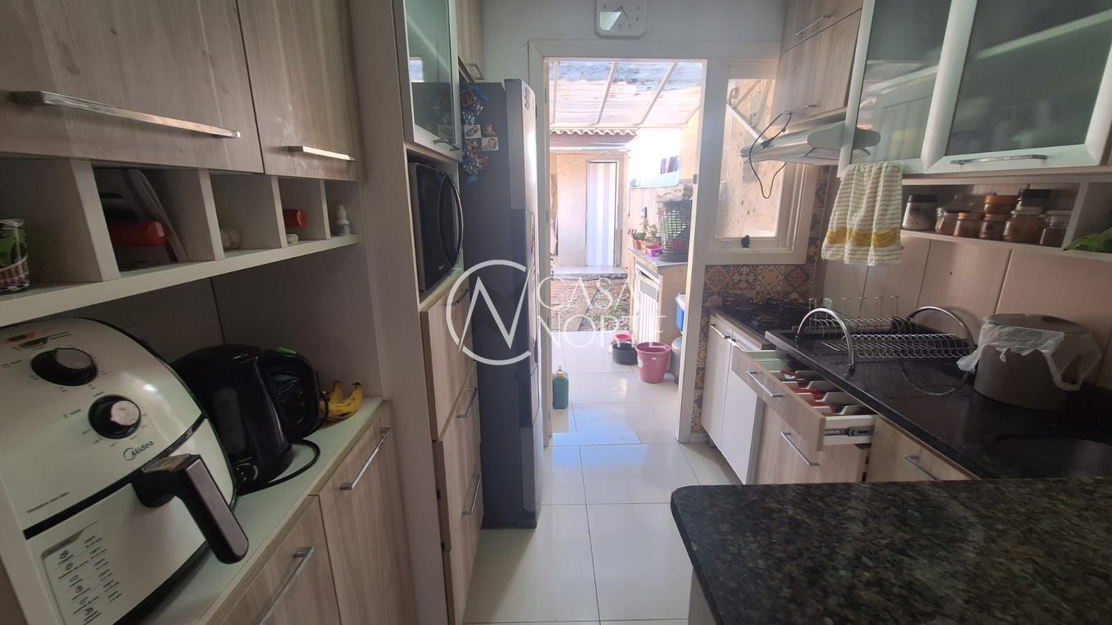 Na fachada da casa, pátio da frente com telhado e vaga para carro , na entrada da casa hall de entrada fechado com vidro. Ao entrar na sala, tem se a vista para a cozinha e o pátio dos fundos . Na entre sala/cozinha a entrada para os quartos e banheiro . Na cozinha, se chega a porta dos fundos que leva para o pátio , com espaço reservado para área de serviço coberta.