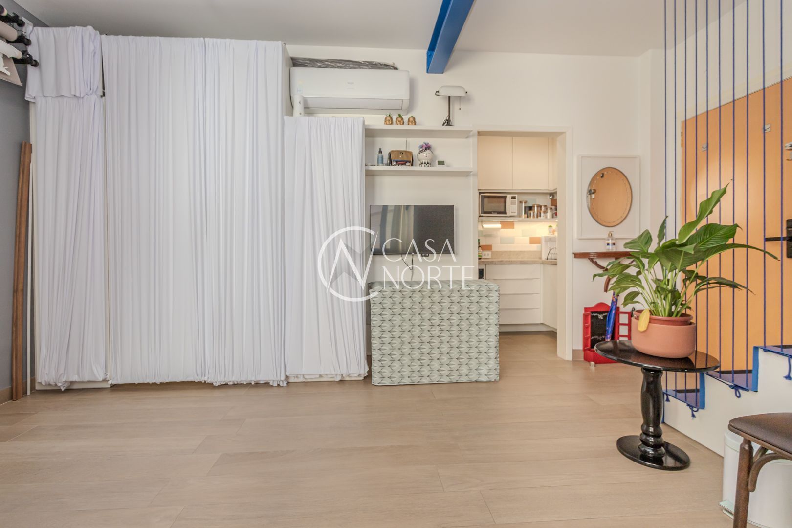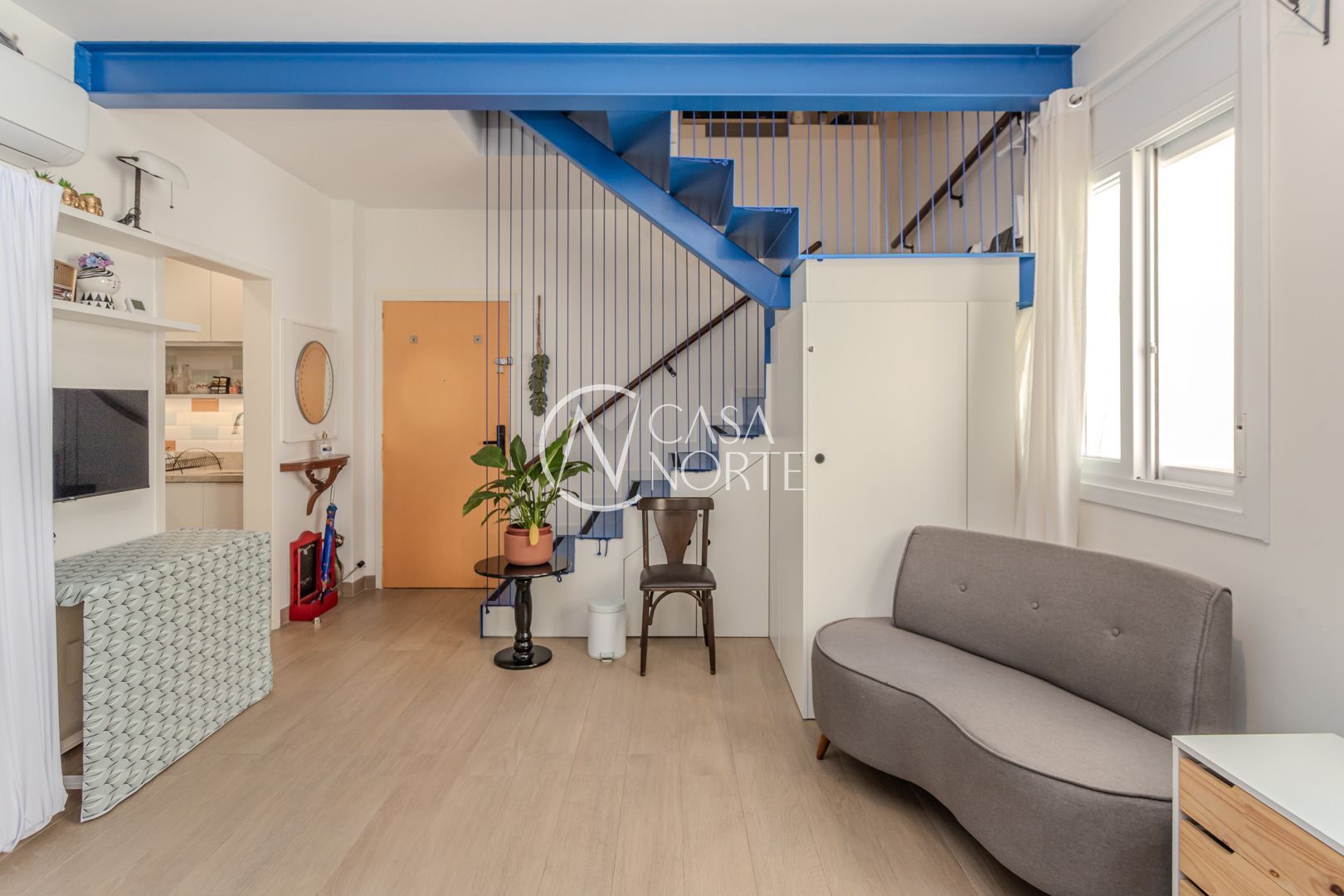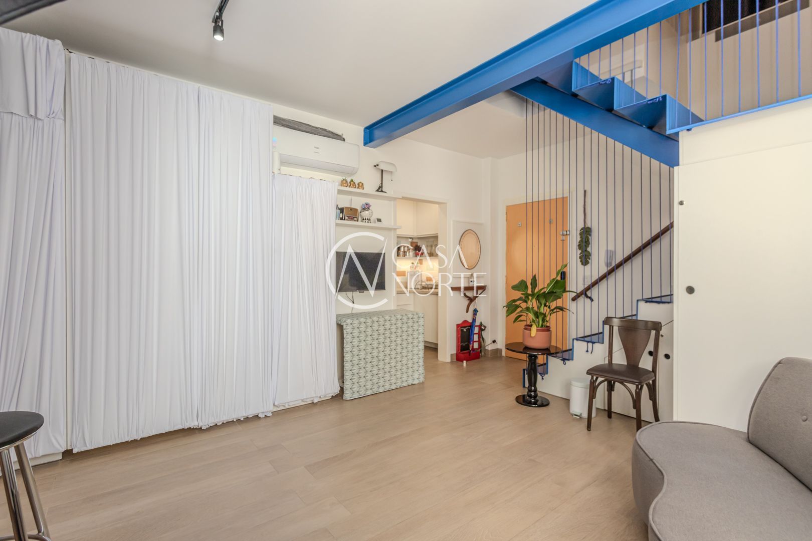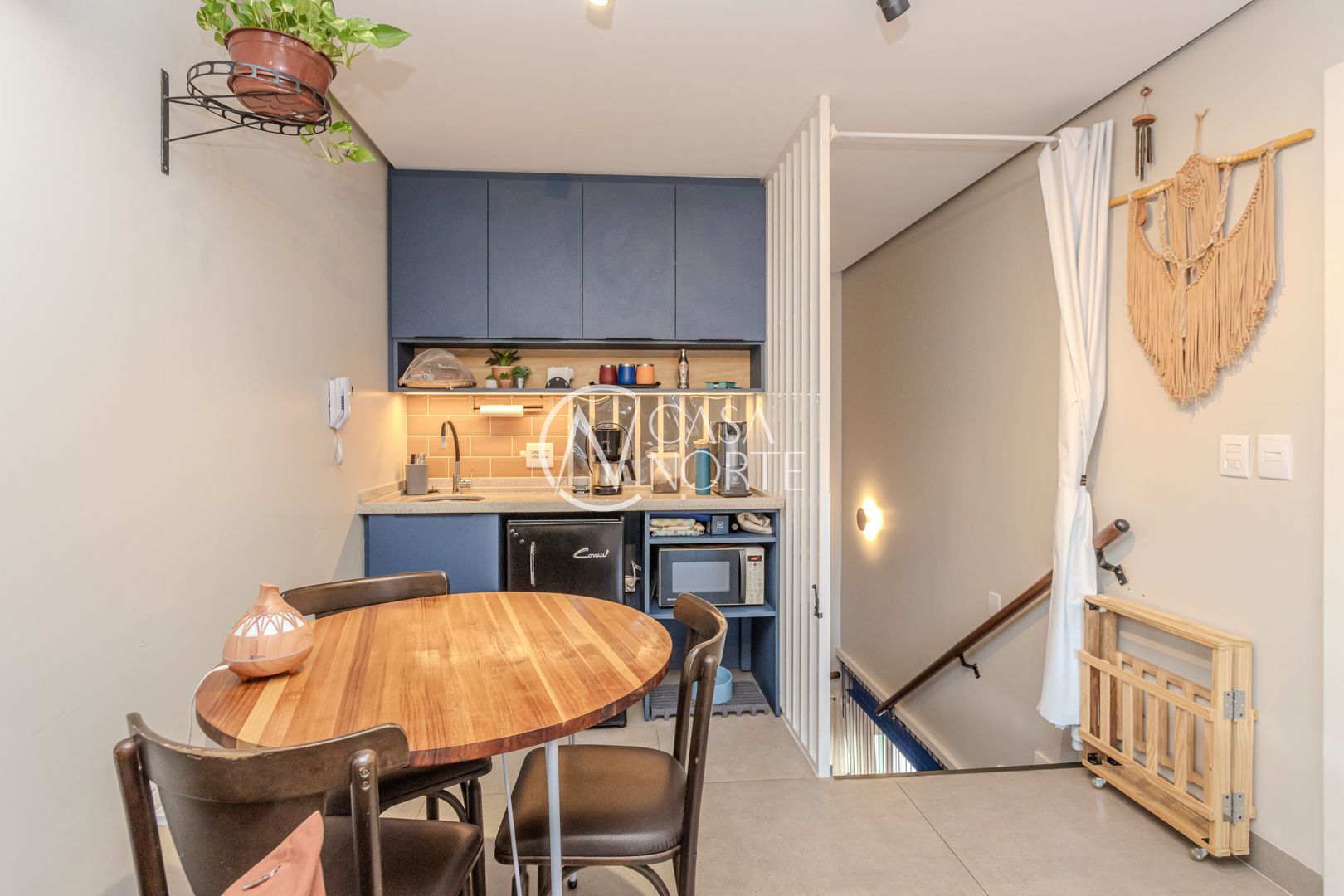 Cozinha planejada integrada à ampla sala utilizada como Estudio. Quarto com móveis sob medida no segundo piso. Sala integrada à copa e ao terraço na cobertura. Instaladas janelas anti-ruído.