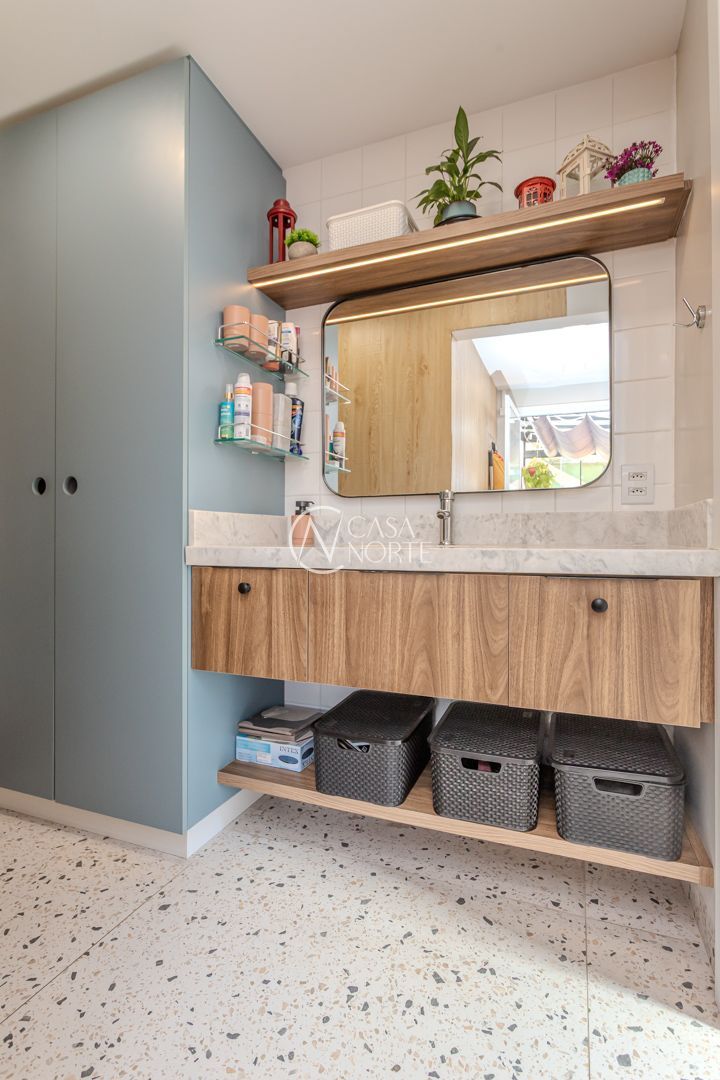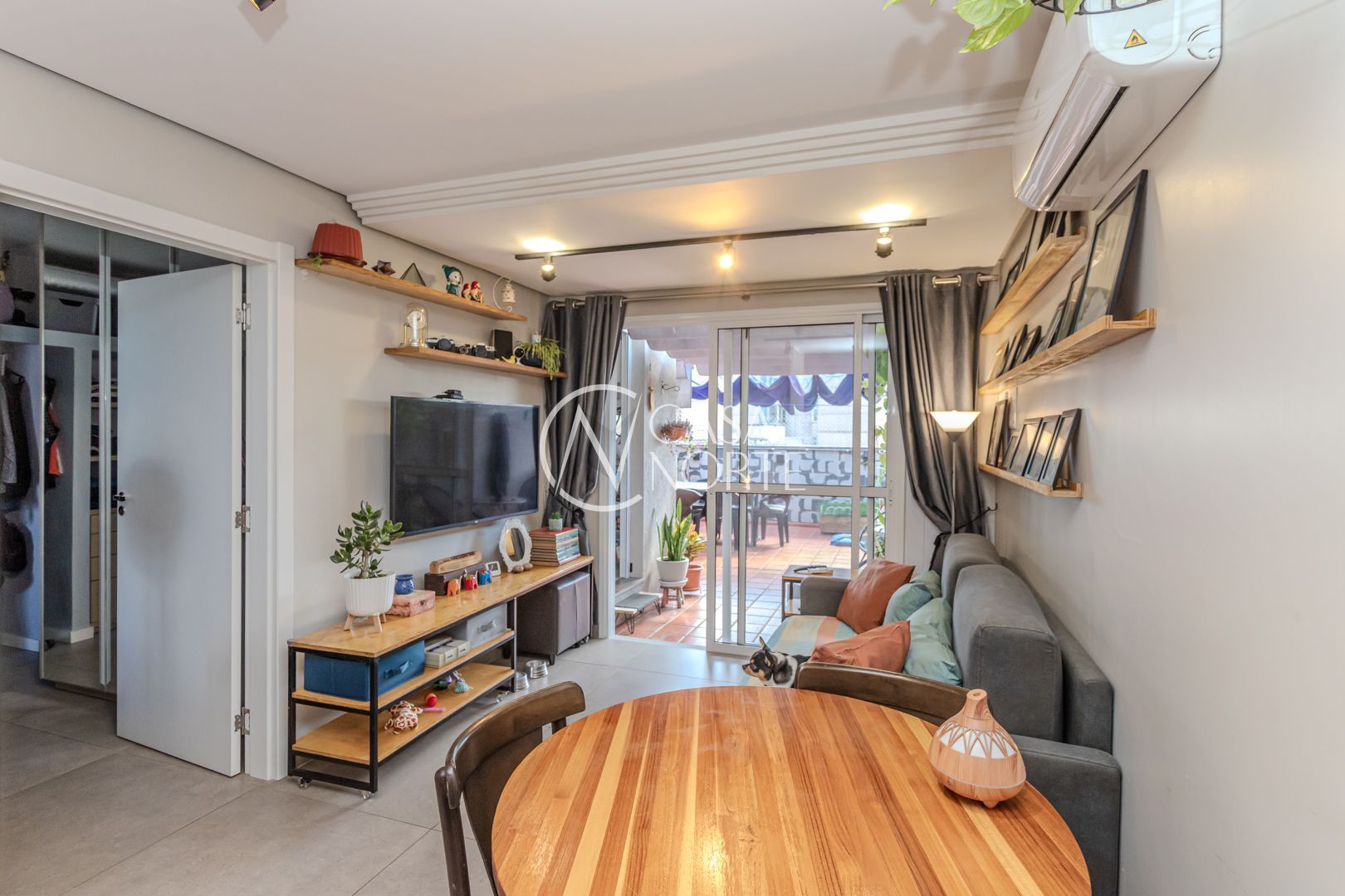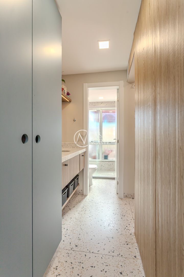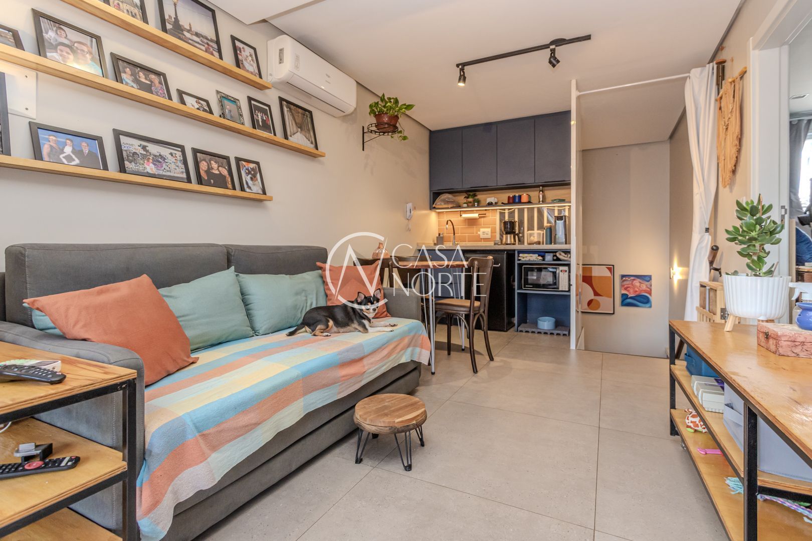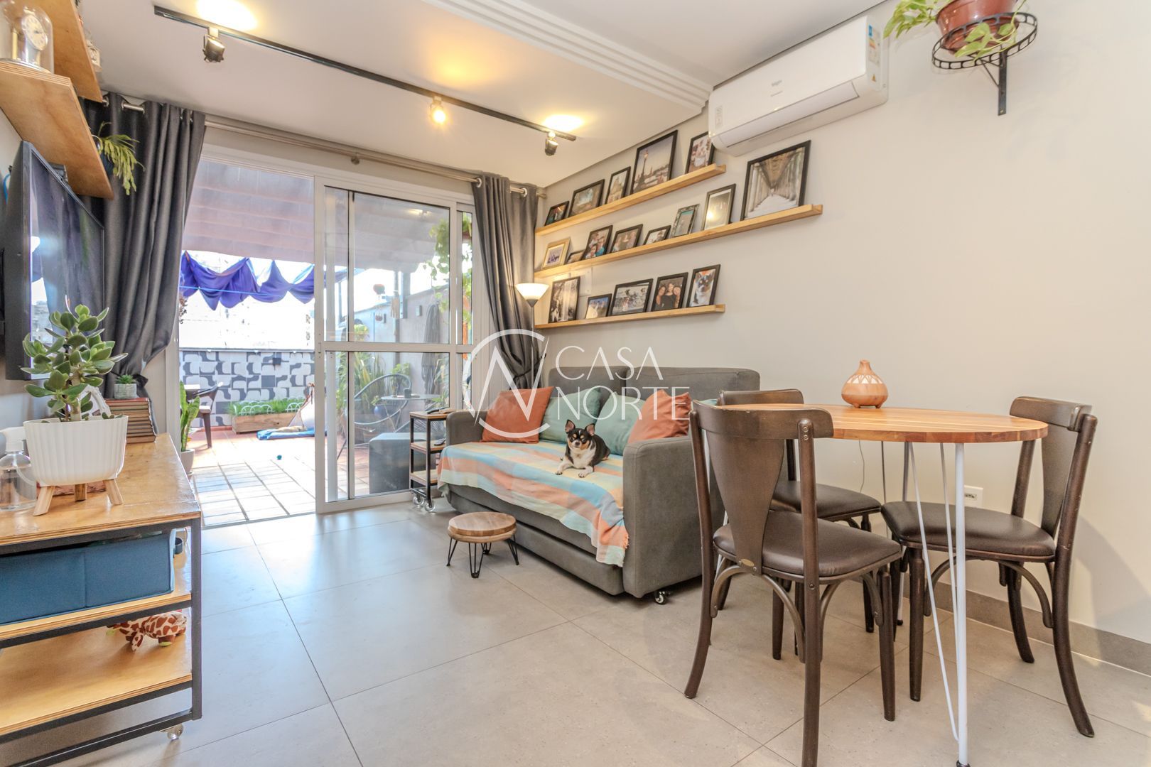 Cozinha planejada integrada à ampla sala utilizada como Estudio. Quarto com móveis sob medida no segundo piso. Sala integrada à copa e ao terraço na cobertura. Instaladas janelas anti-ruído.