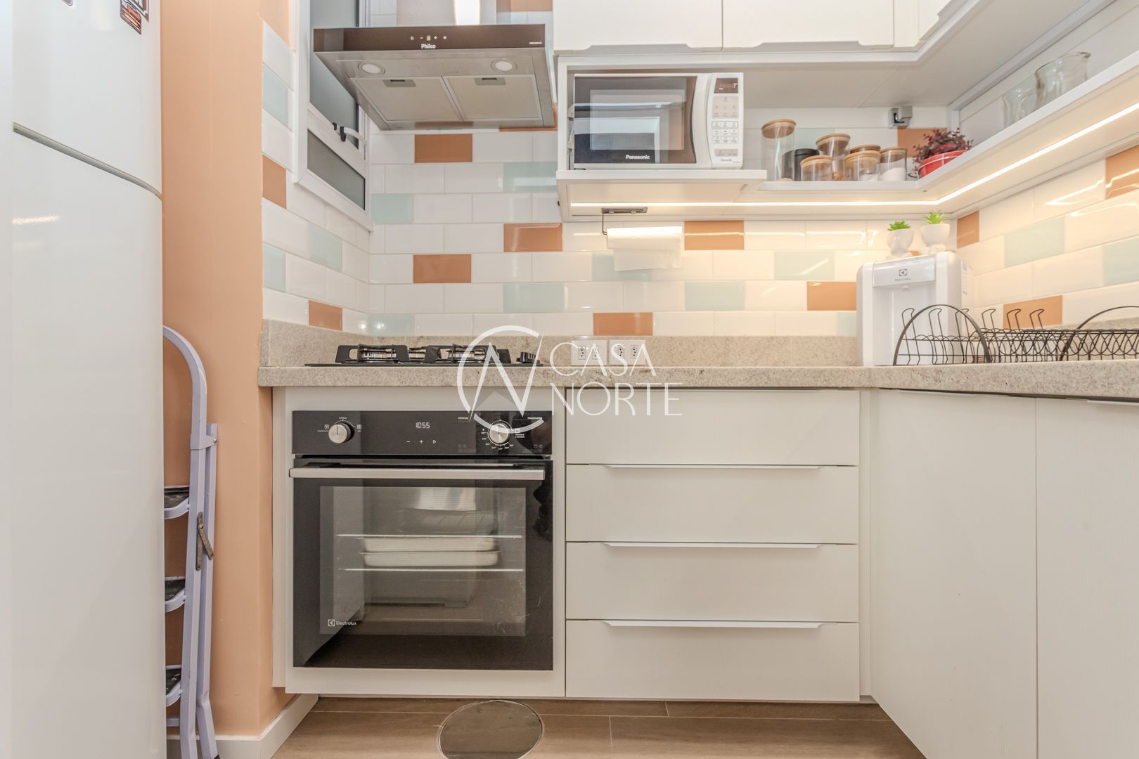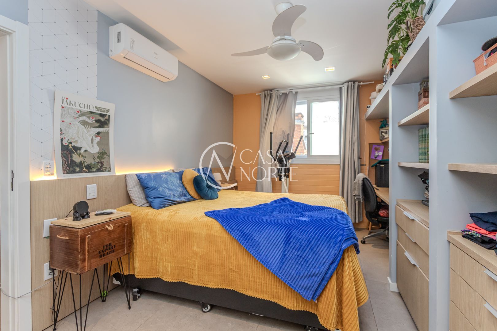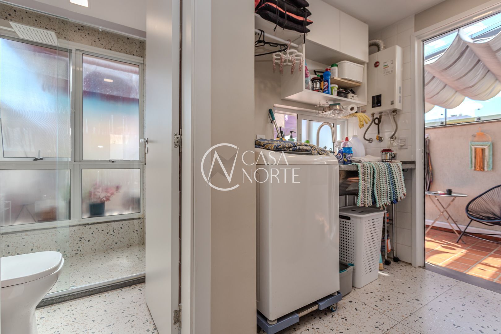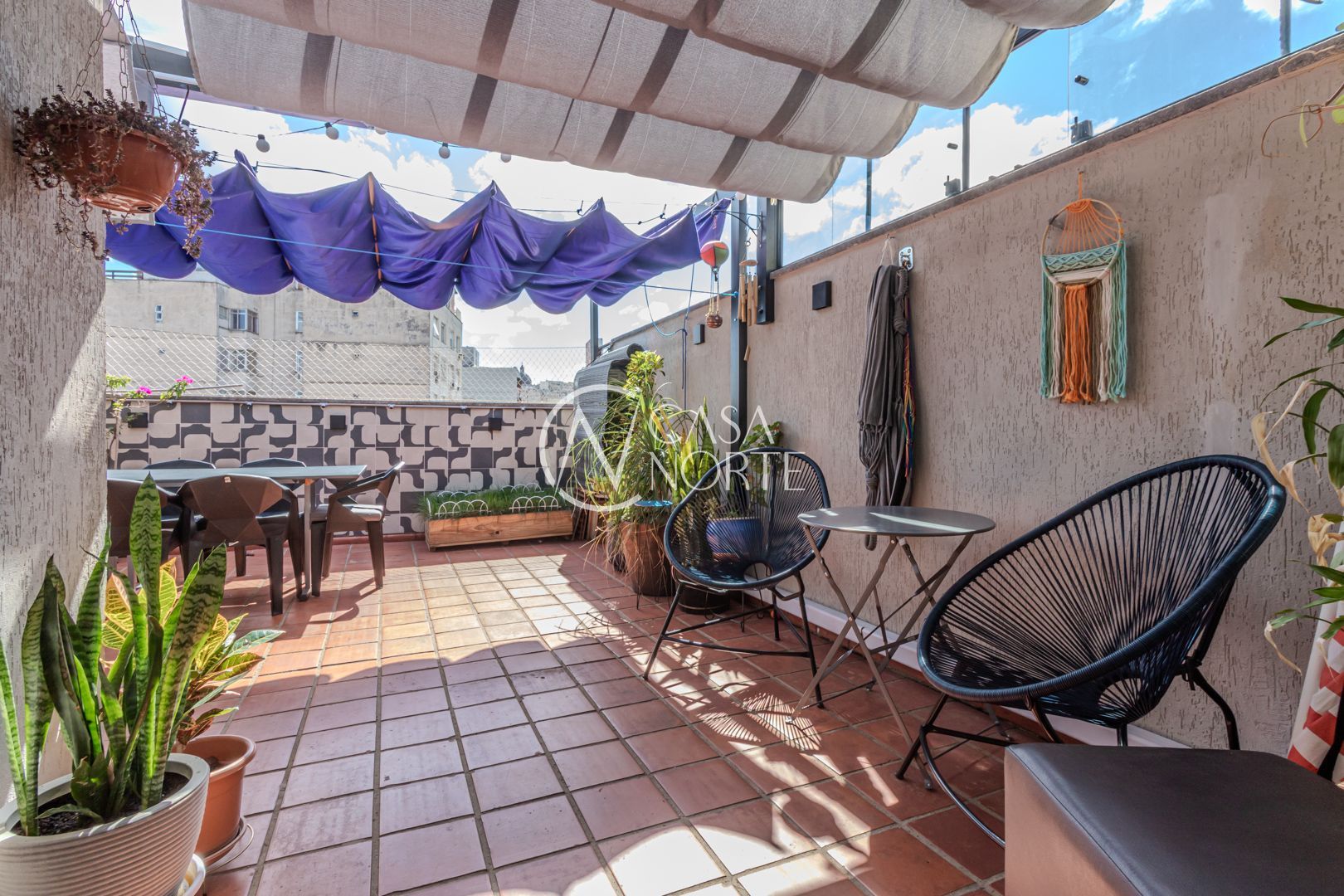 Cozinha planejada integrada à ampla sala utilizada como Estudio. Quarto com móveis sob medida no segundo piso. Sala integrada à copa e ao terraço na cobertura. Instaladas janelas anti-ruído.