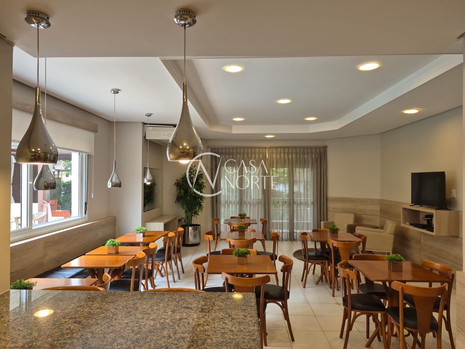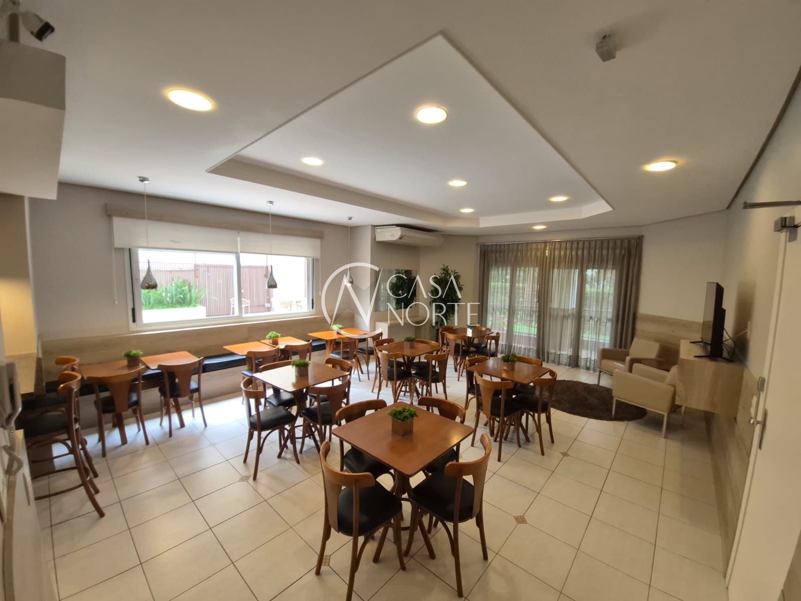 O living possui 2 ambientes, lareira a lenha, lavabo e uma charmosa churrasqueira, ideal para receber amigos e familiares. O apartamento está completamente mobiliado e dispõe de ar-condicionado em todas as peças.