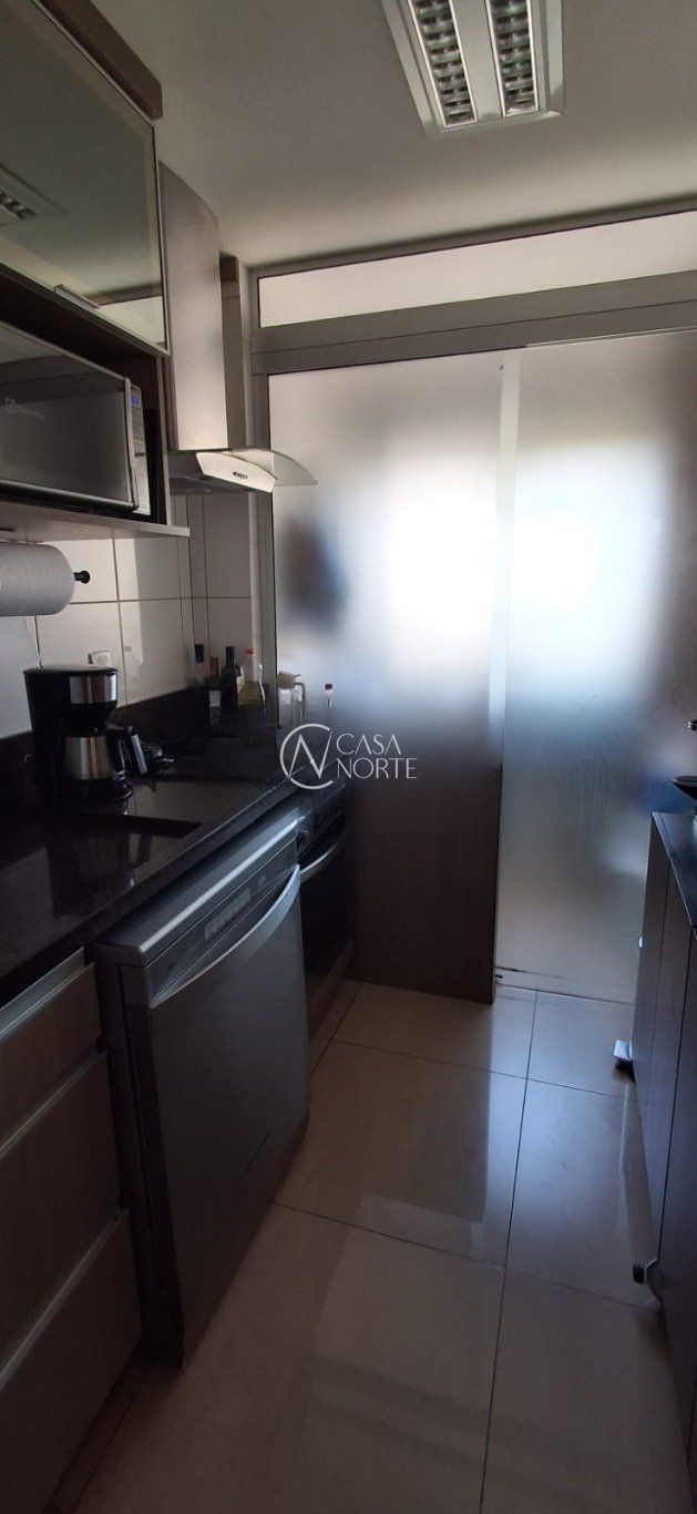 A cozinha é ampla, arejada e bem iluminada, equipada com móveis planejados e piso em cerâmica, com lavanderia integrada e janela grande que garante excelente ventilação e luz natural.