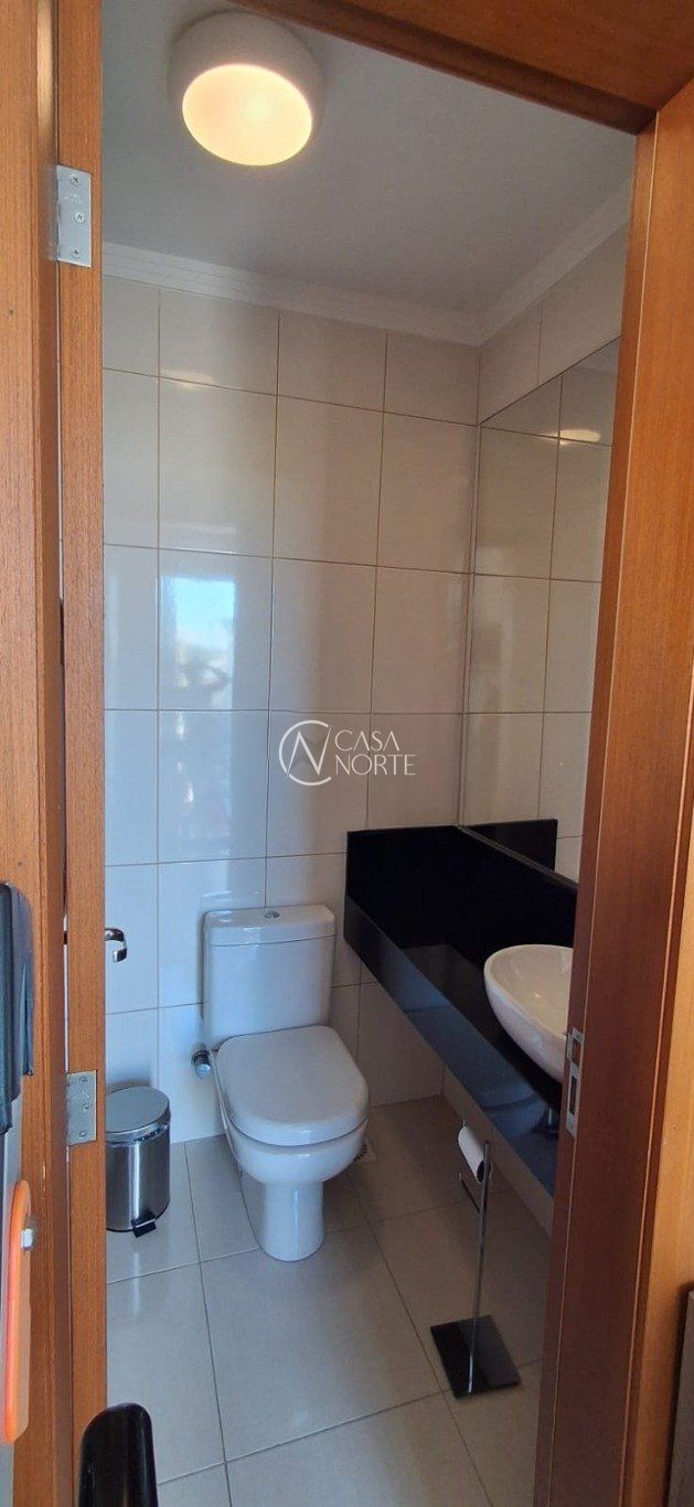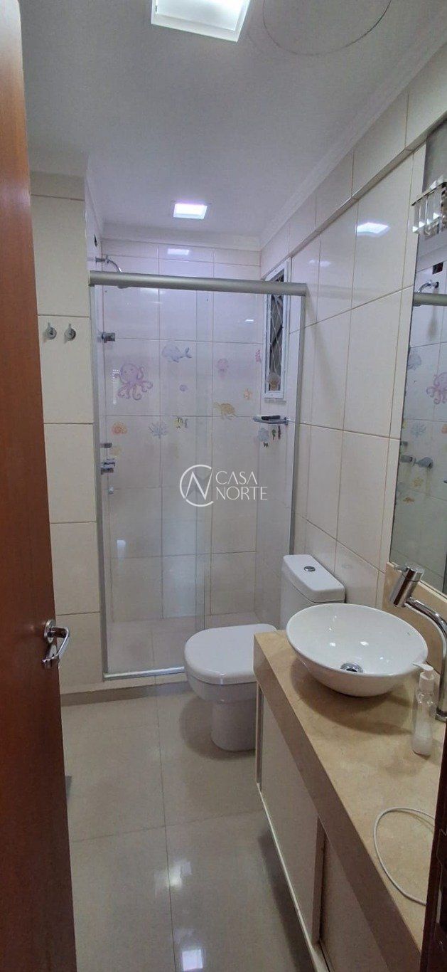 O banheiro social é totalmente revestido em cerâmica, possui box de vidro e janela externa, garantindo ótimo arejamento.