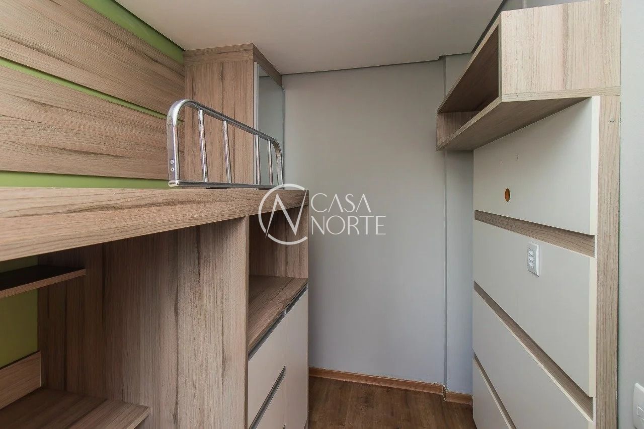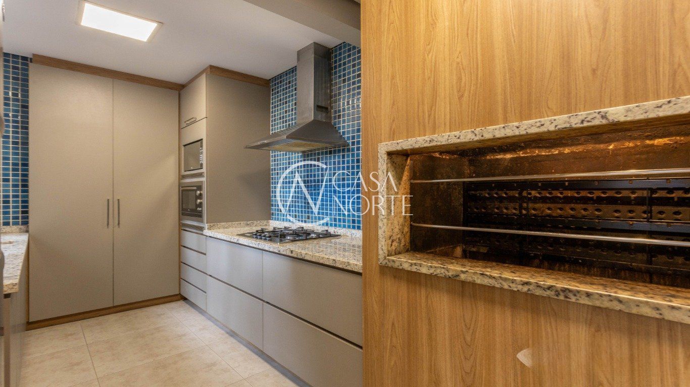 Cozinha com móveis planejados. O antigo espaço destinado à cozinha e à área de serviço foi transformado em dois dormitórios, que podem facilmente retornar à configuração original de cozinha com área de serviço ou ser adaptados para uma terceira suíte, aproveitando o banheiro de serviço existente no ambiente.