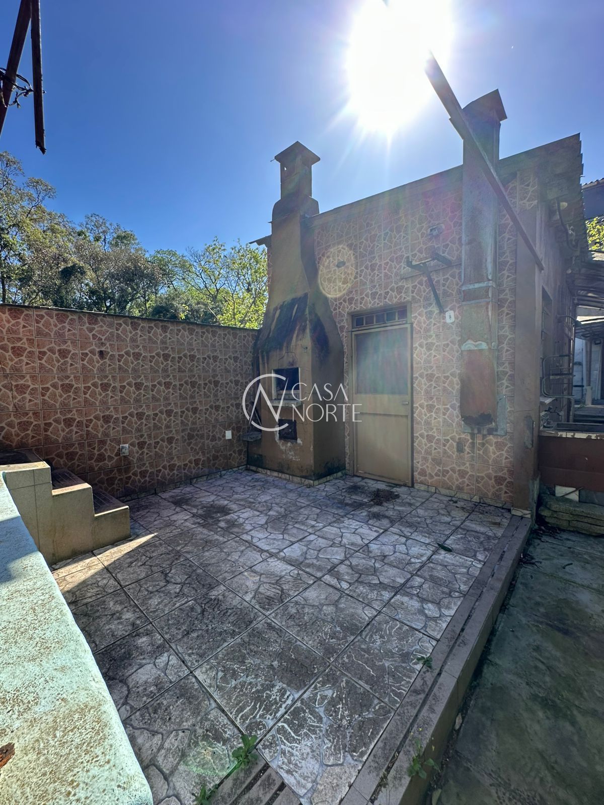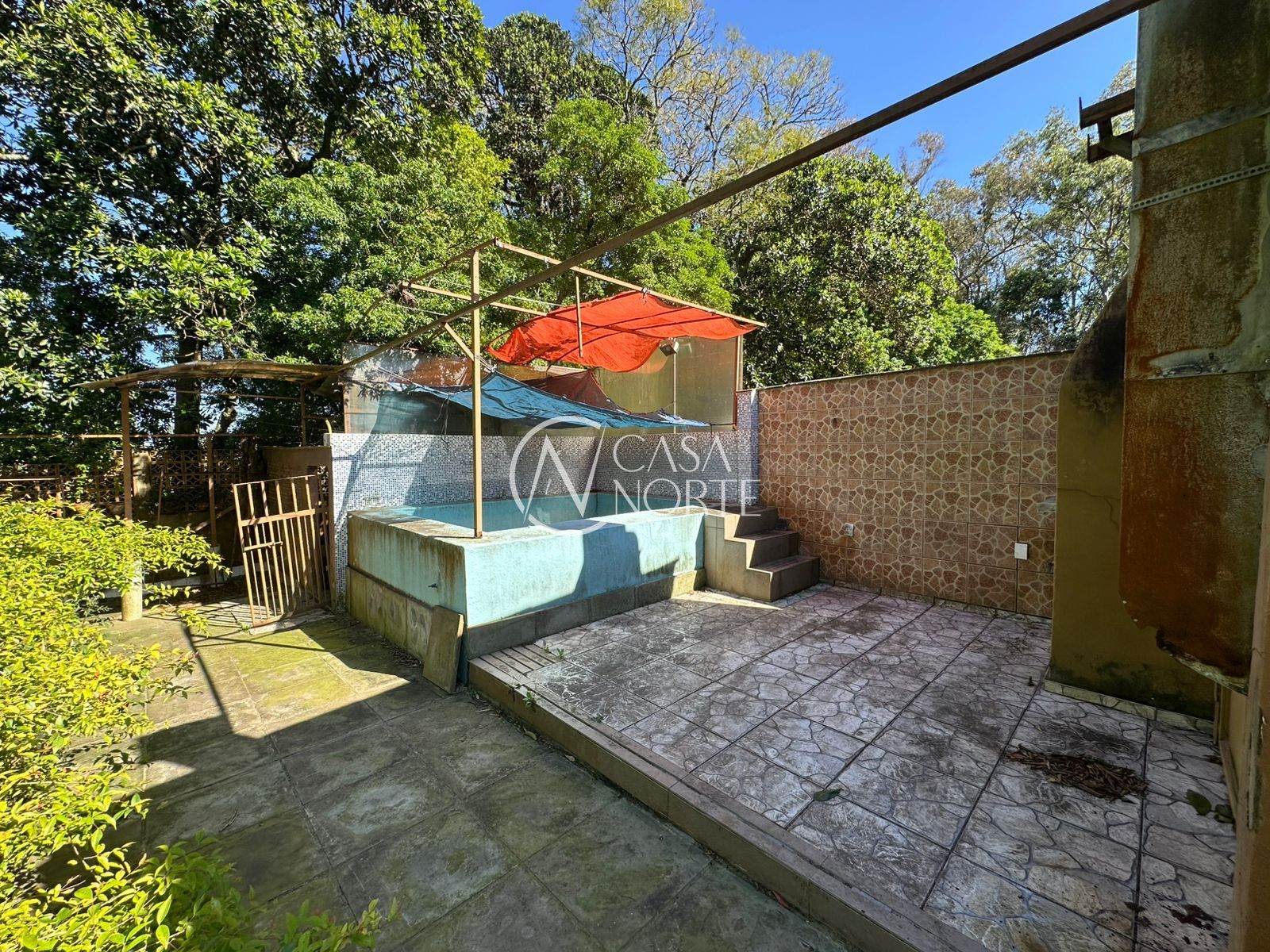 Área externa com jardim, churrasqueira, piscina e vista panorâmica.