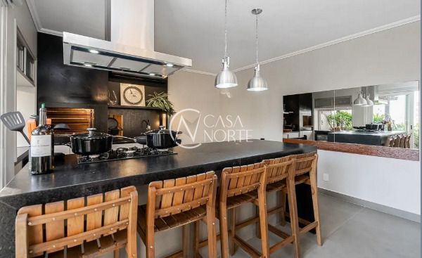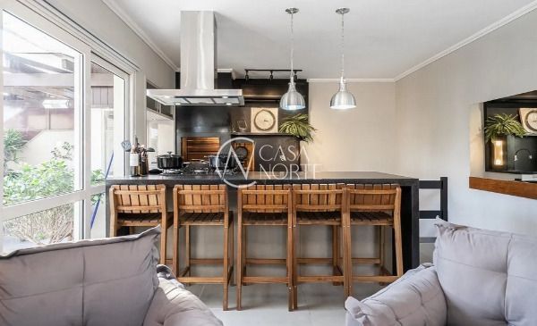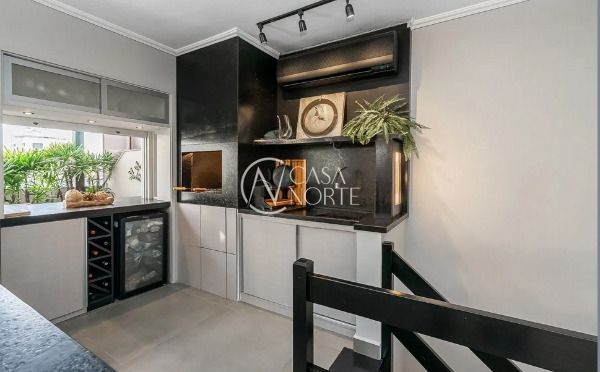 O andar superior é um verdadeiro espaço de lazer, com sala de estar, lareira, ilha gourmet com churrasqueira, lavabo, terraço e piscina, perfeito para receber amigos e aproveitar momentos especiais.