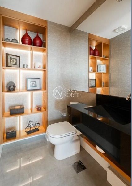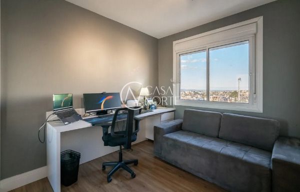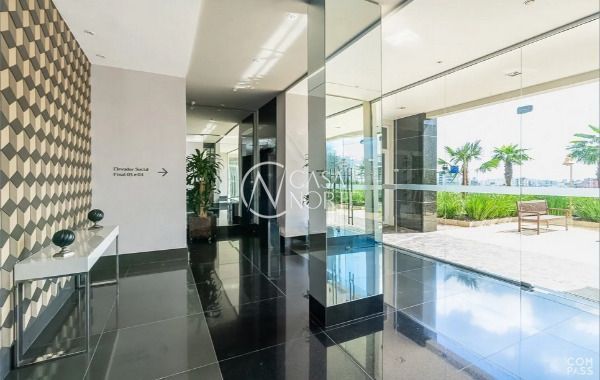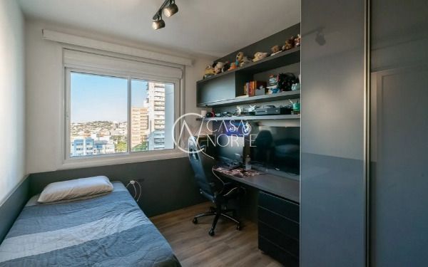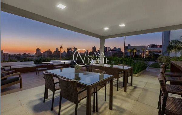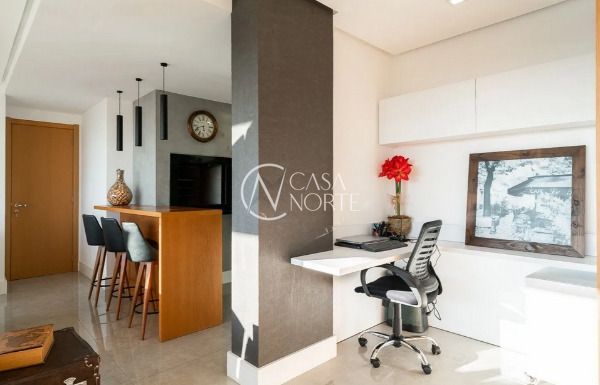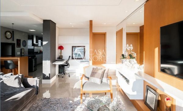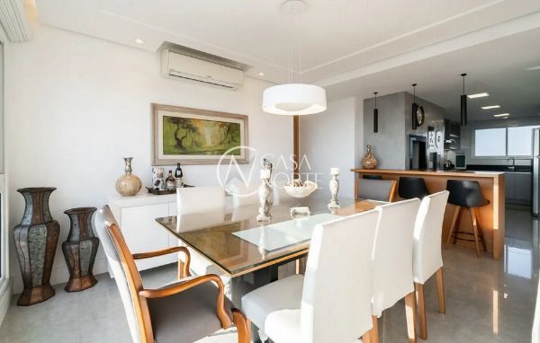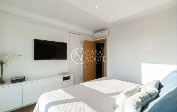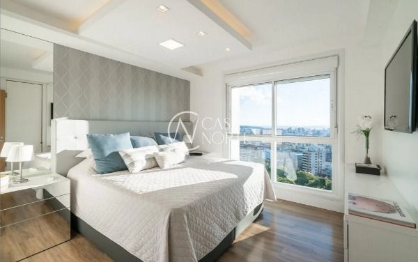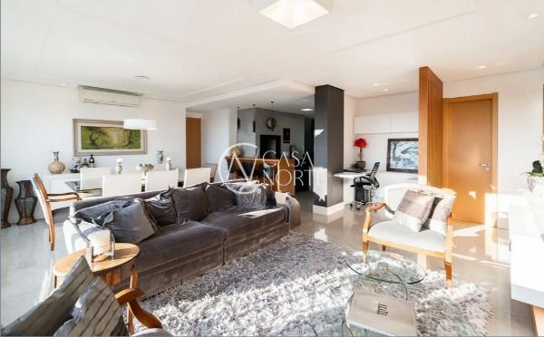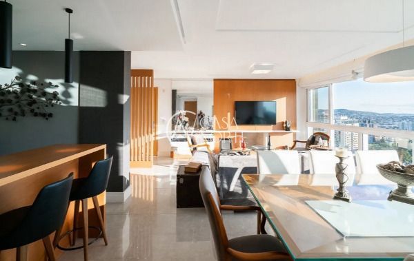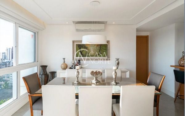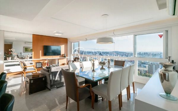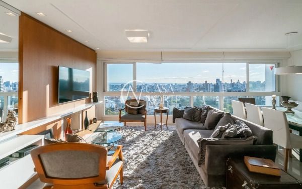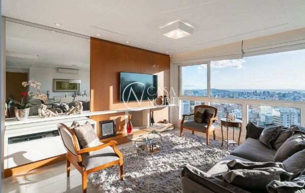 Apartamento semimobiliado em andar alto, com uma vista incrível para o Guaíba e o pôr do sol. São 126m² de área privativa, distribuídos em um living amplo com janelão, lareira, churrasqueira e lavabo. A cozinha é separada da área de serviço, garantindo mais organização e praticidade. A planta inteligente aproveita cada espaço com funcionalidade.