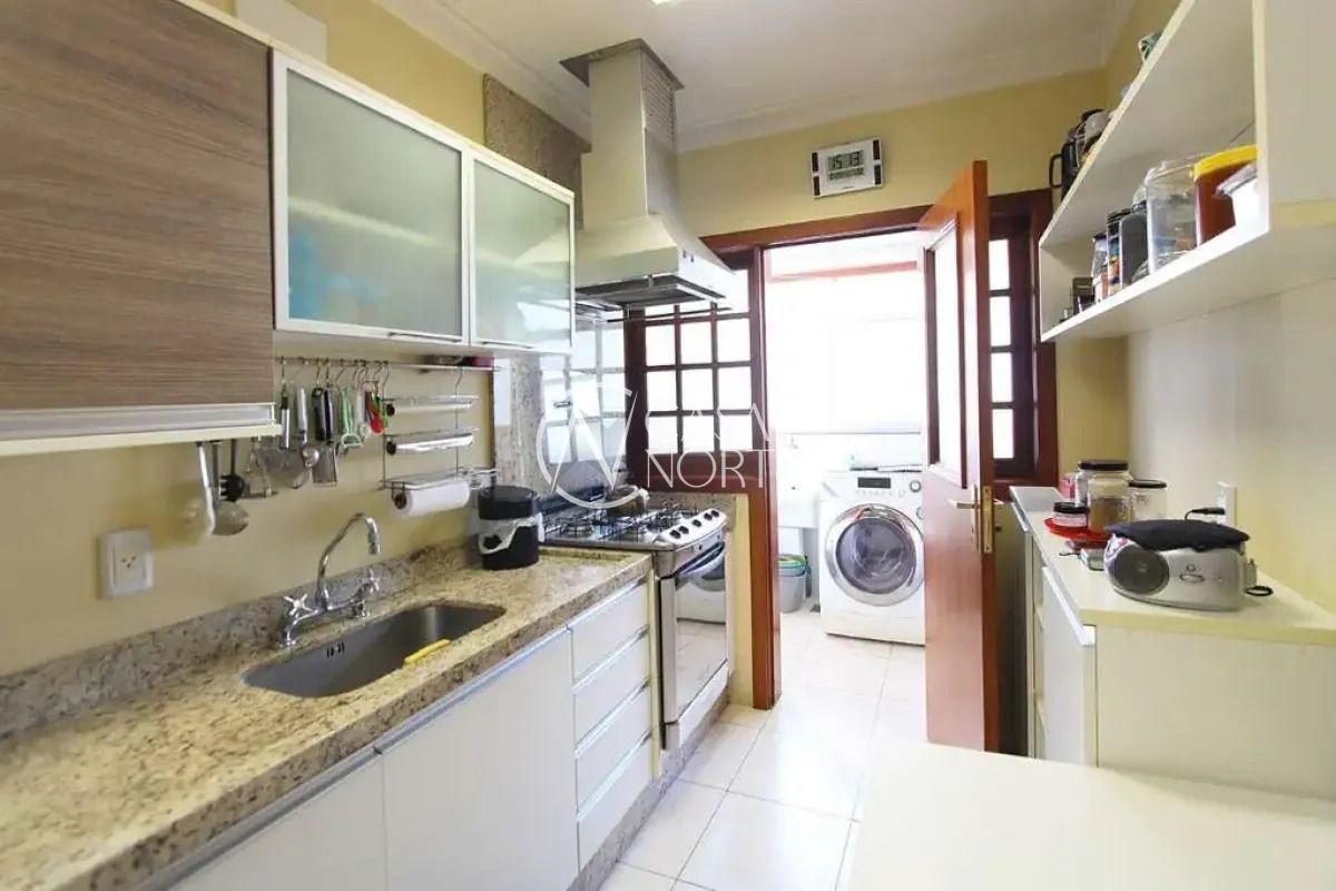 A cozinha mobiliada, com acesso à área de serviço separada, além de dependência completa de empregada. O imóvel dispõe ainda de lavabo, despensa e armários planejados em diversos ambientes.