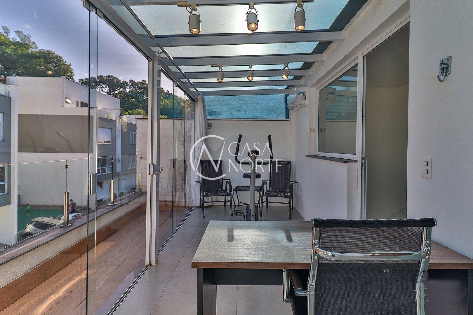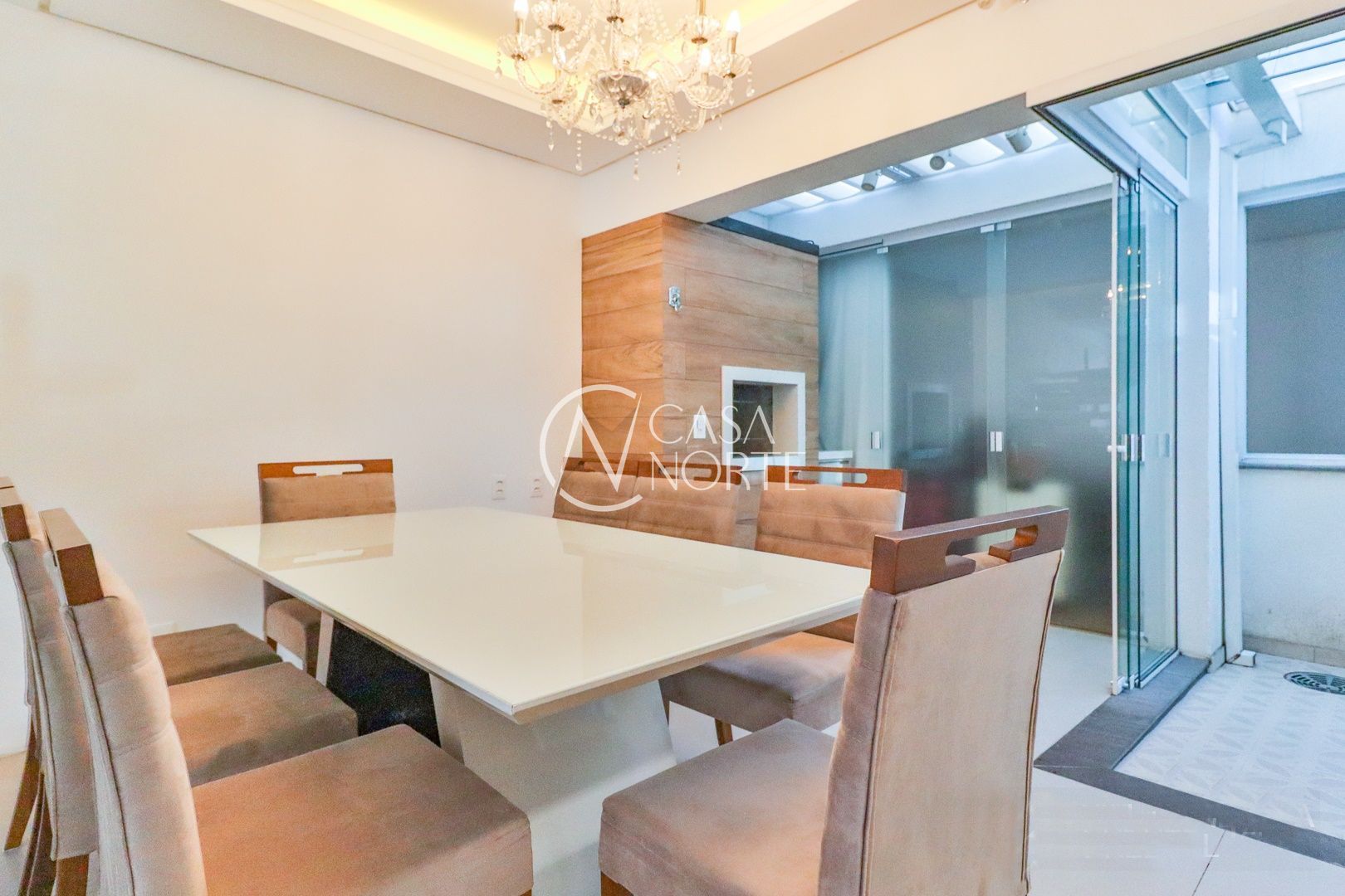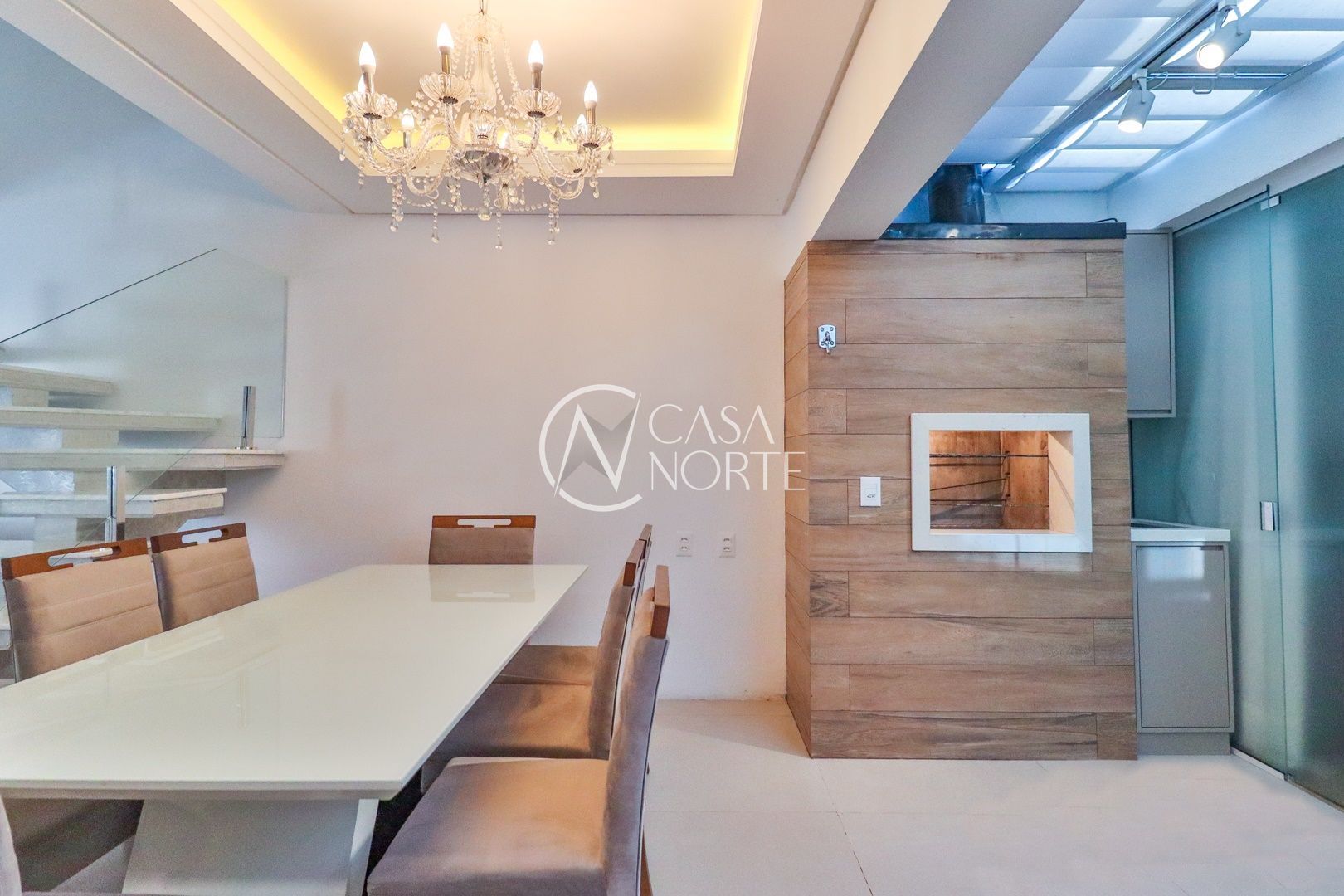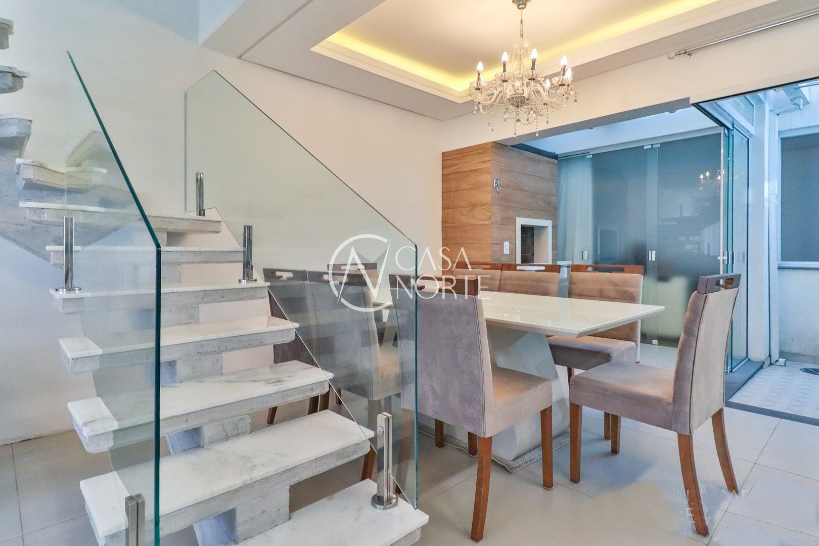 Primeiro pavimento conta com sala de estar, jantar, churrasqueira, lavabo, cozinha, área de serviço com telhado retrátil transparente e a suíte.