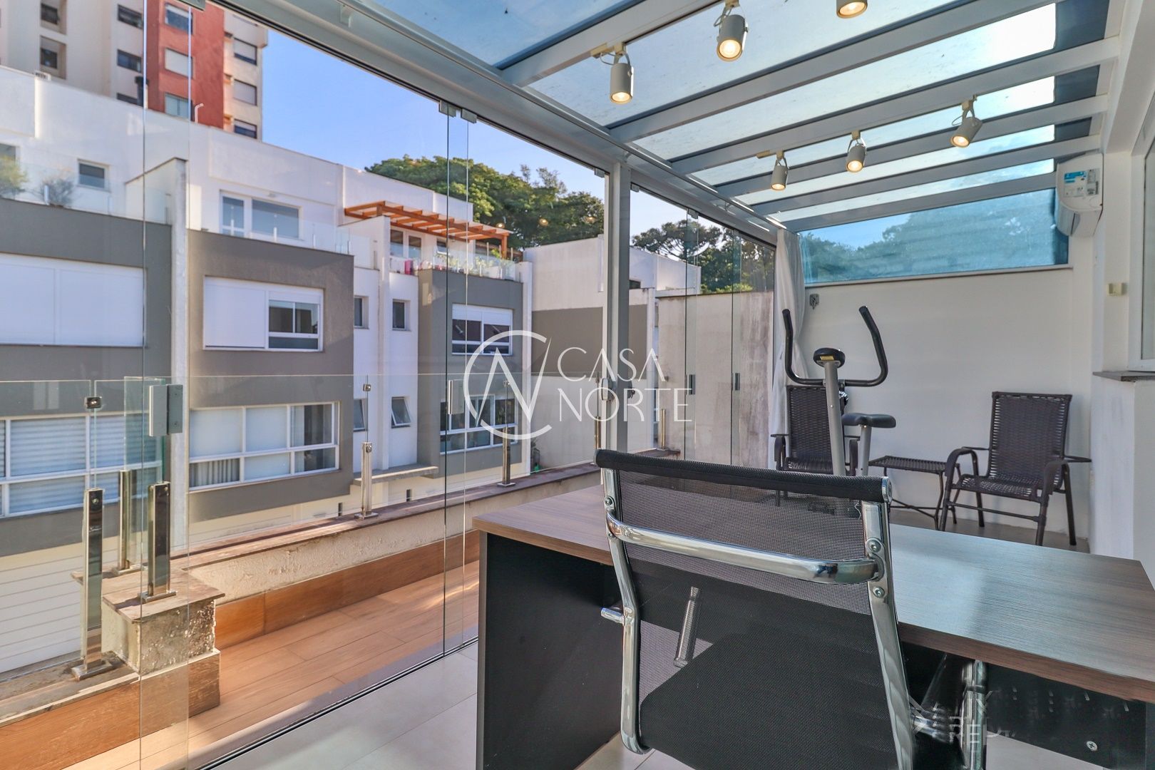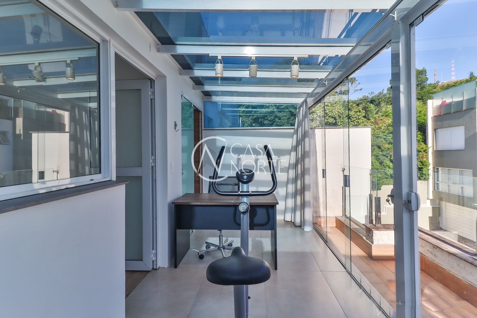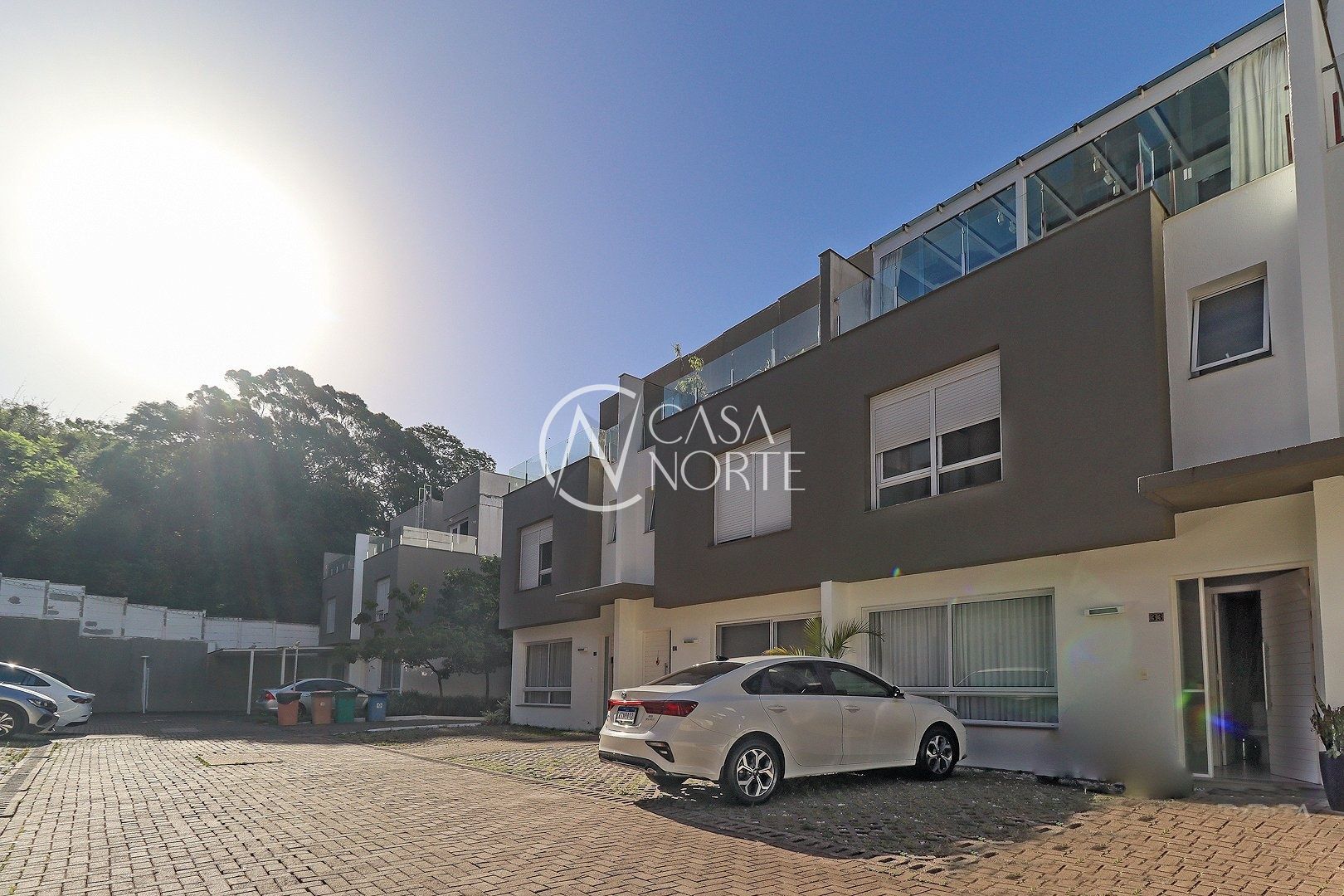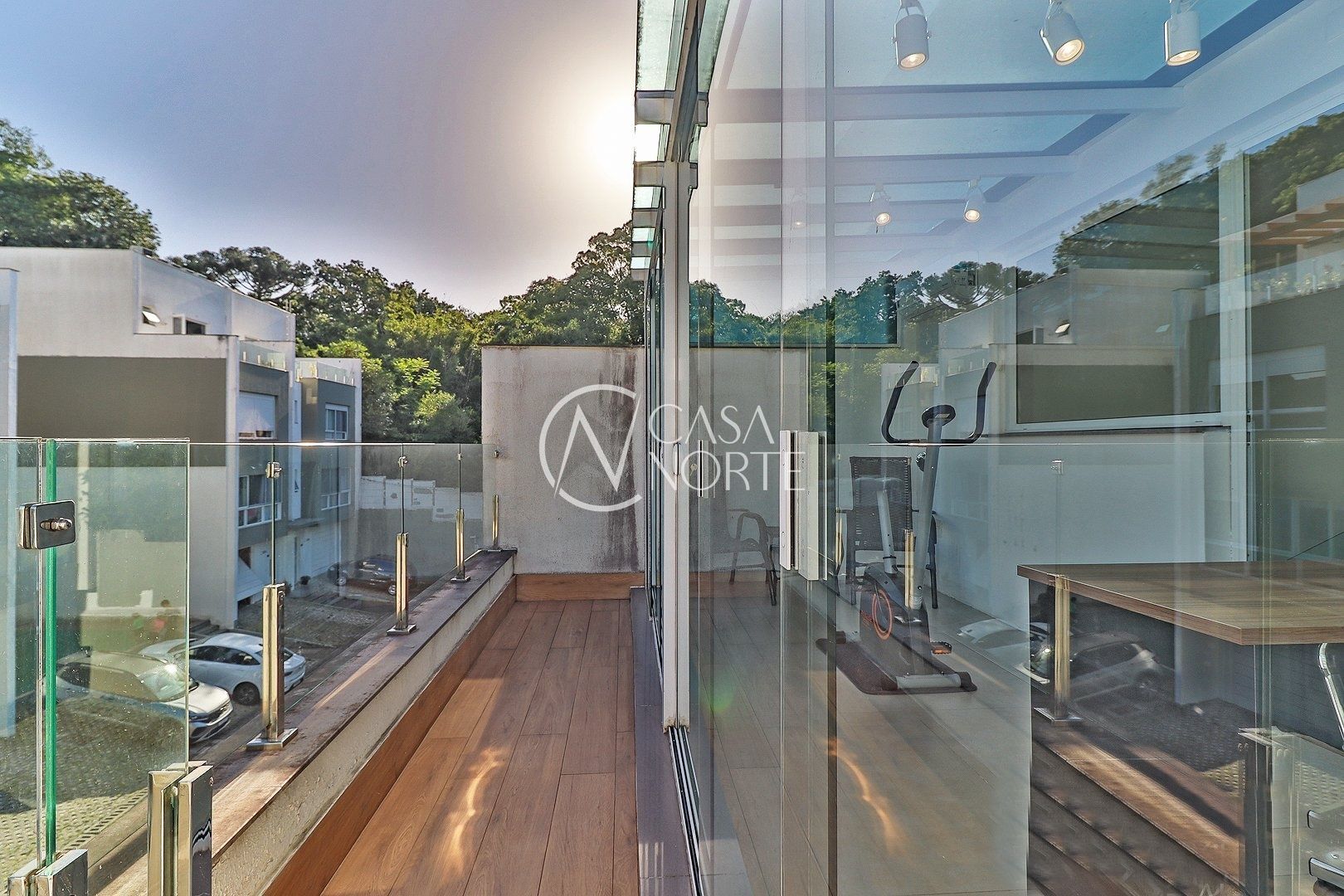 Primeiro pavimento conta com sala de estar, jantar, churrasqueira, lavabo, cozinha, área de serviço com telhado retrátil transparente e a suíte.