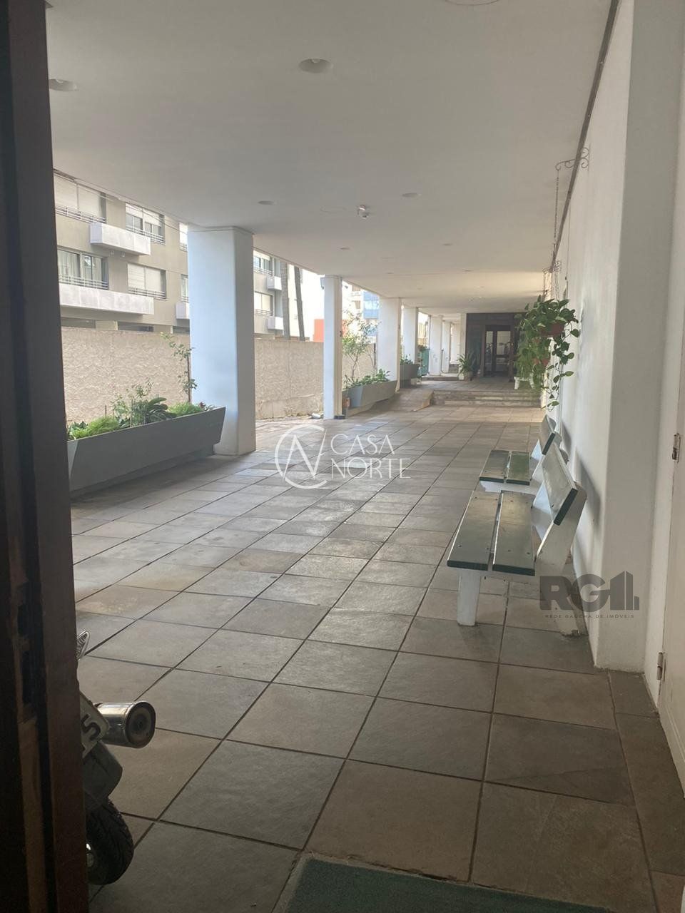 Prédio com elevador, área de uso comum jardinada, salão de festas e bicicletário.
