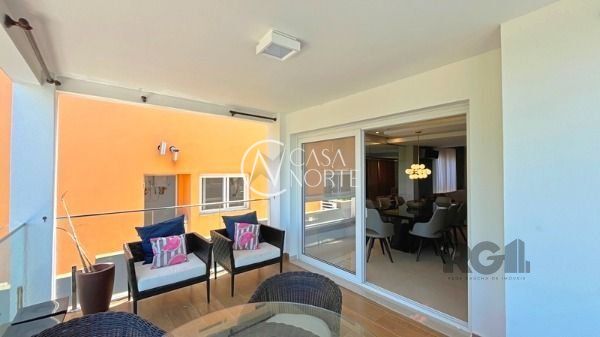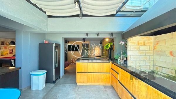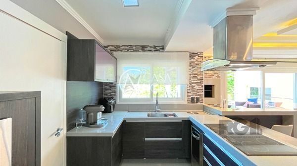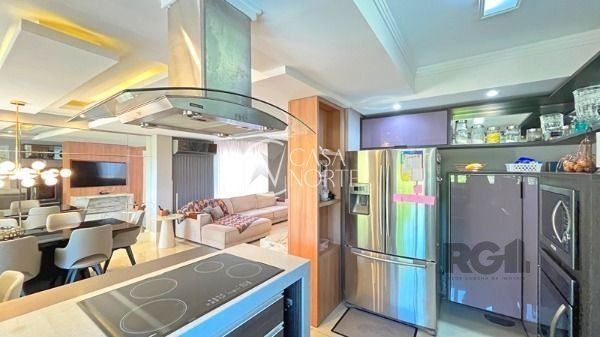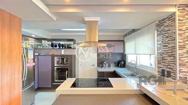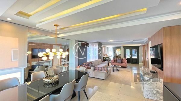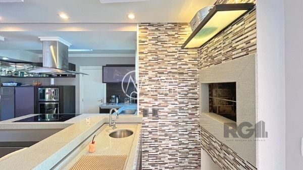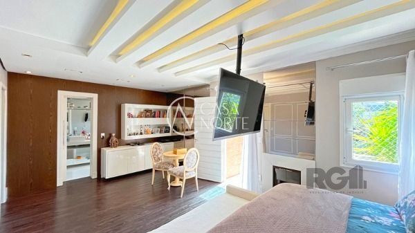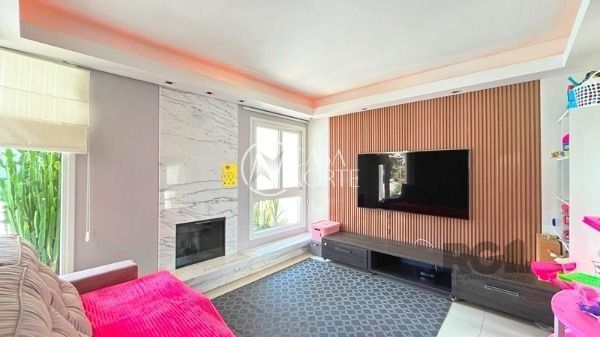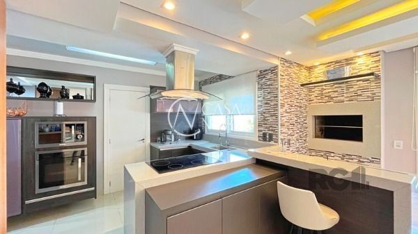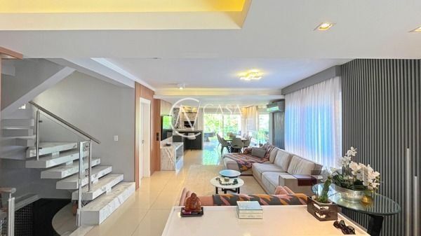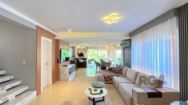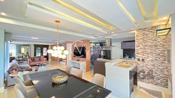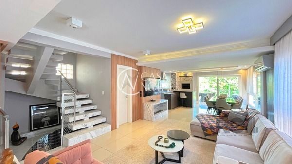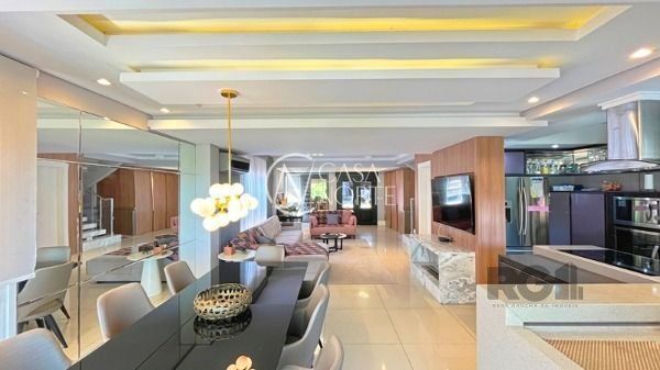 O living com 103m² possui três ambientes bem definidos e conta com lareira e churrasqueira. A cozinha estilo americana está mobiliada e equipada. Completam o espaço a lavanderia, lavabo e uma varanda com acesso a piscina.