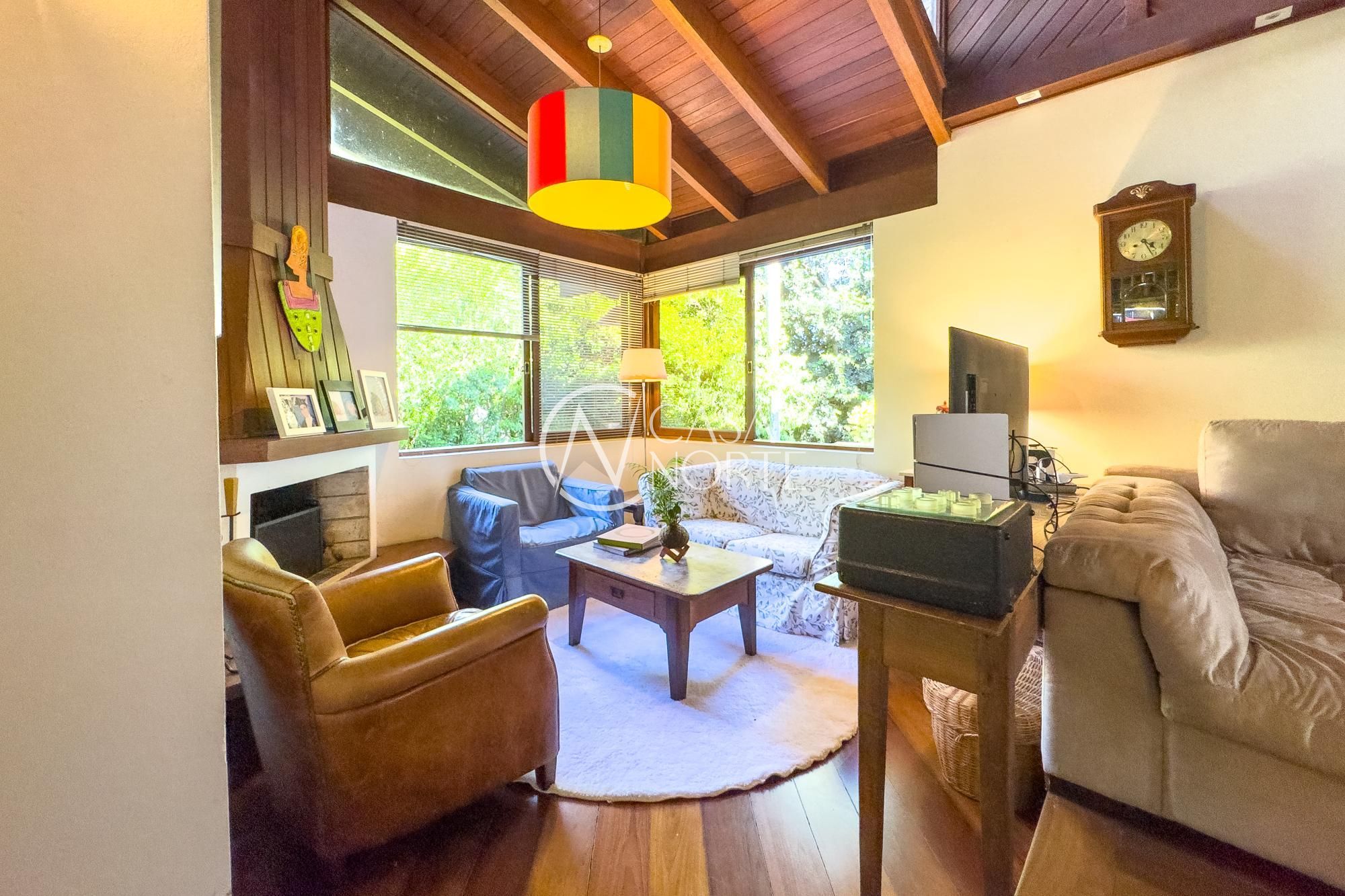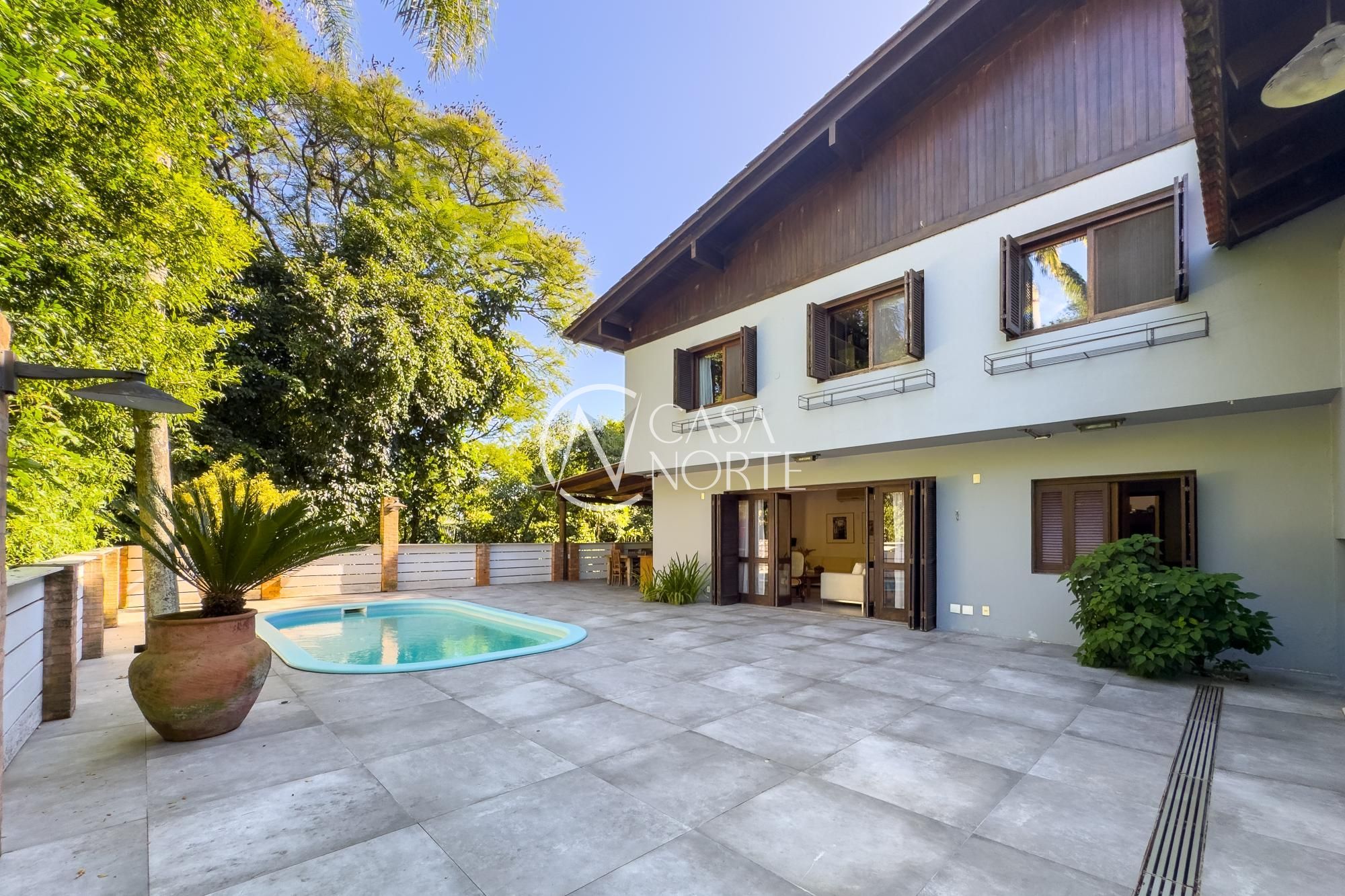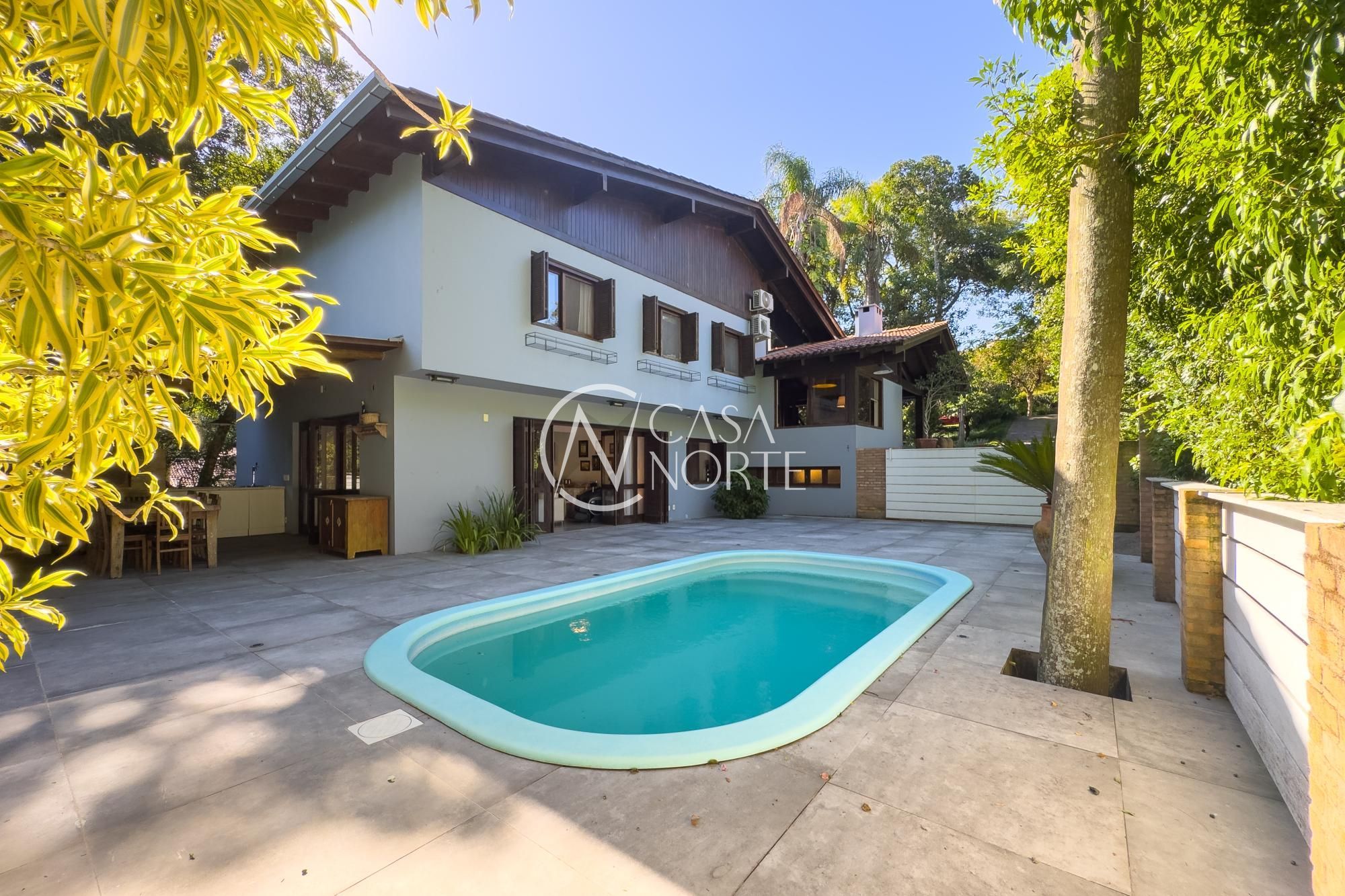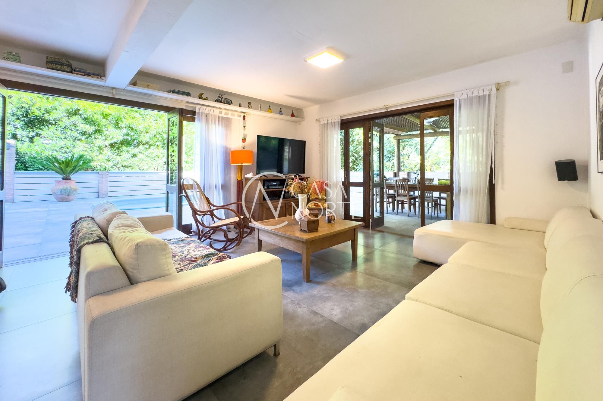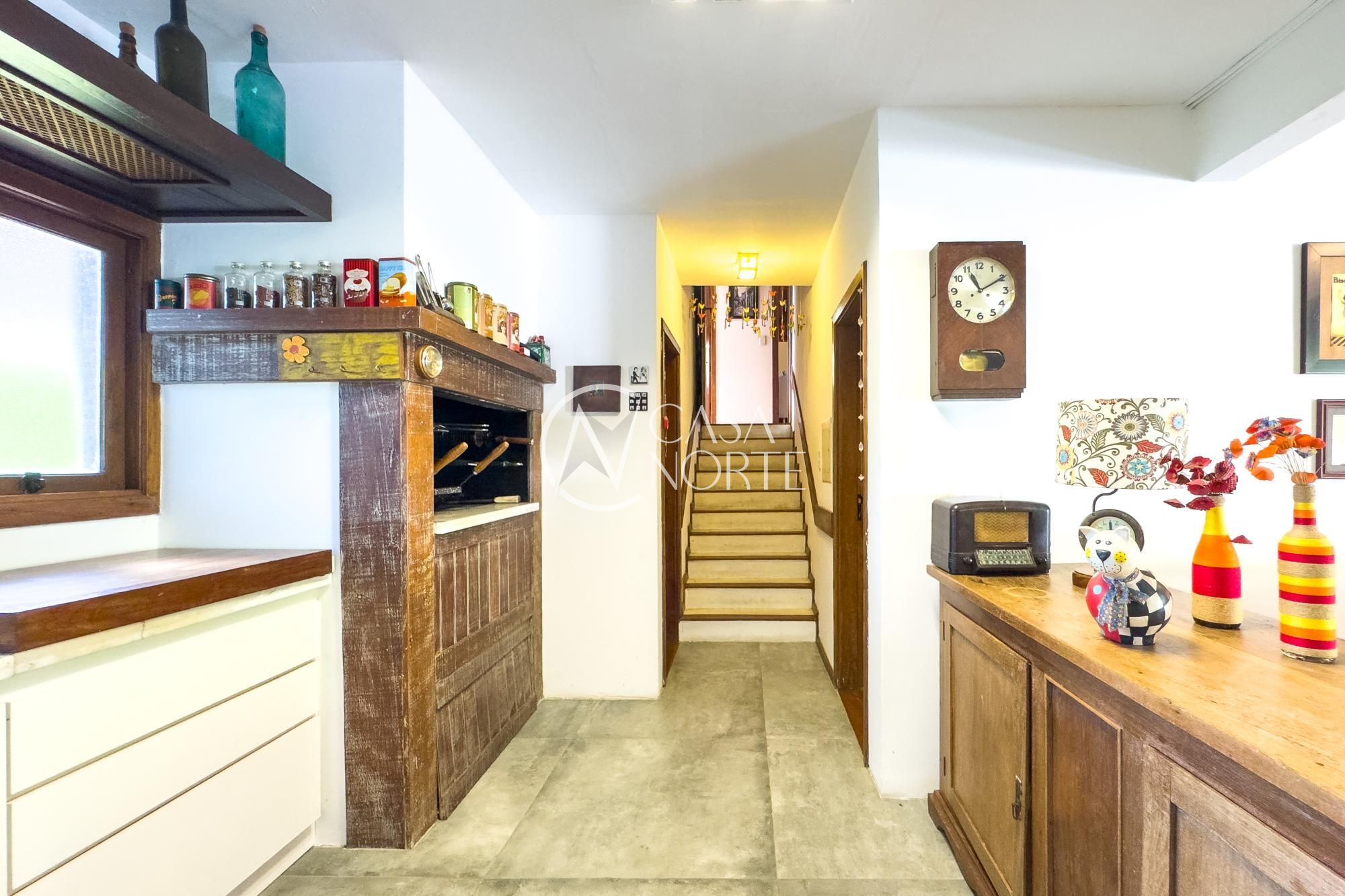 O living para dois ambientes com lareira se conecta à sala de jantar e ao lavabo. A cozinha conta com móveis planejados, lavanderia e depósito/despensa. São dois espaços gourmet, um interno e outro externo, ambos com churrasqueira e uma parrilla e chopeira, Pátio com piscina aquecida.