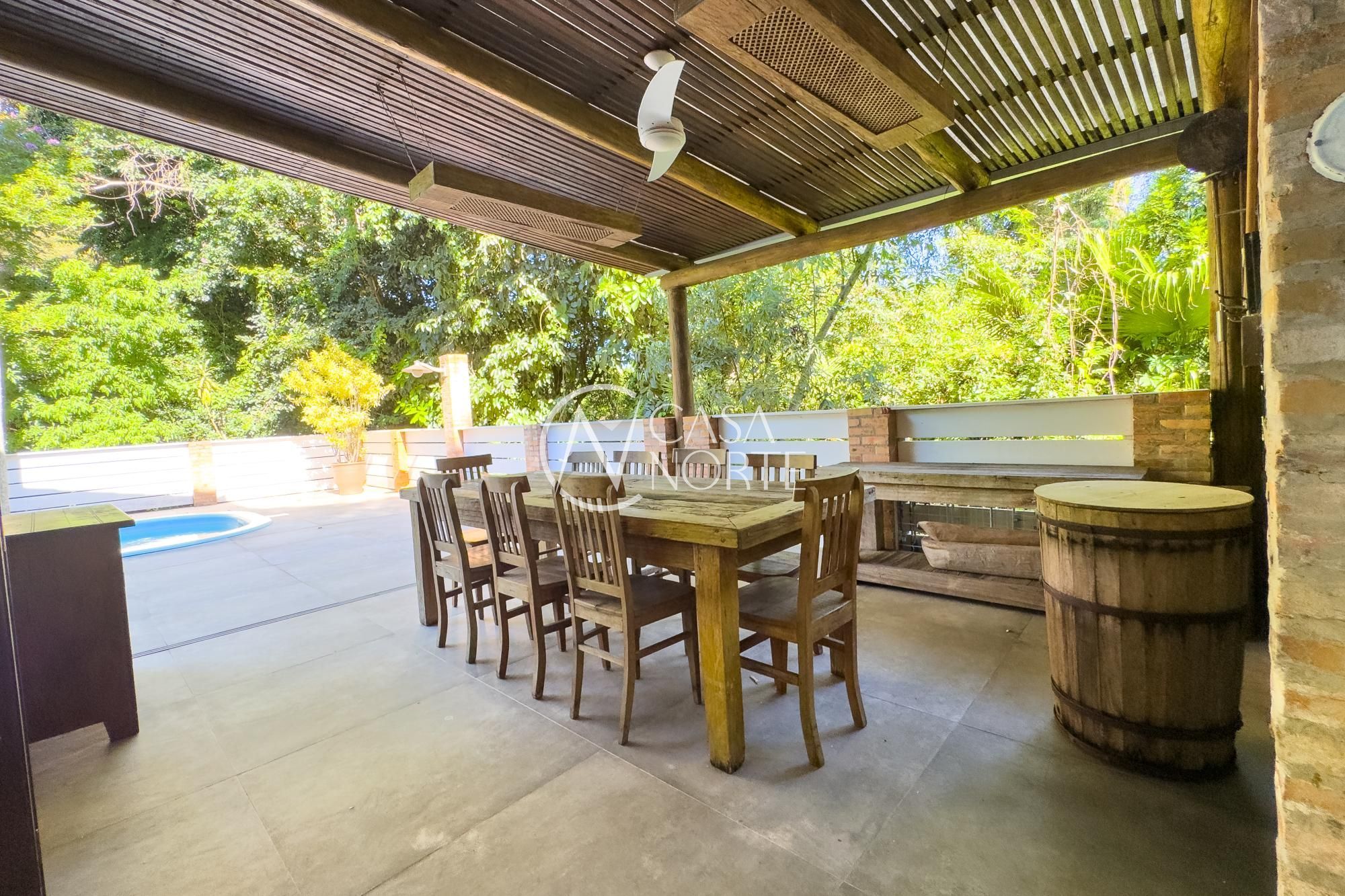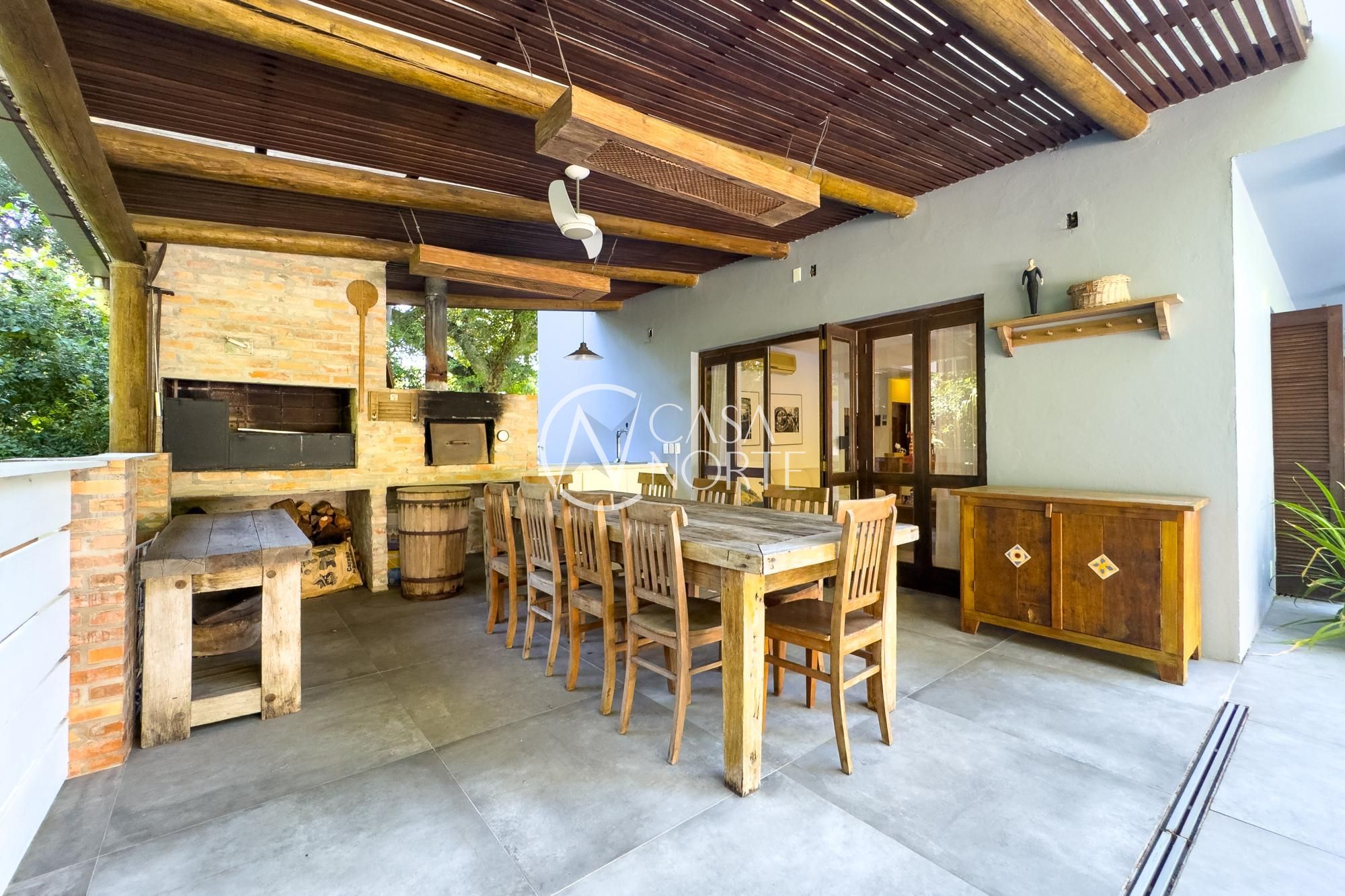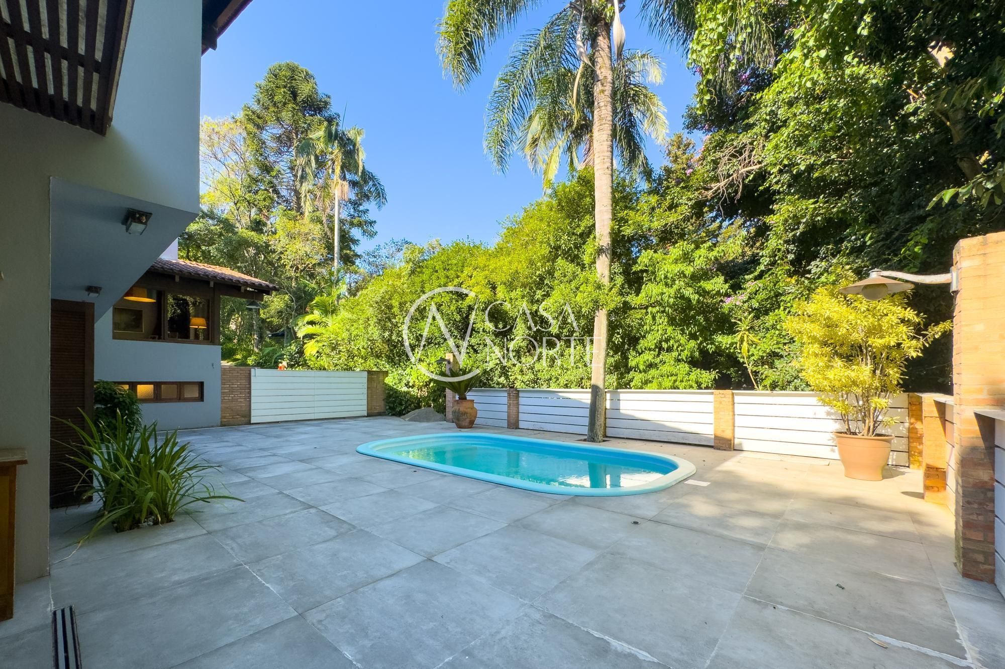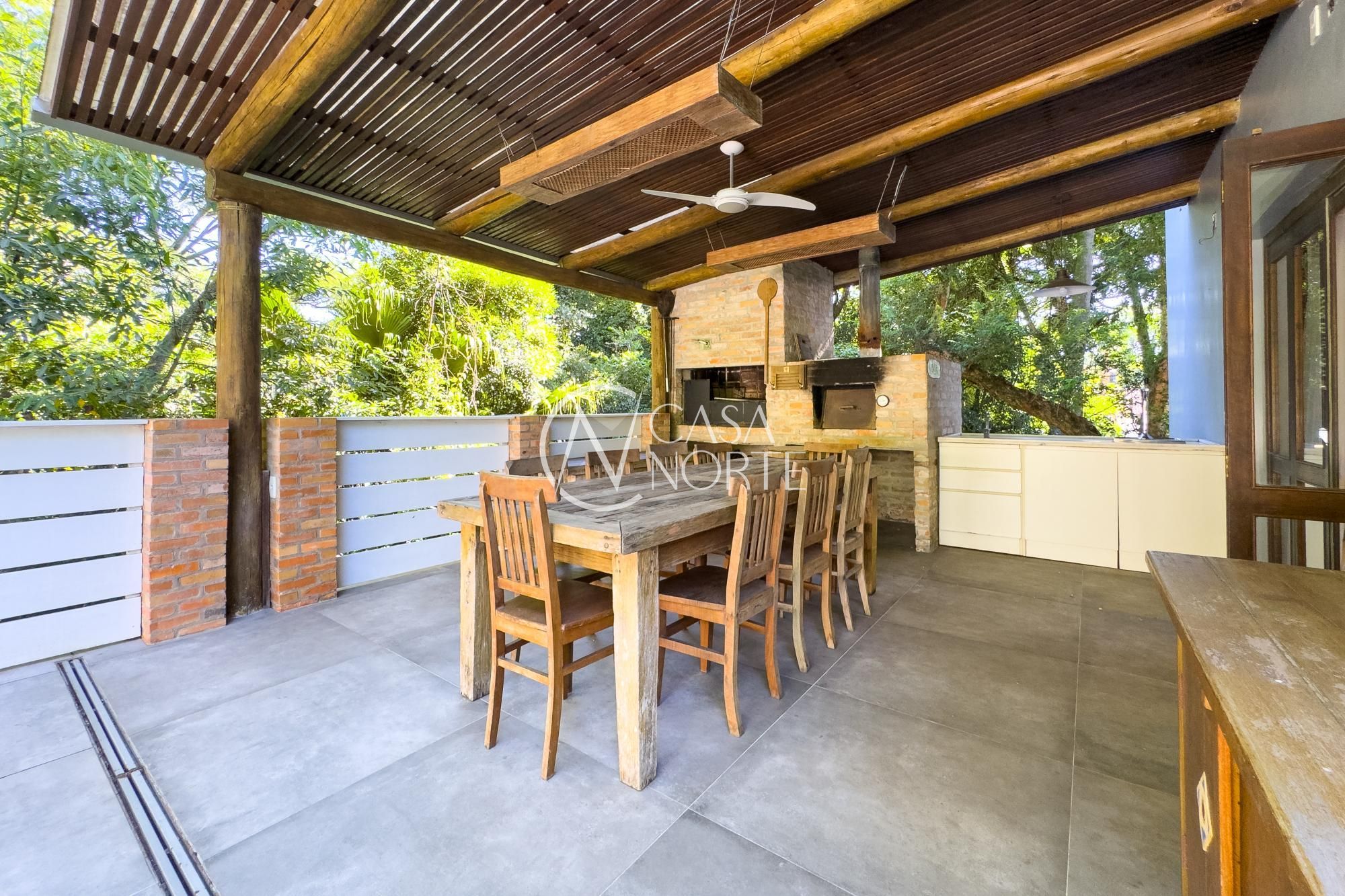 O living para dois ambientes com lareira se conecta à sala de jantar e ao lavabo. A cozinha conta com móveis planejados, lavanderia e depósito/despensa. São dois espaços gourmet, um interno e outro externo, ambos com churrasqueira e uma parrilla e chopeira, Pátio com piscina aquecida.