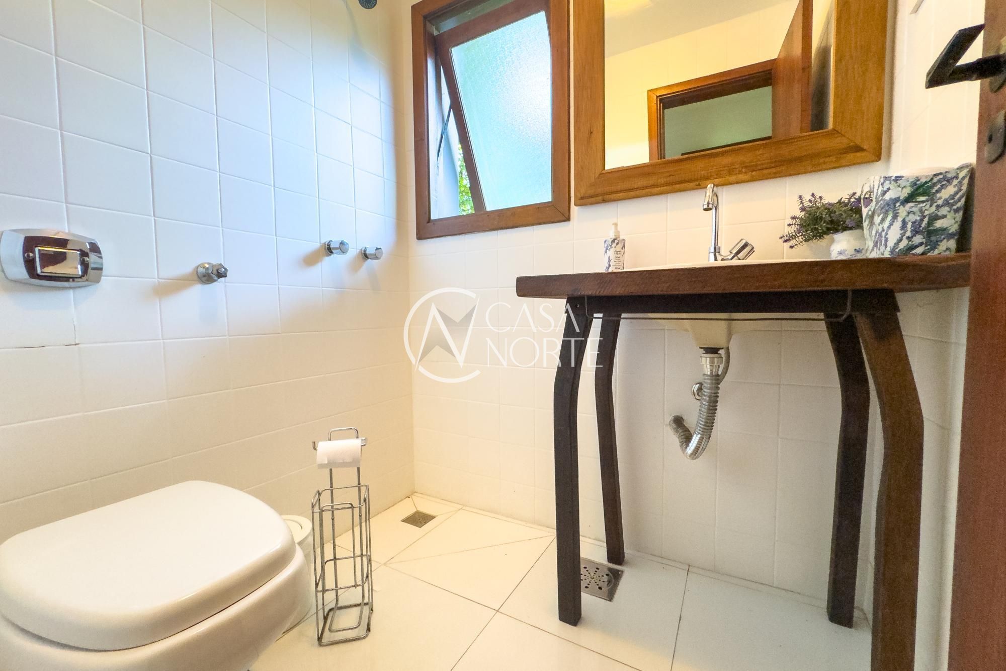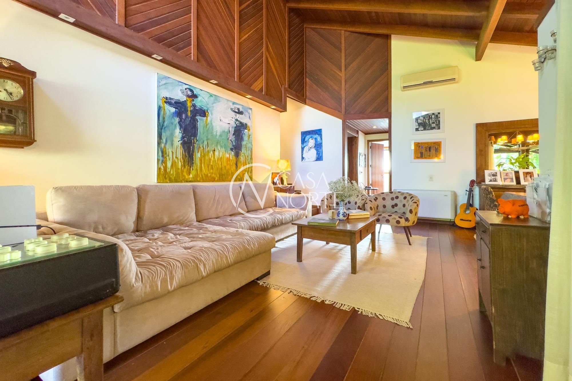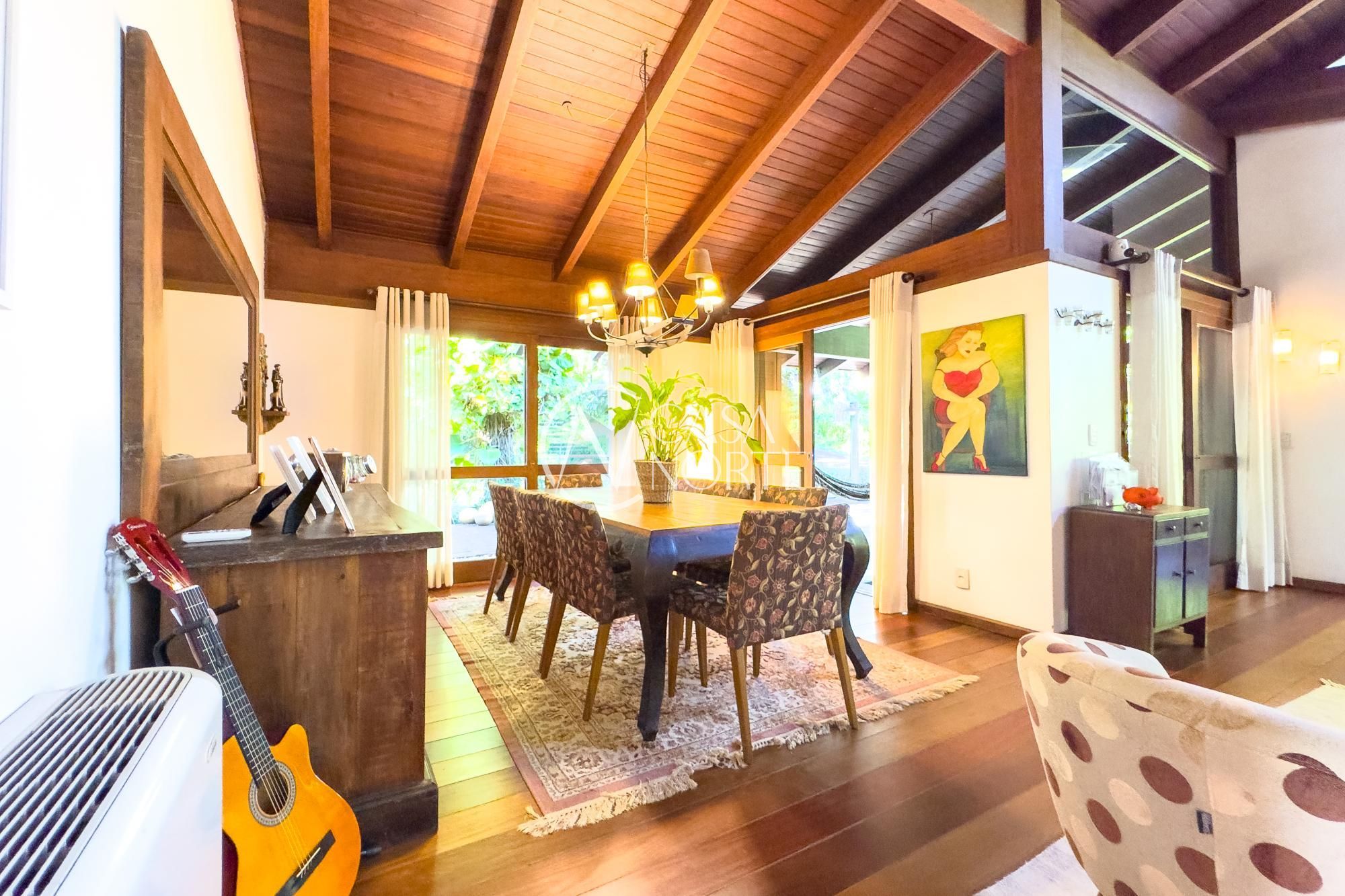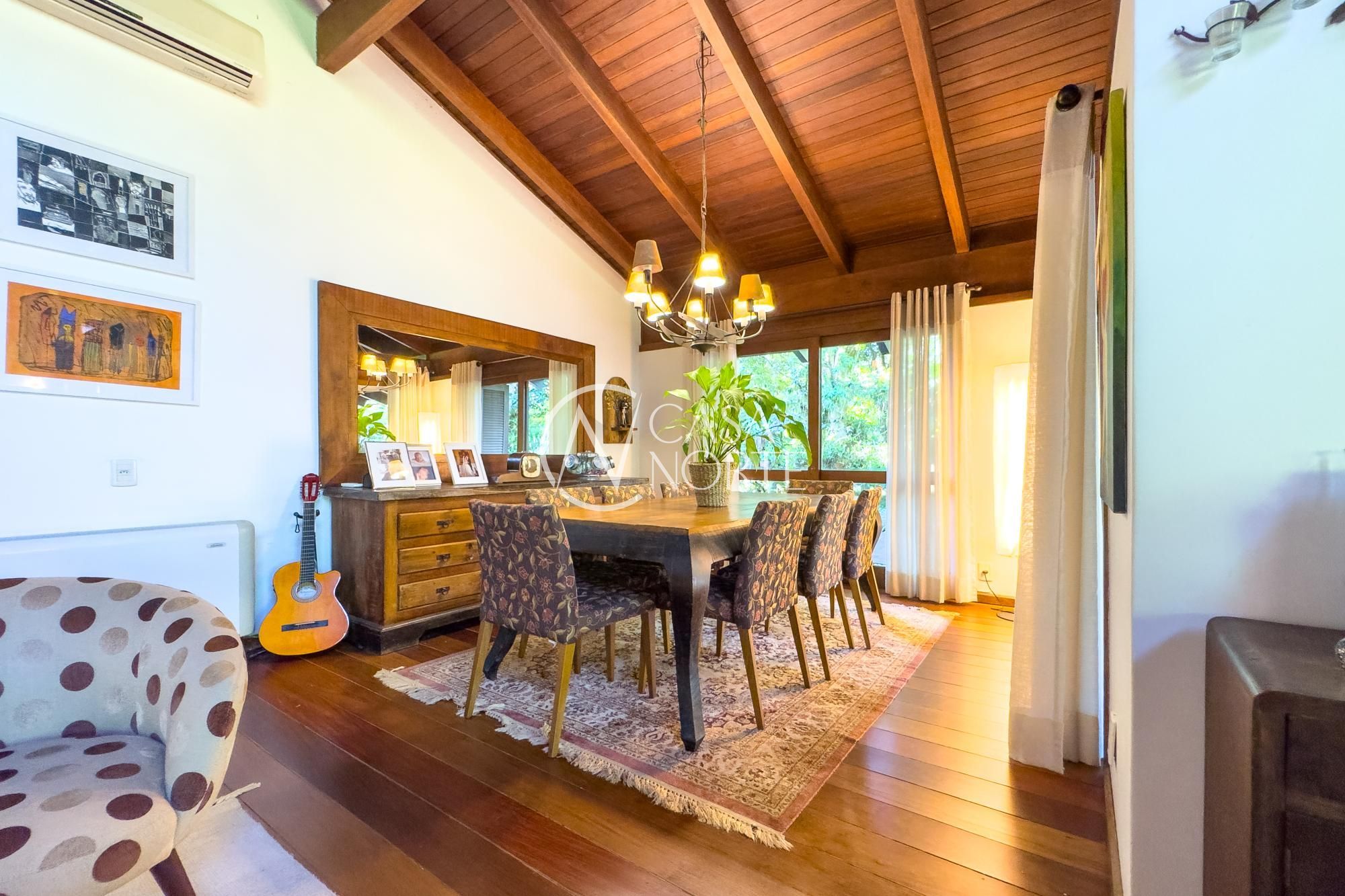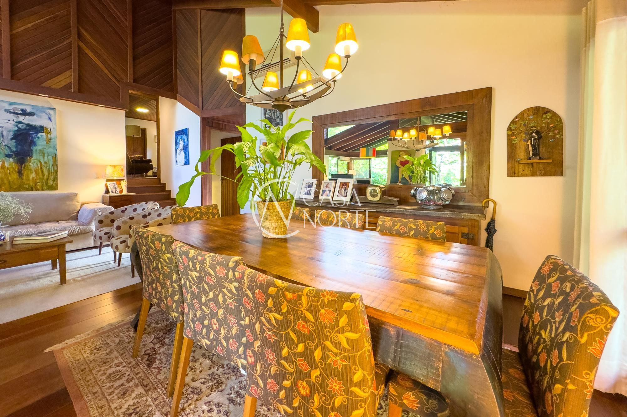 Casa em condomínio com proposta arquitetônica marcada por desníveis que definem bem os ambientes e valorizam a integração dos espaços. A combinação de madeira, piso em taboão nas áreas social e íntima e porcelanato nos demais ambientes cria um equilíbrio entre o rústico e o contemporâneo.