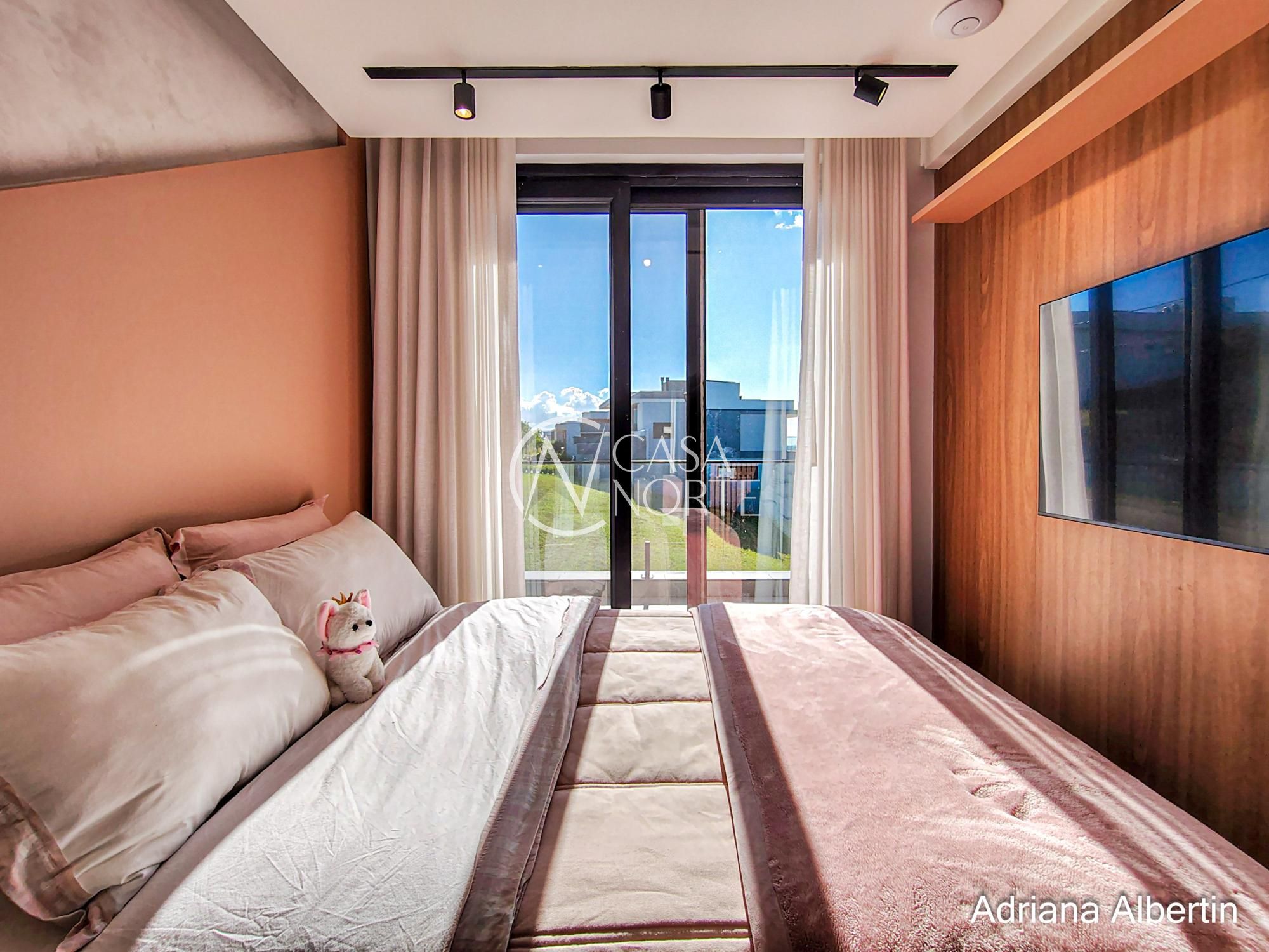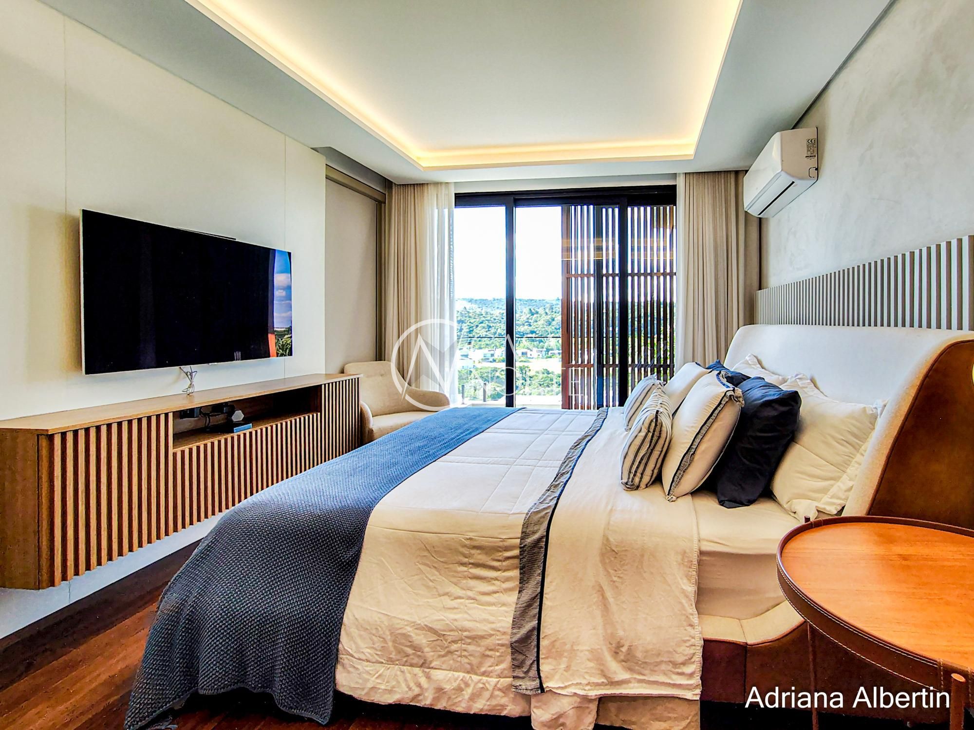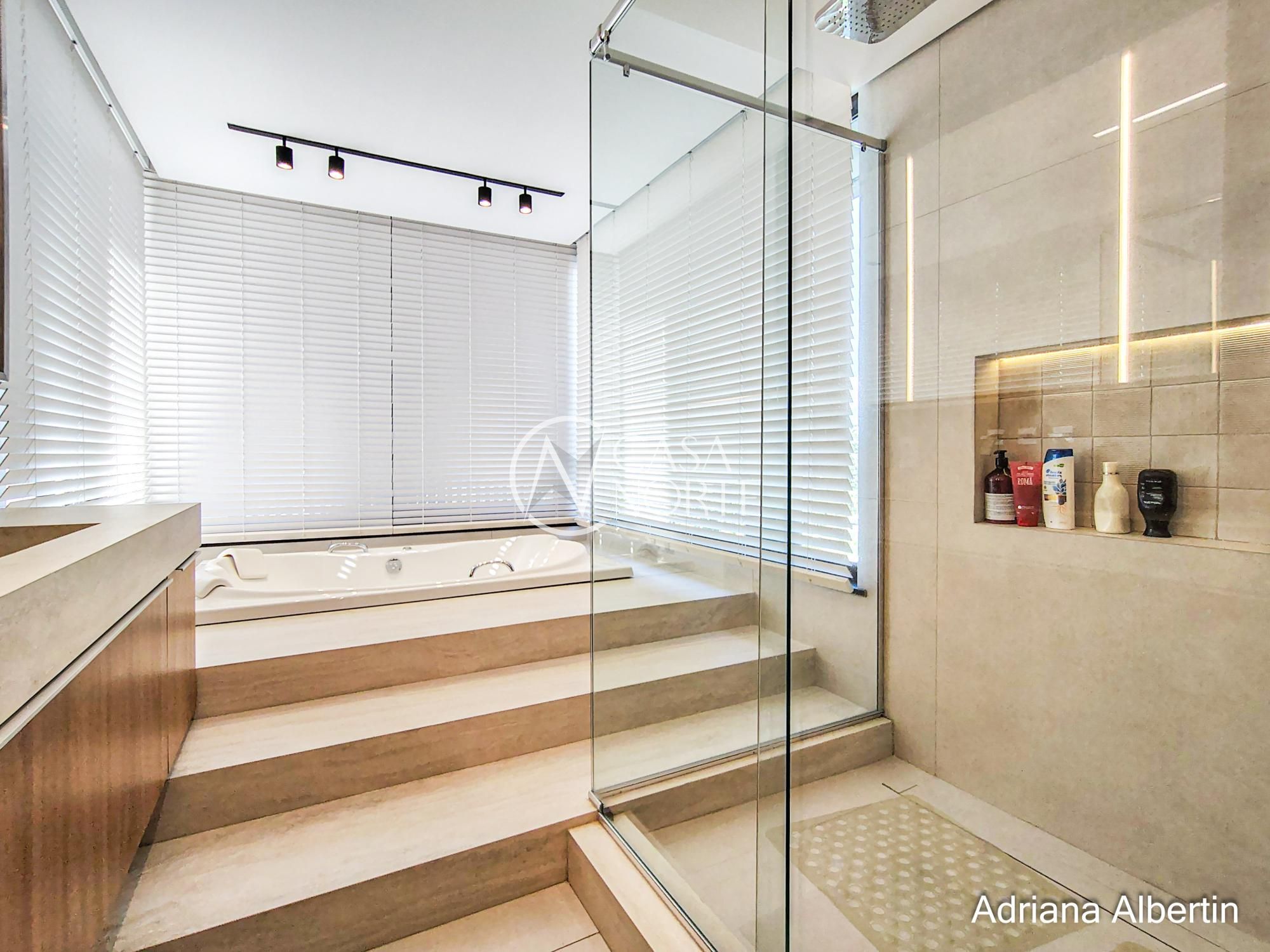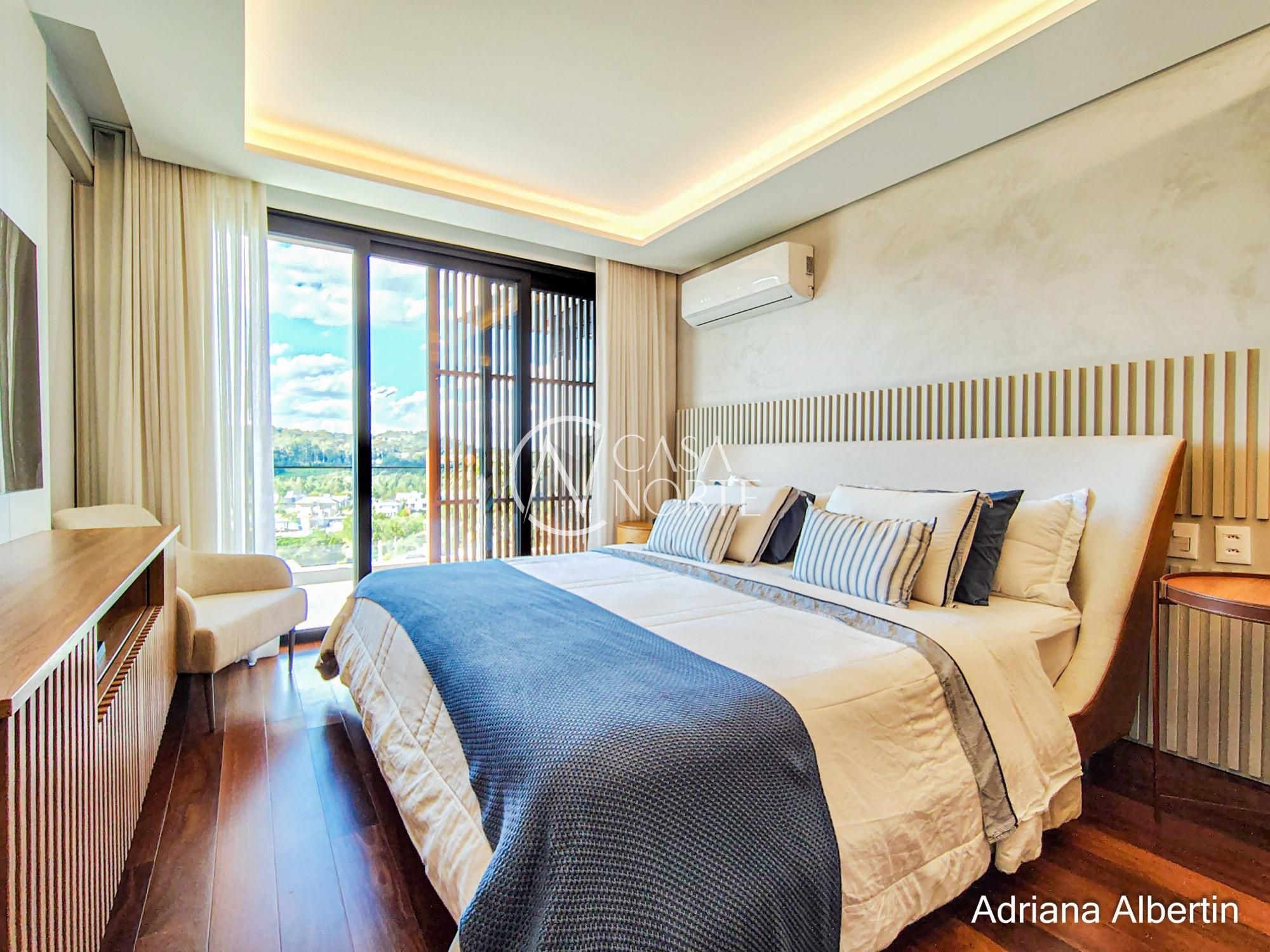 Subindo para a área íntima, são quatro suítes bem distribuídas, todas confortáveis. A suíte master merece destaque: além do tamanho generoso, ela aproveita a mesma vista privilegiada da área social da casa.