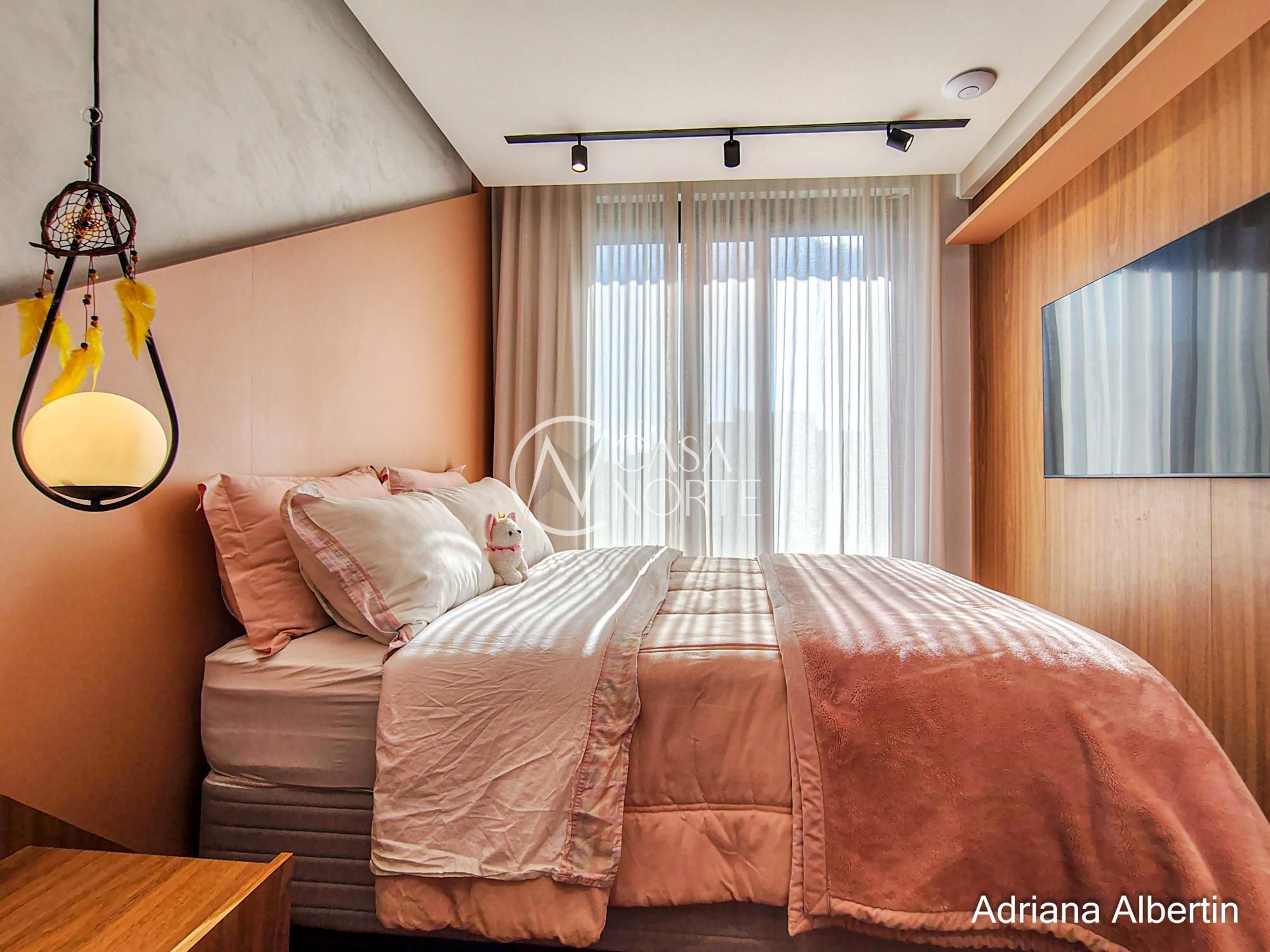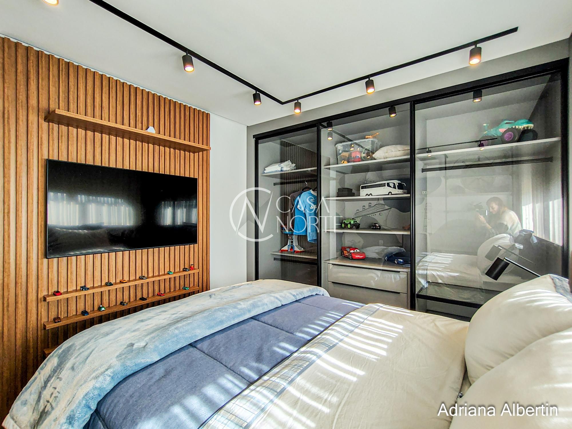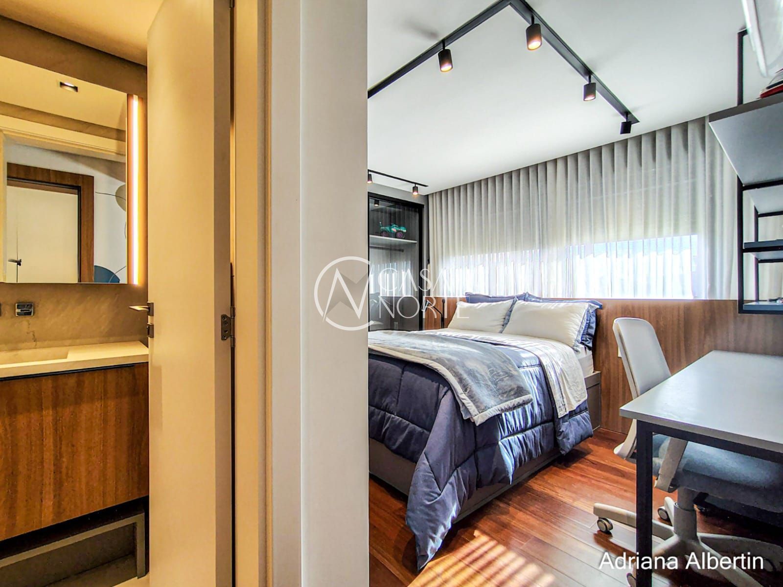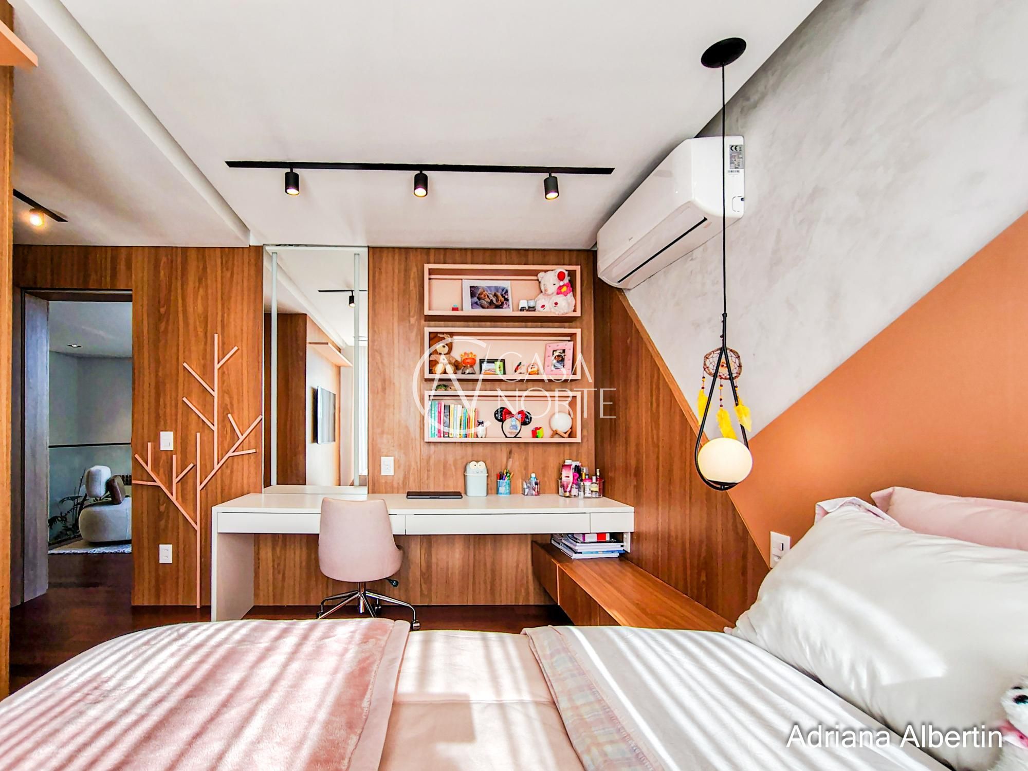 Subindo para a área íntima, são quatro suítes bem distribuídas, todas confortáveis. A suíte master merece destaque: além do tamanho generoso, ela aproveita a mesma vista privilegiada da área social da casa.