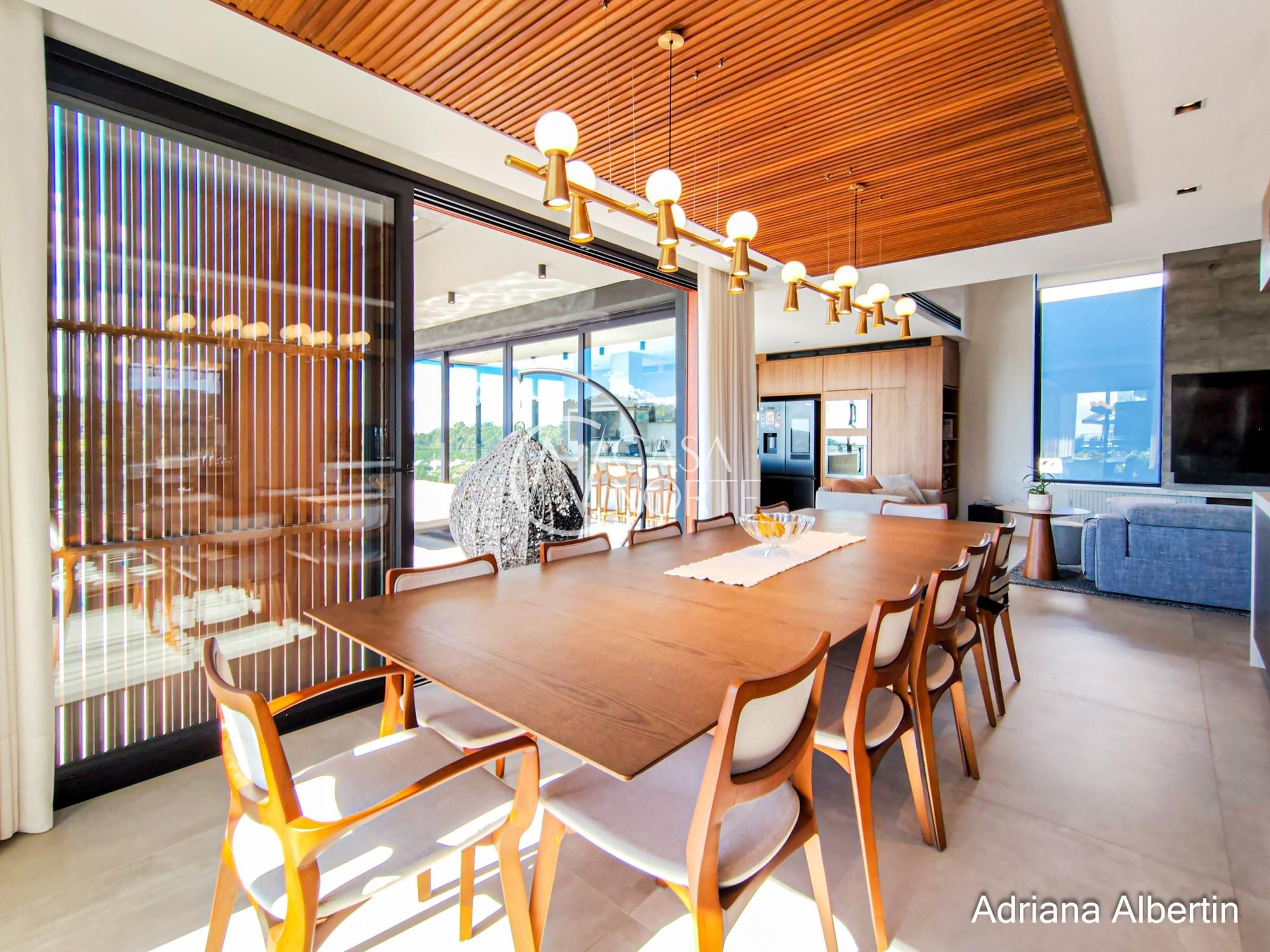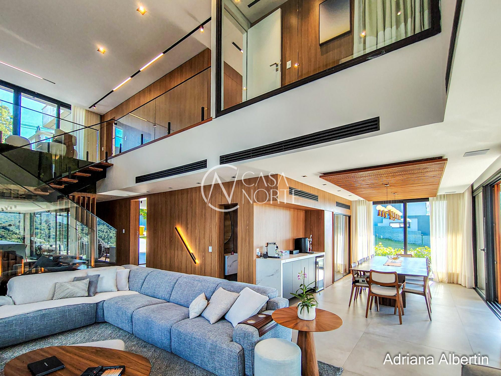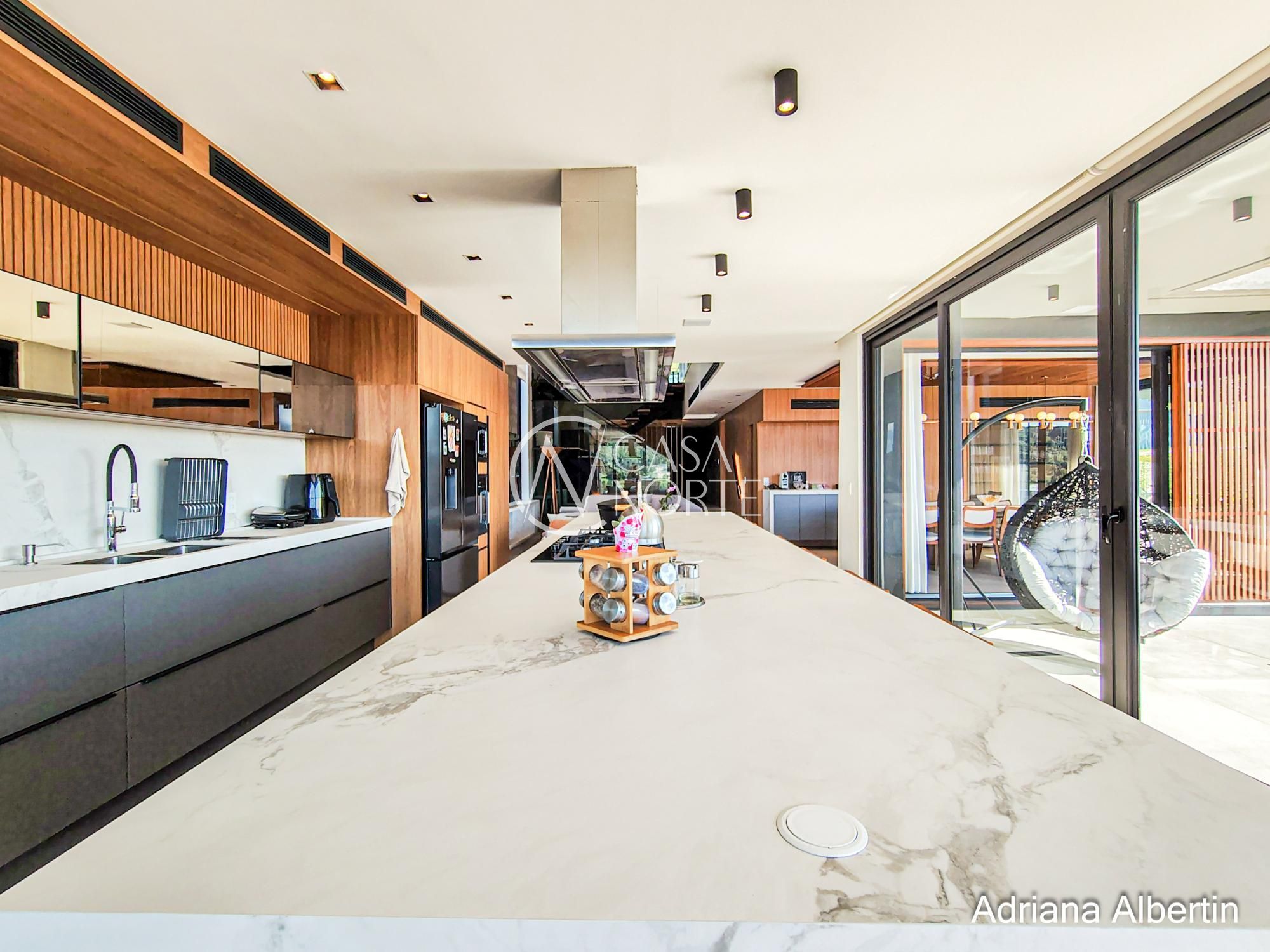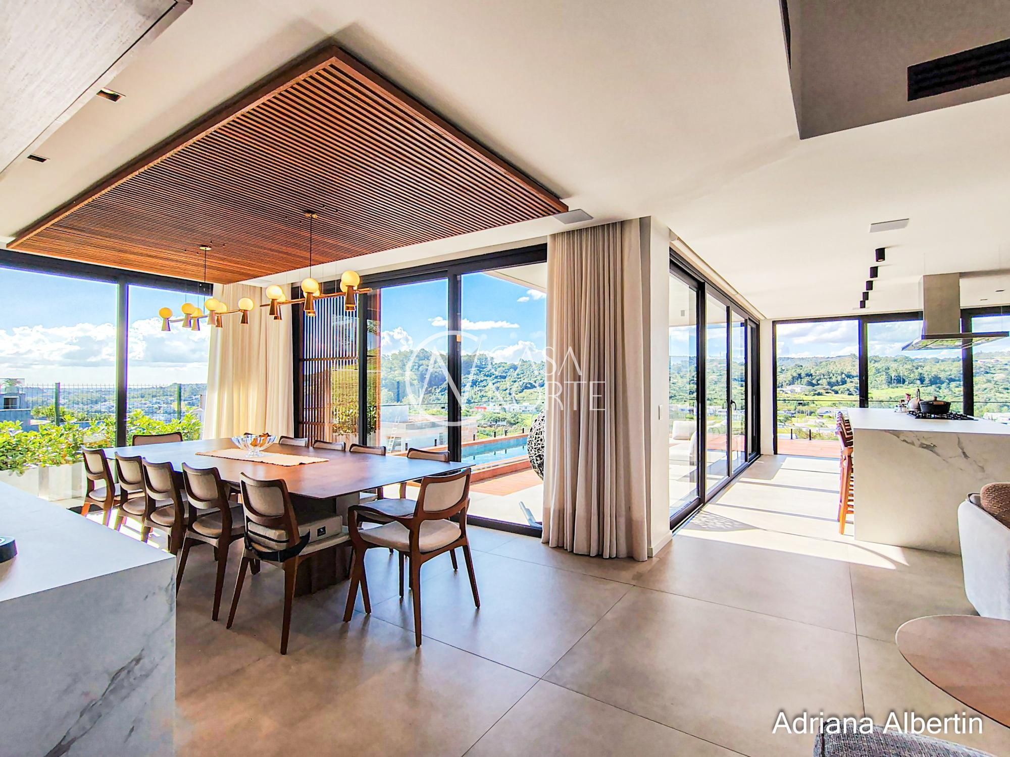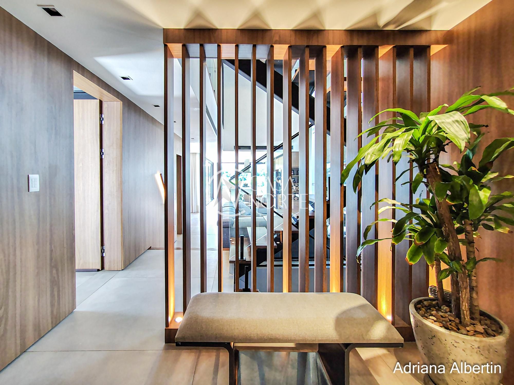 Logo na chegada, o hall de entrada já entrega a proposta da casa: ambientes amplos, acabamentos de alto padrão e uma vista aberta que acompanha praticamente todos os espaços sociais.