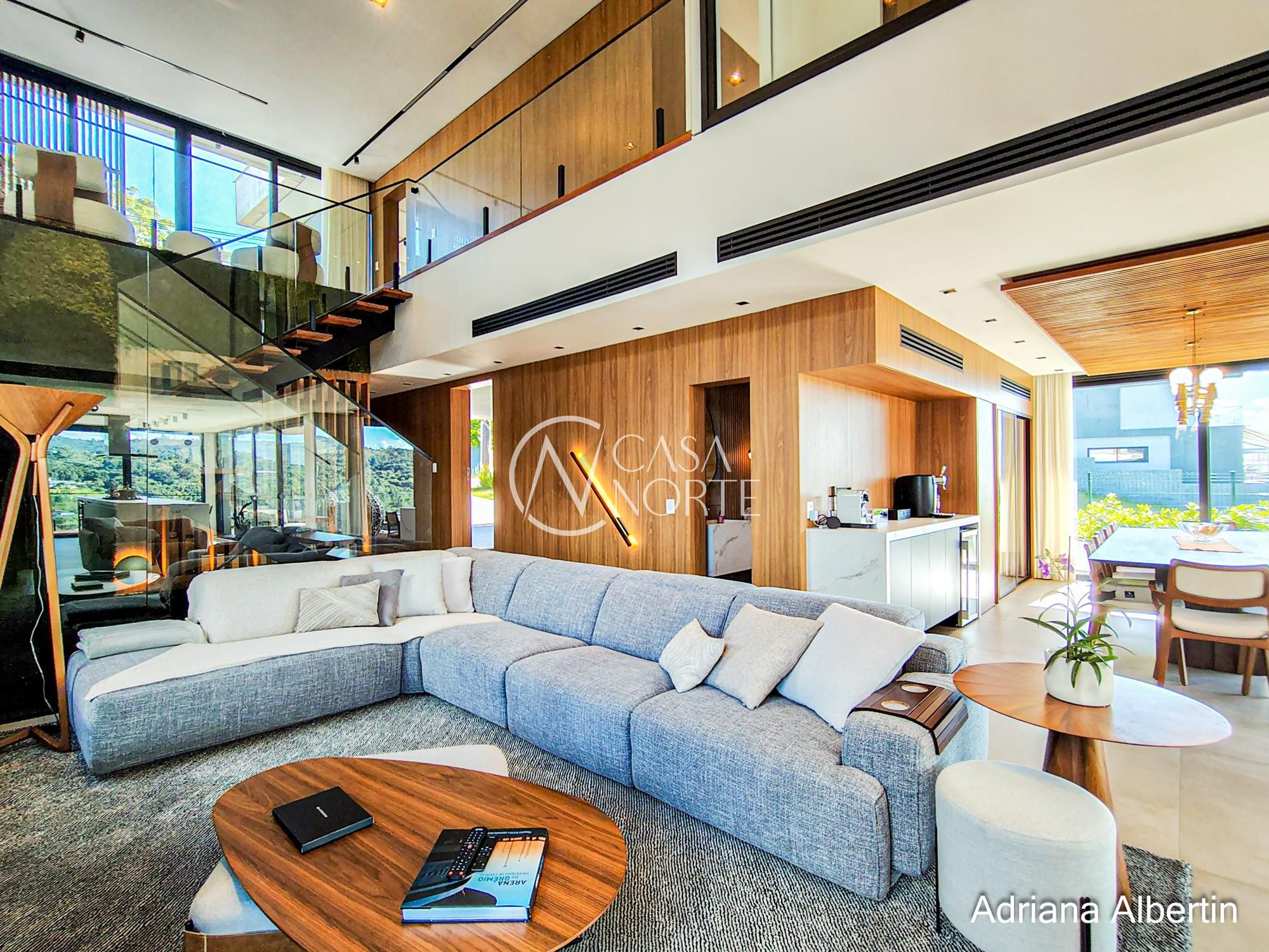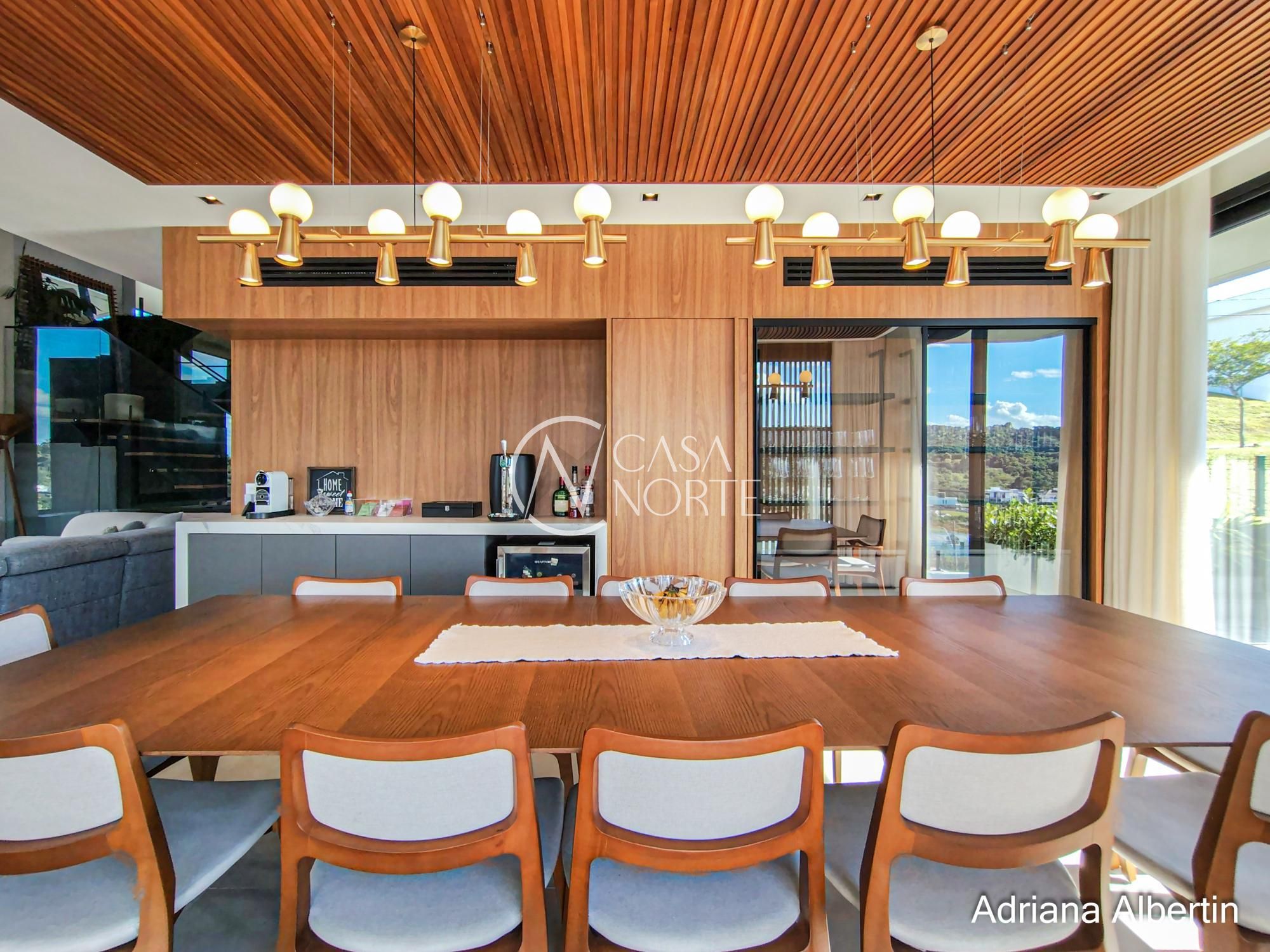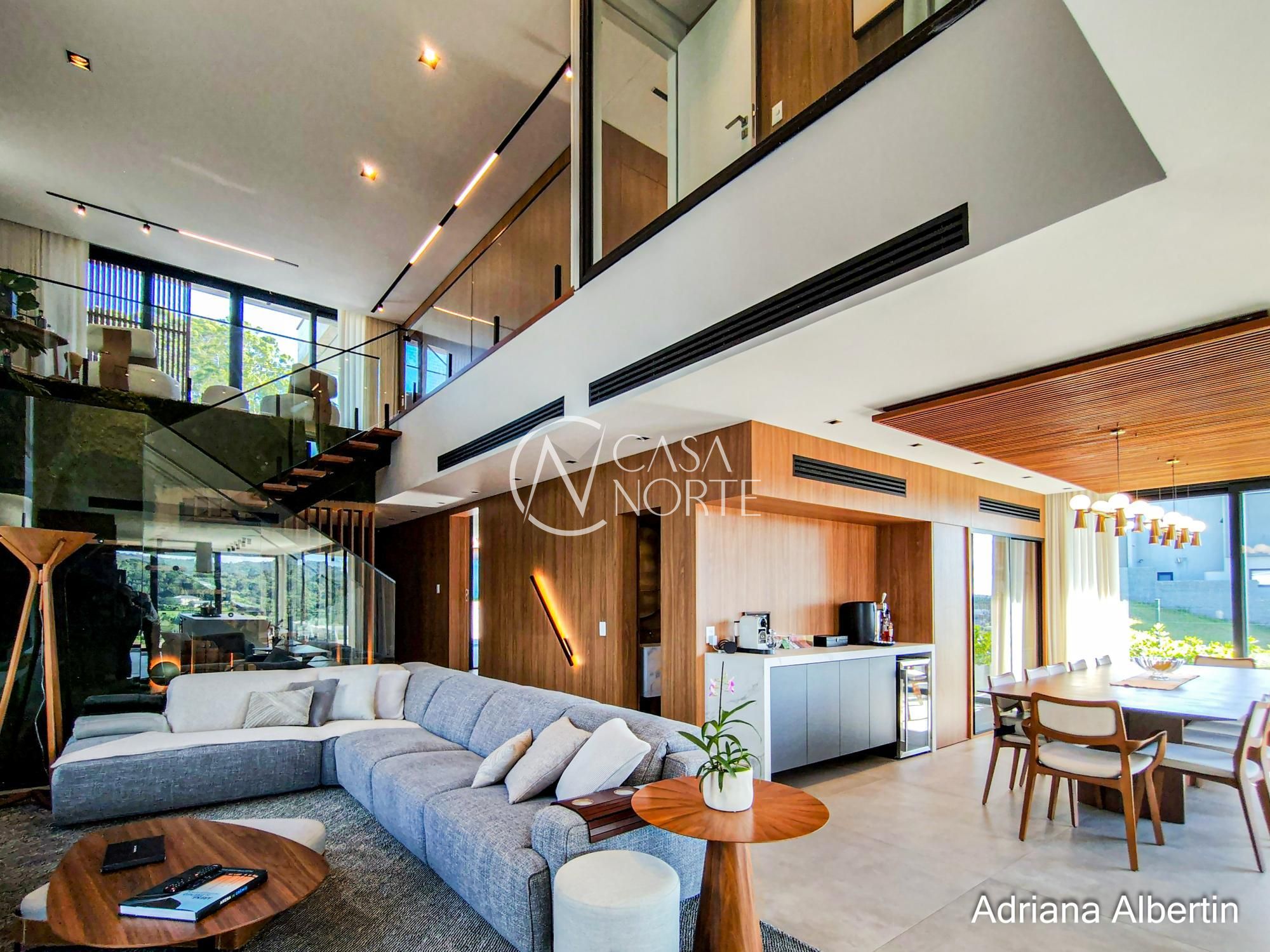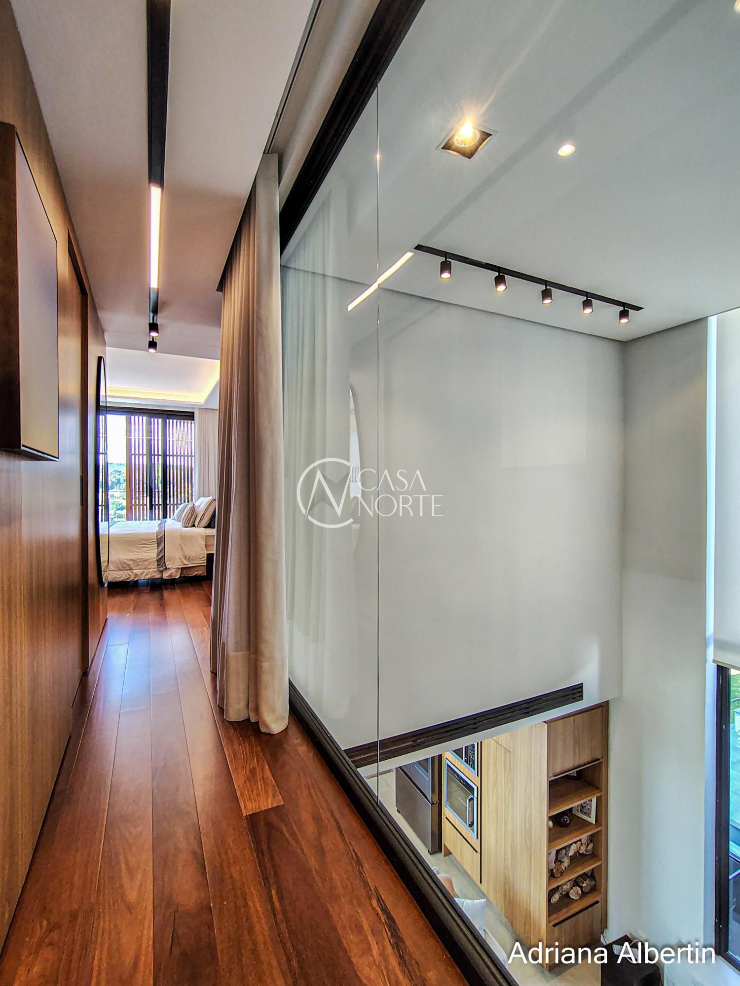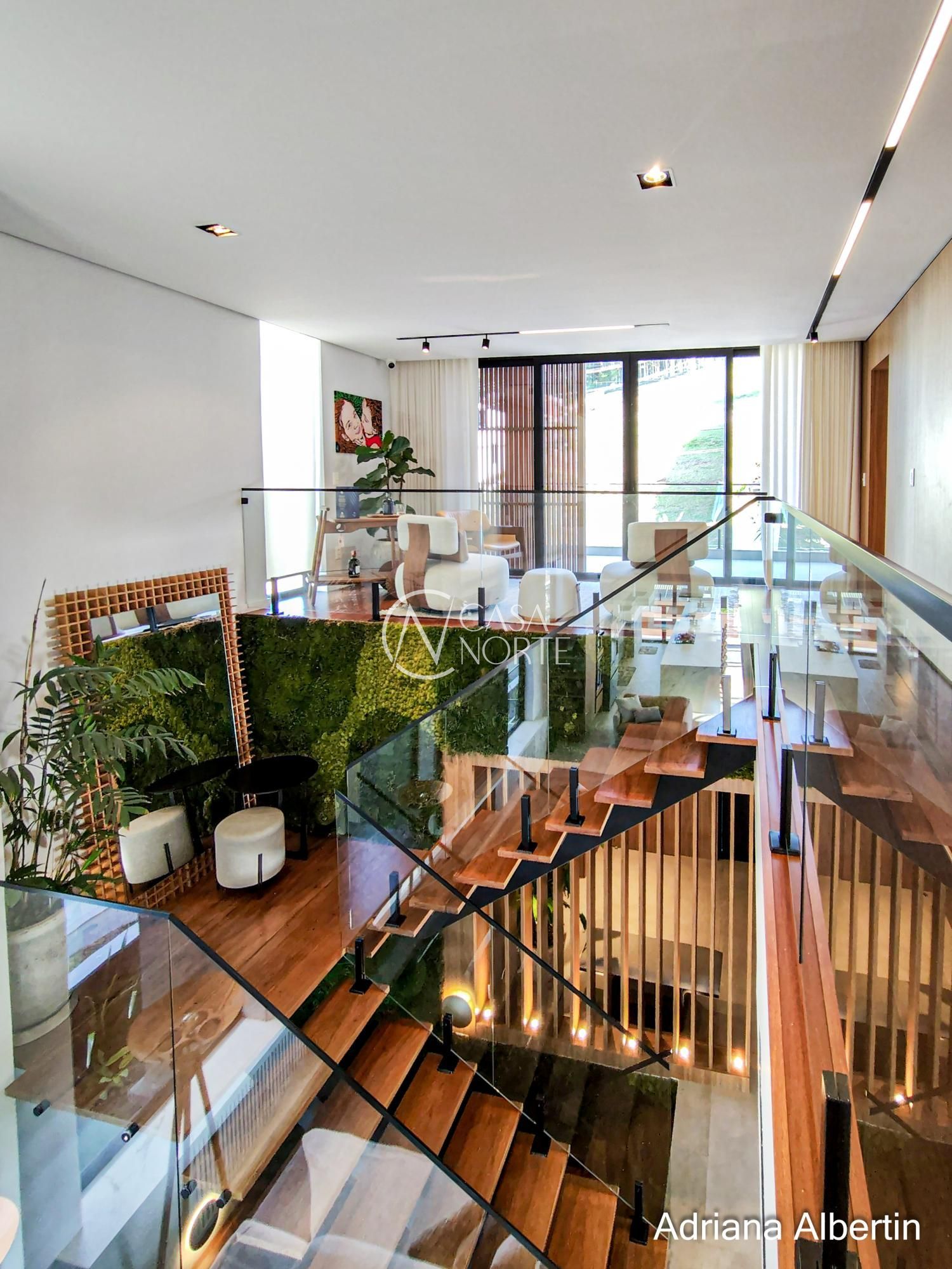 Logo na chegada, o hall de entrada já entrega a proposta da casa: ambientes amplos, acabamentos de alto padrão e uma vista aberta que acompanha praticamente todos os espaços sociais.