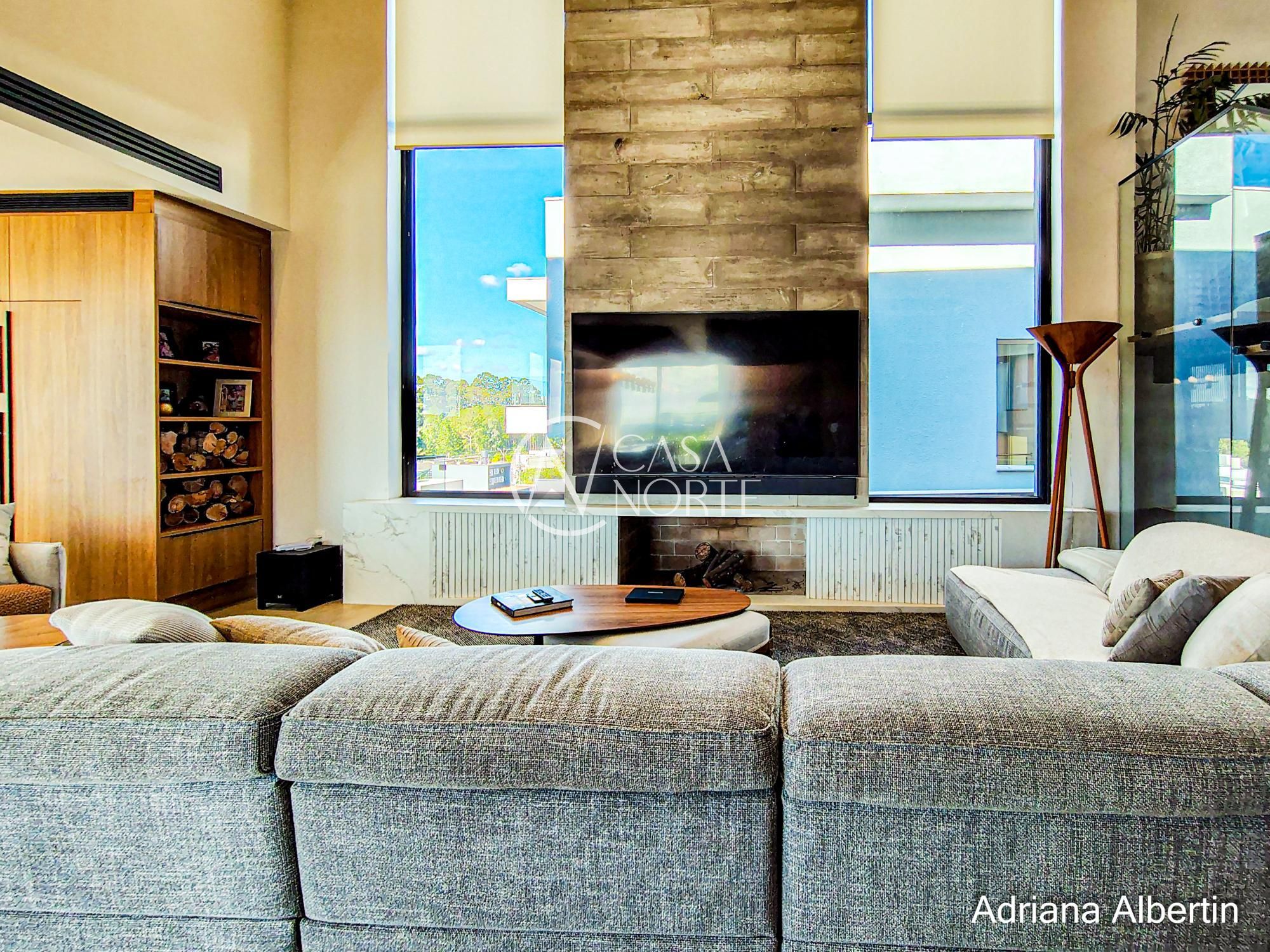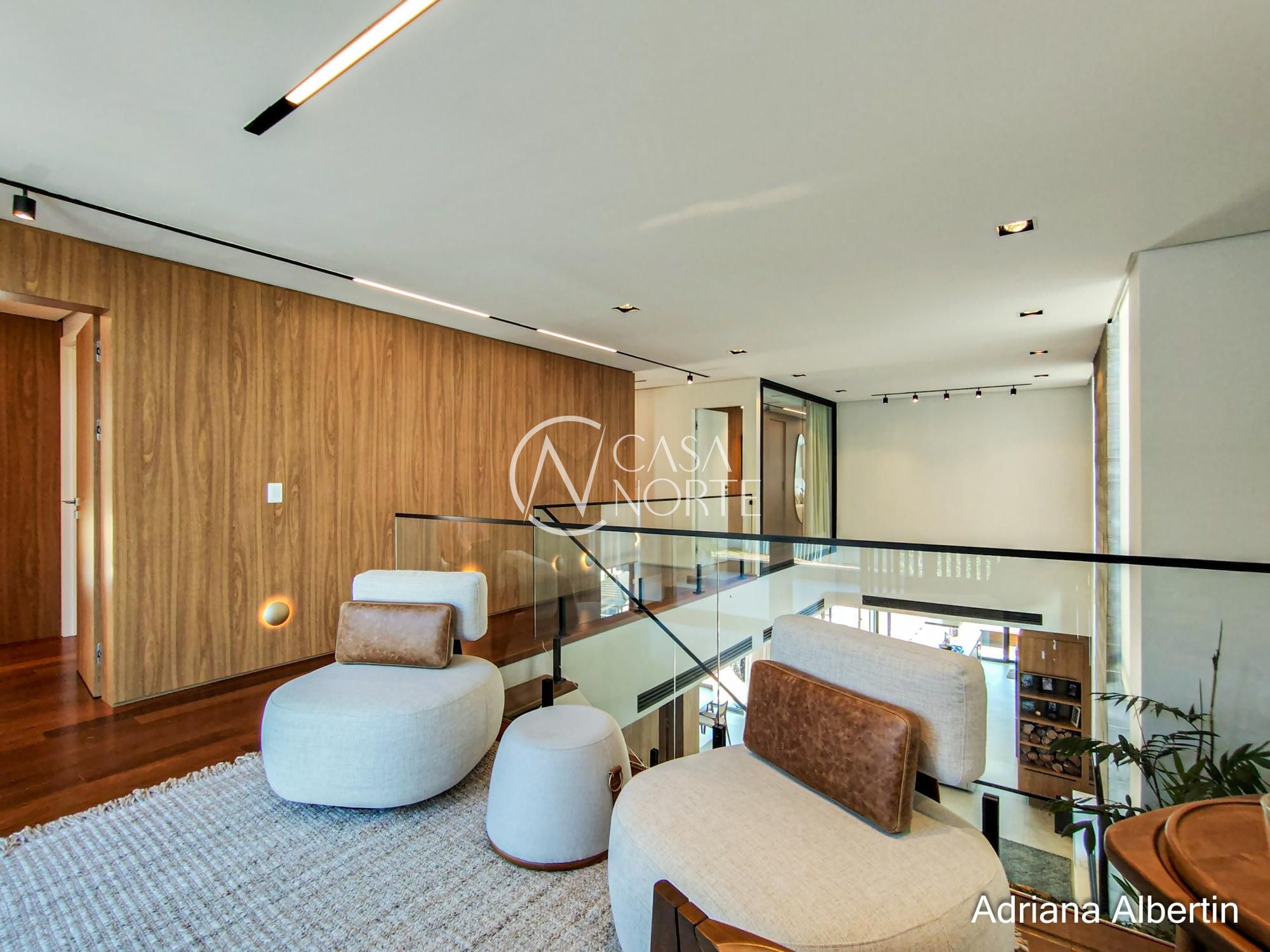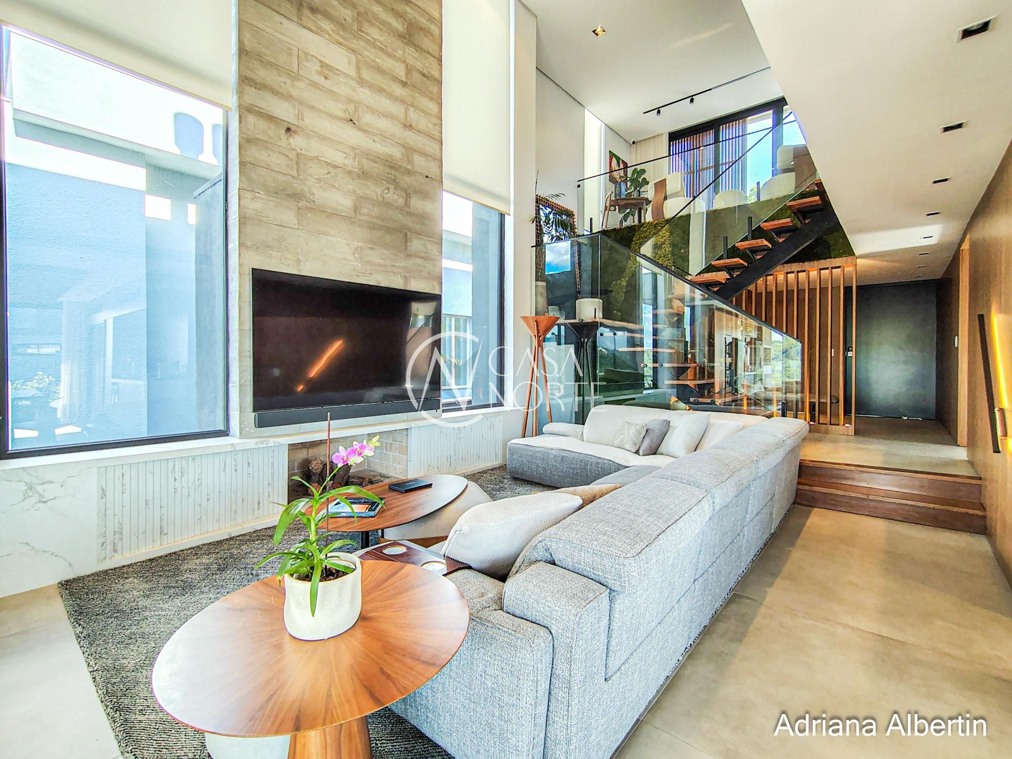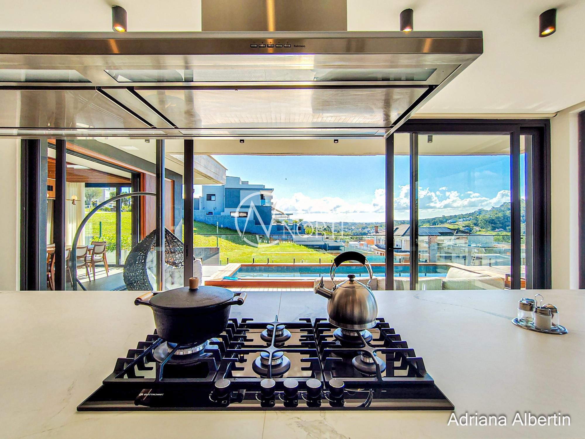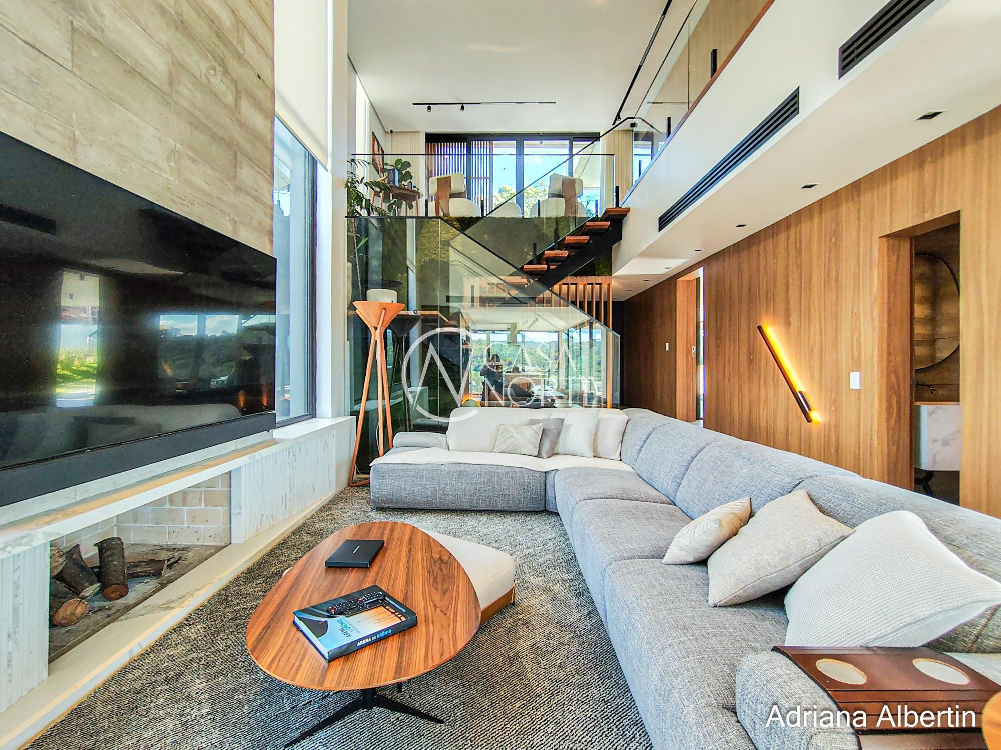 Logo na chegada, o hall de entrada já entrega a proposta da casa: ambientes amplos, acabamentos de alto padrão e uma vista aberta que acompanha praticamente todos os espaços sociais.