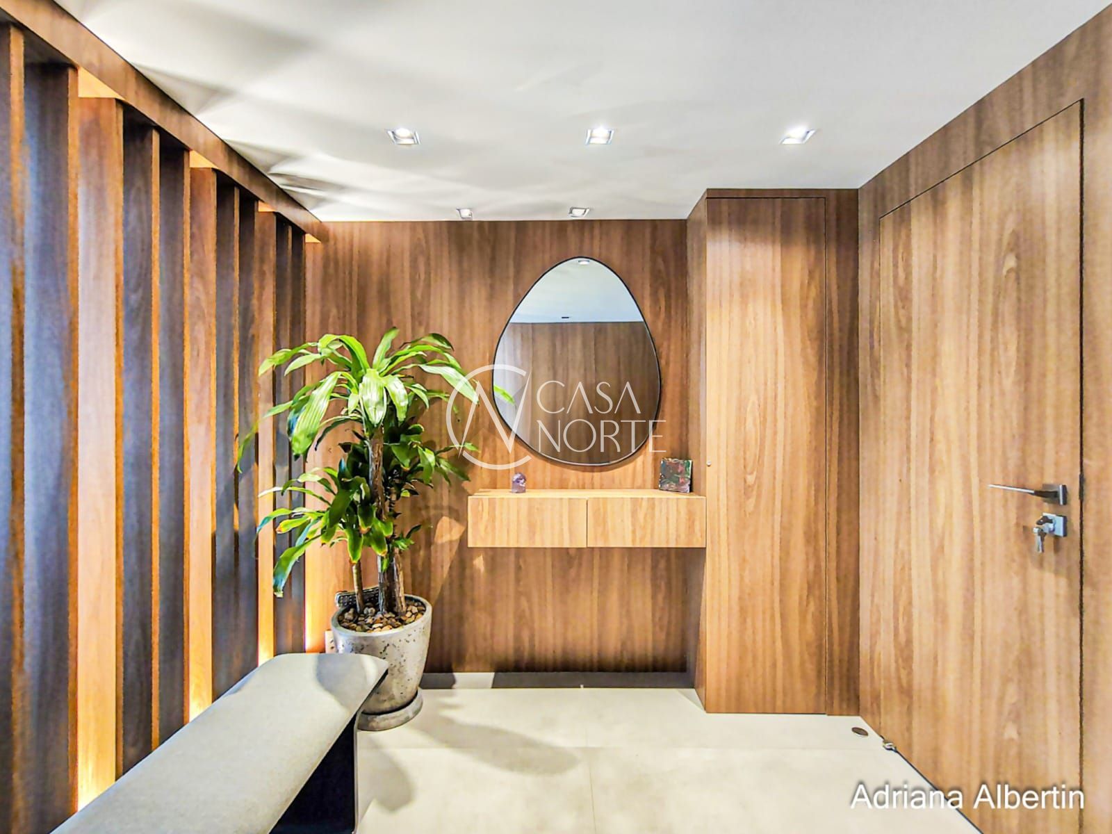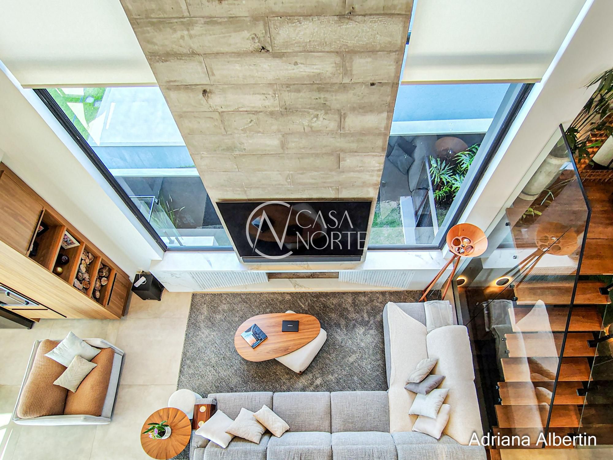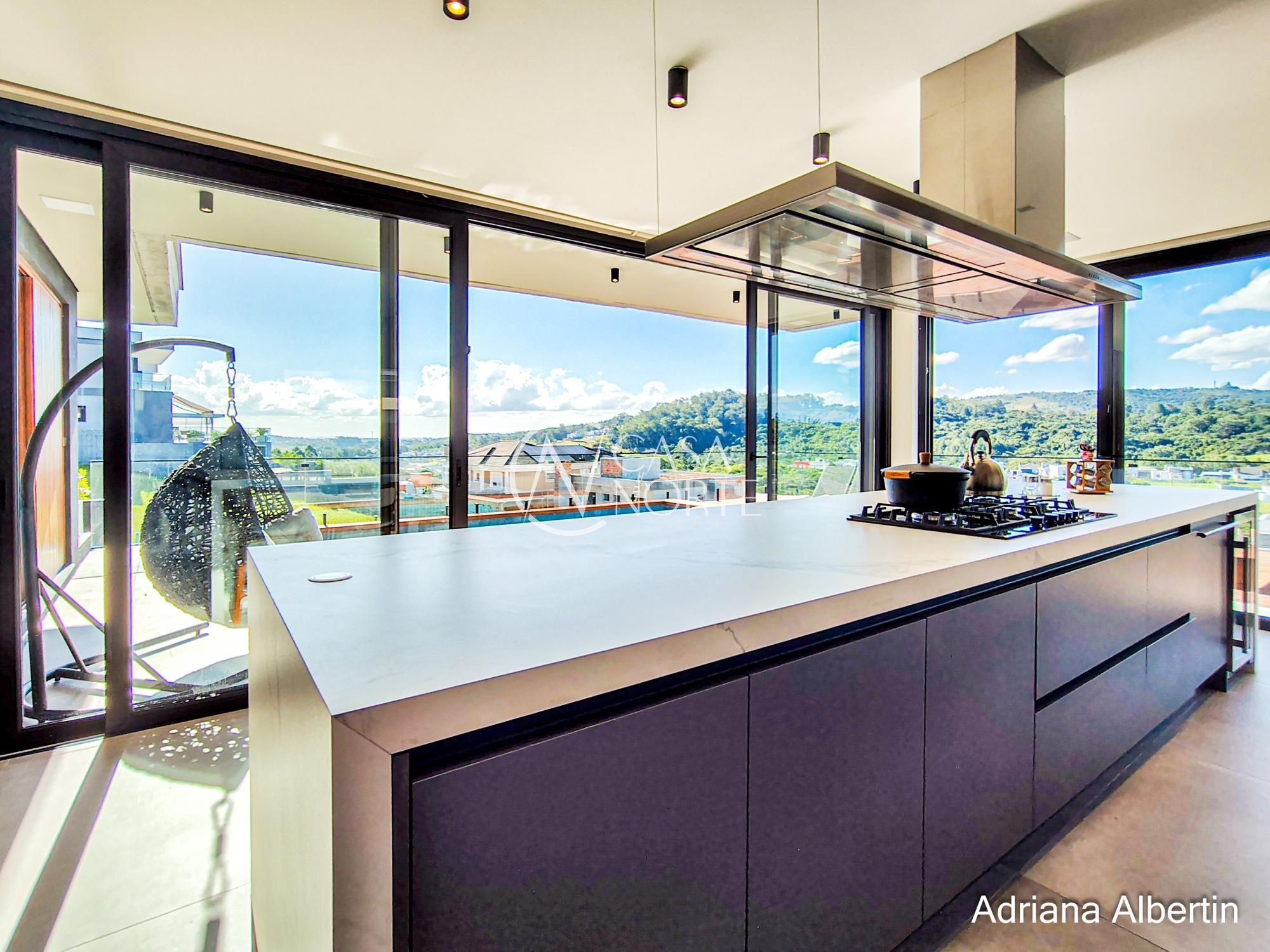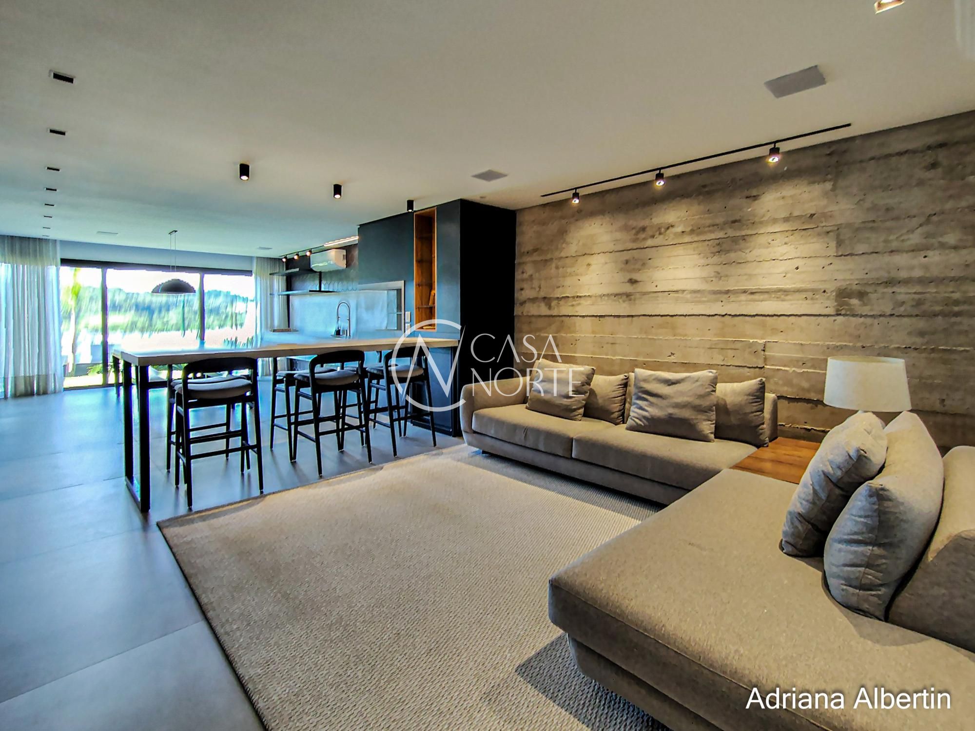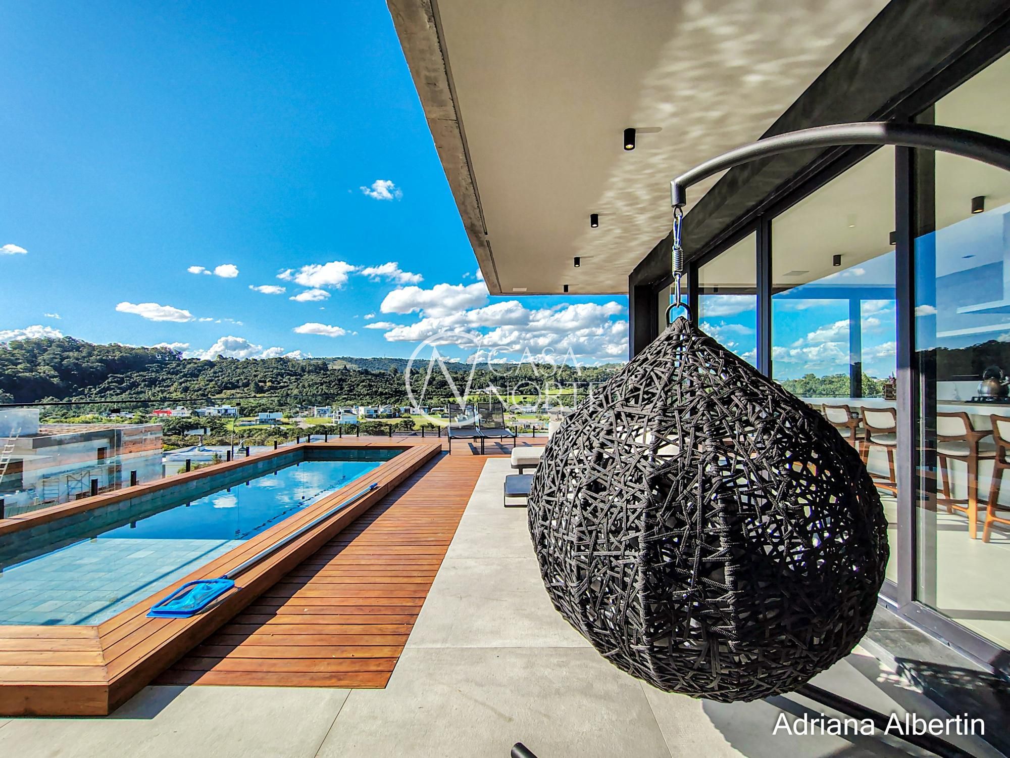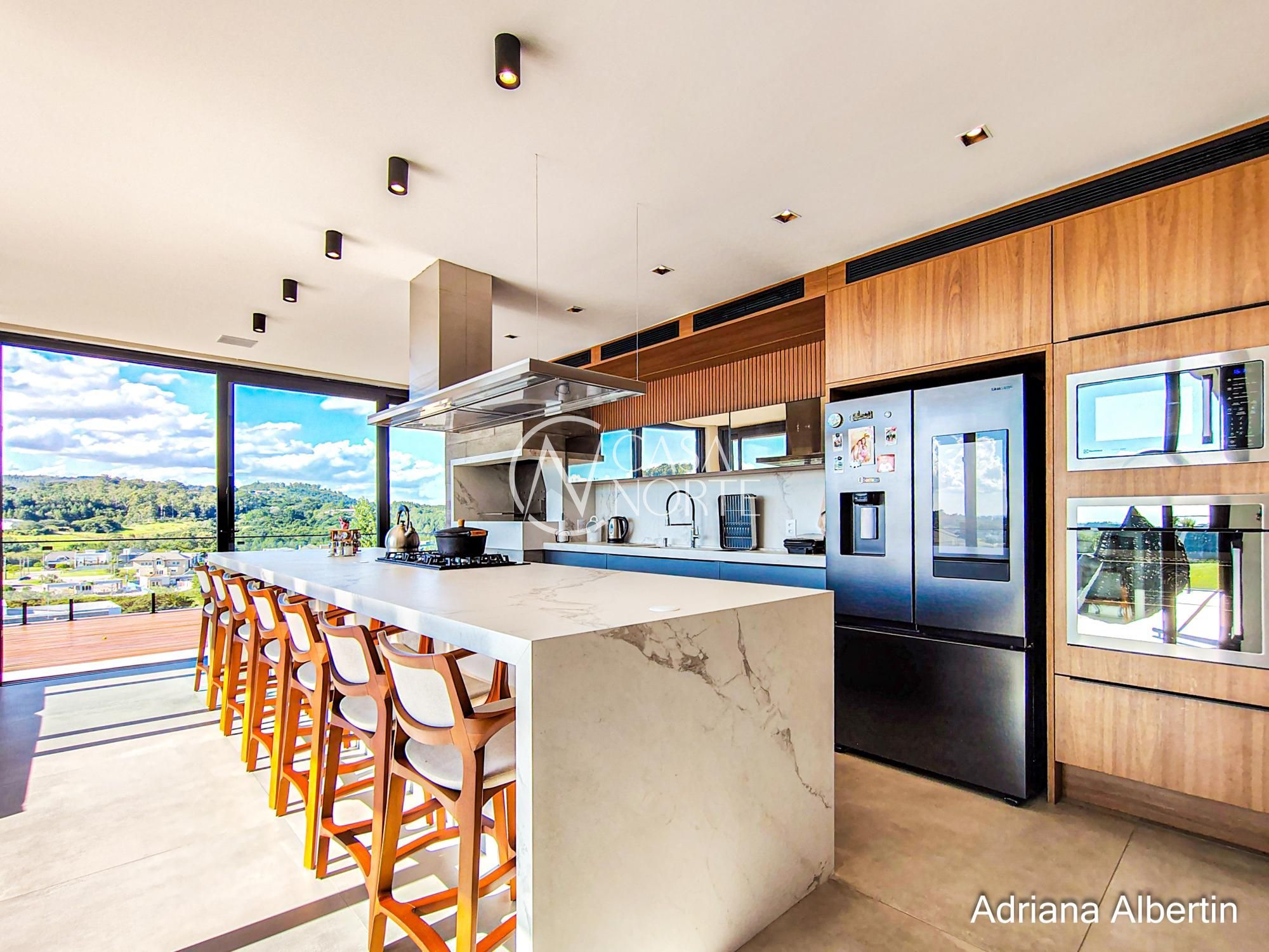 Logo na chegada, o hall de entrada já entrega a proposta da casa: ambientes amplos, acabamentos de alto padrão e uma vista aberta que acompanha praticamente todos os espaços sociais.