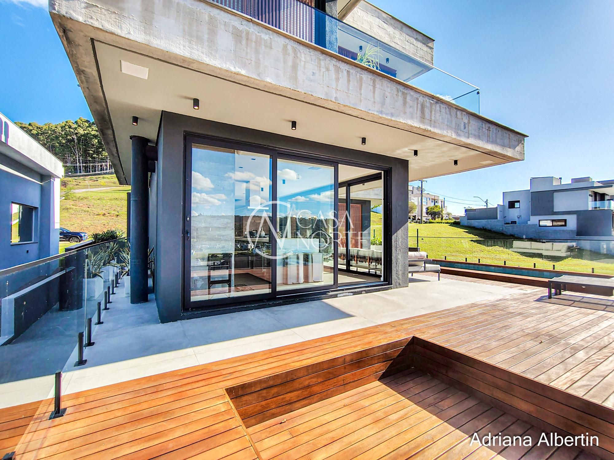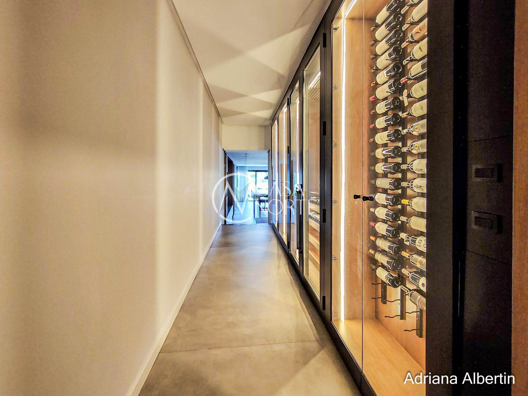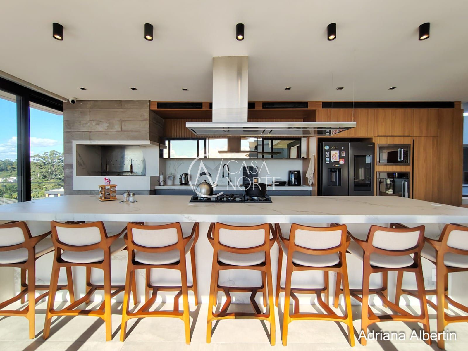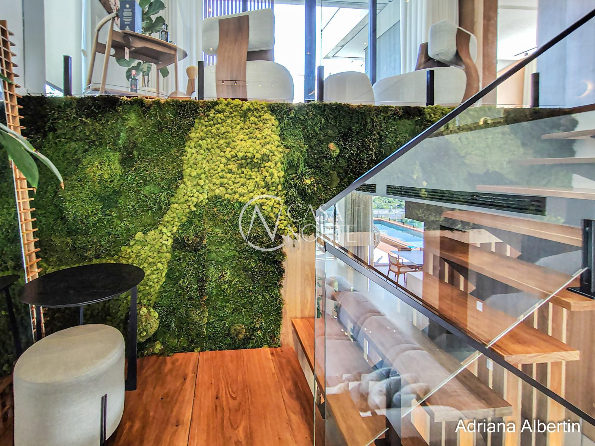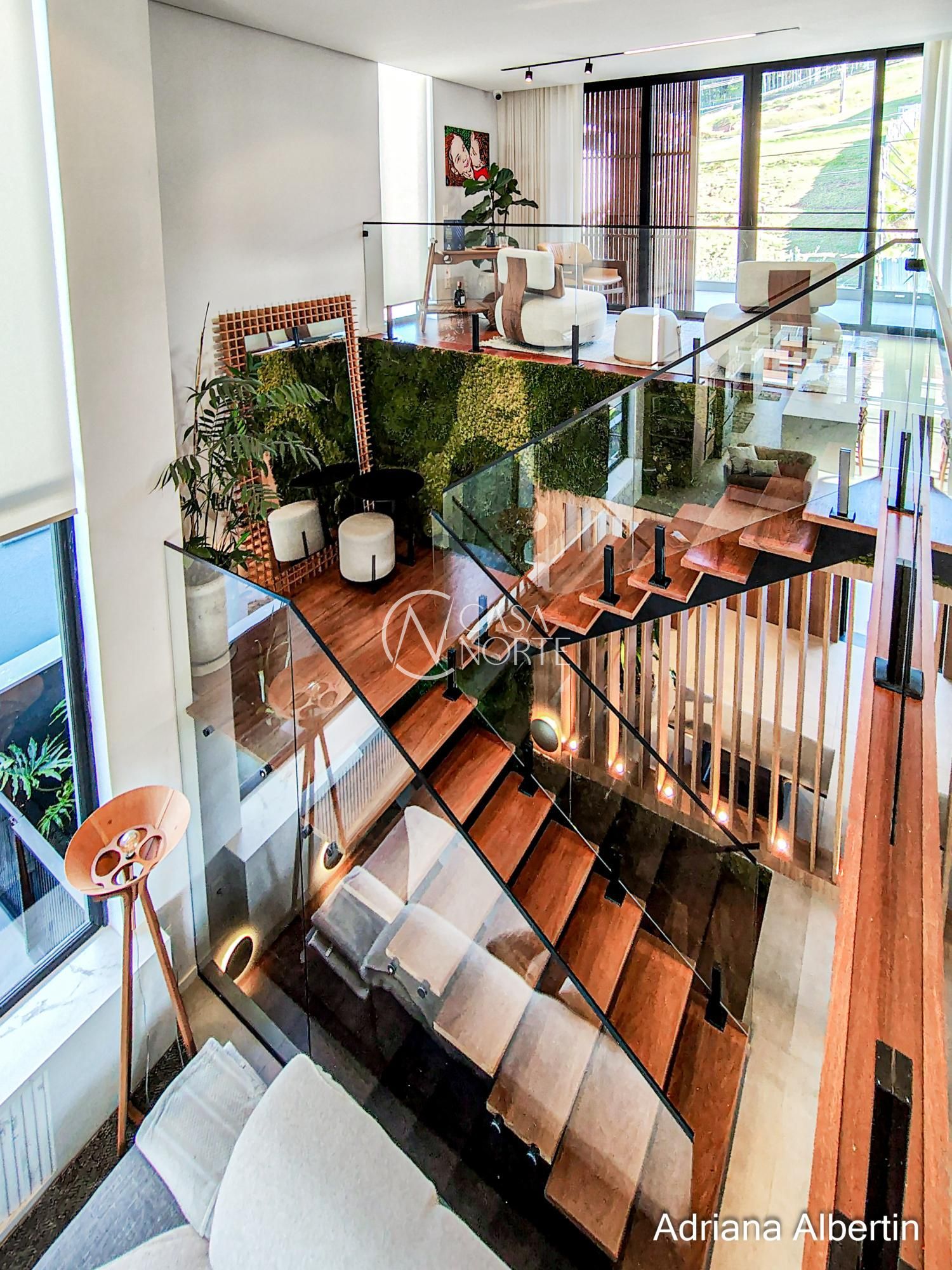 Logo na chegada, o hall de entrada já entrega a proposta da casa: ambientes amplos, acabamentos de alto padrão e uma vista aberta que acompanha praticamente todos os espaços sociais.