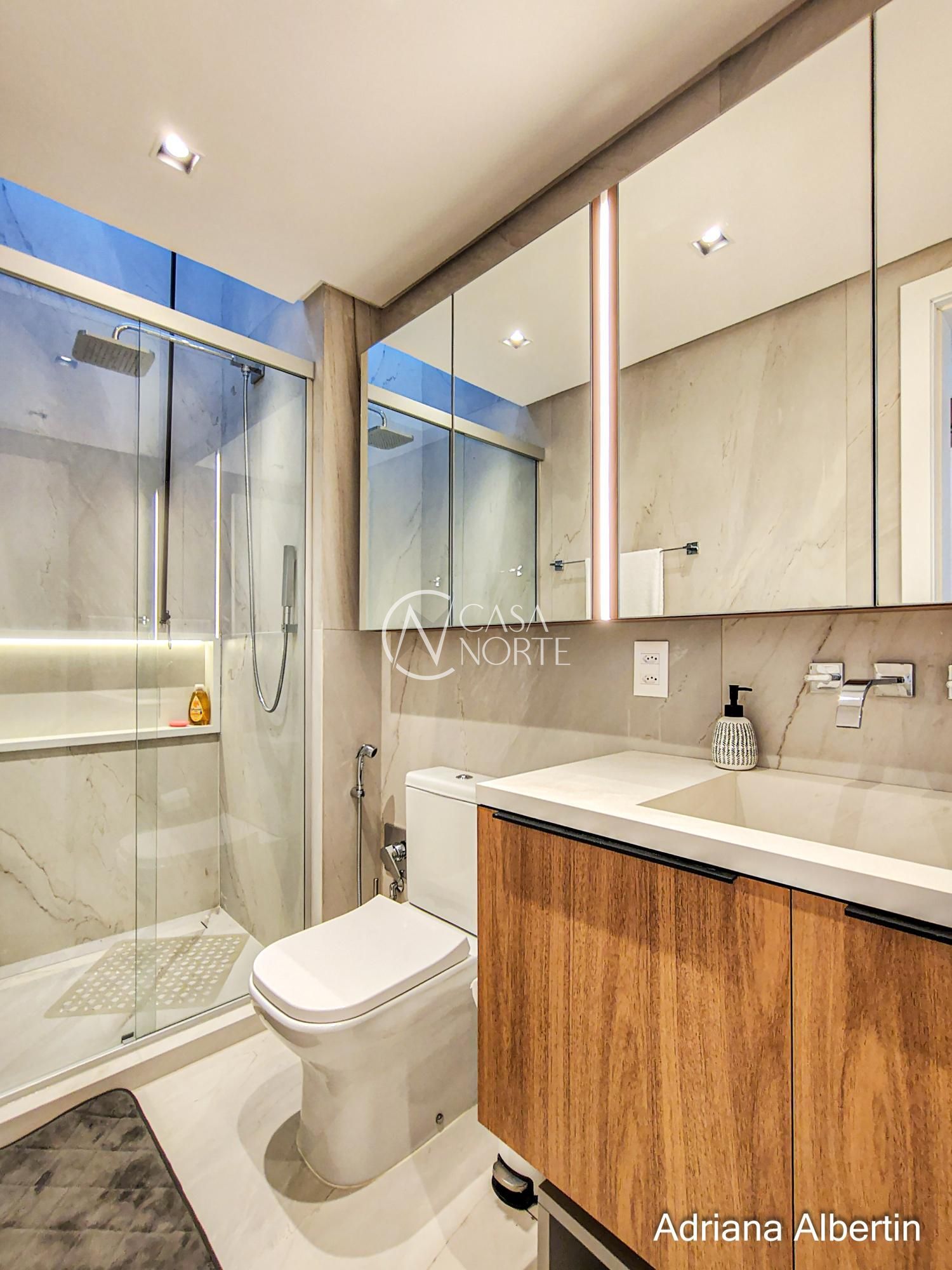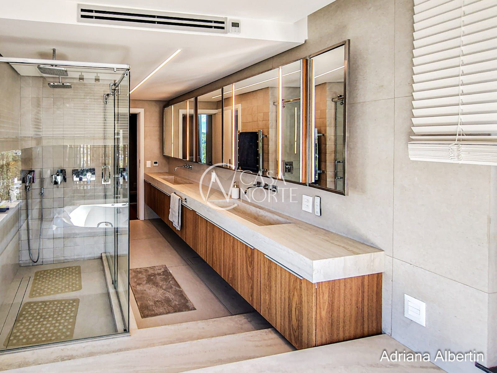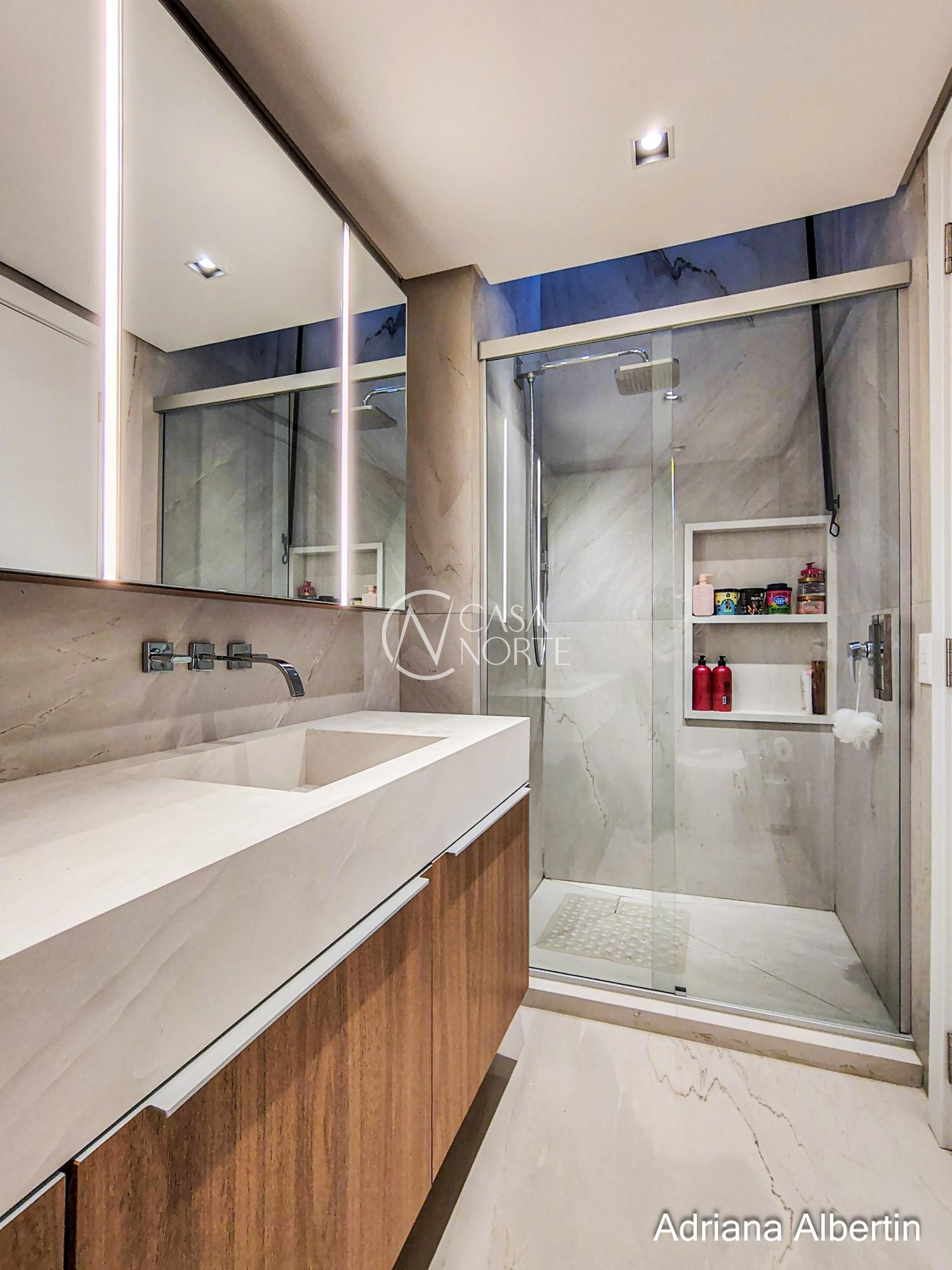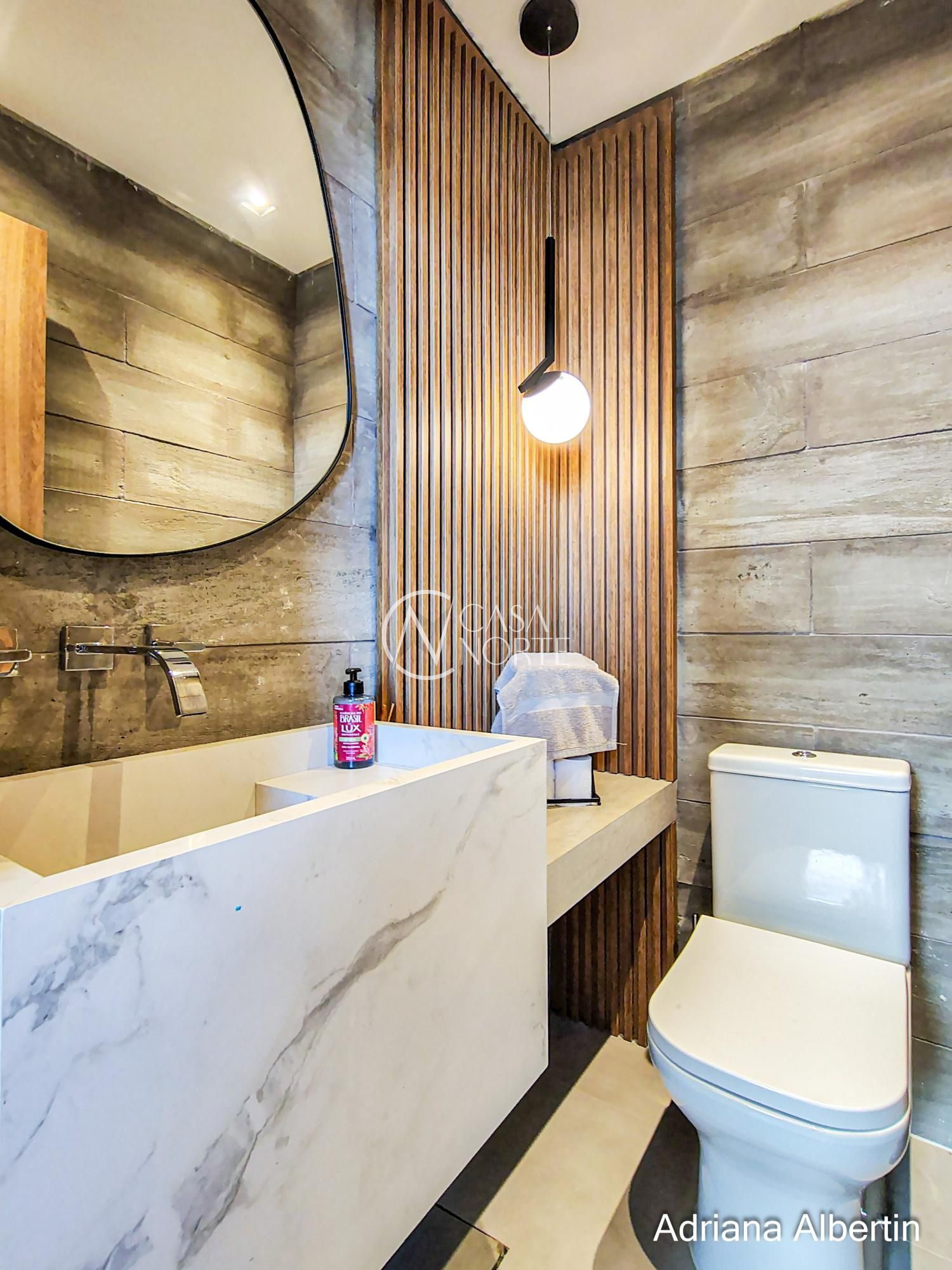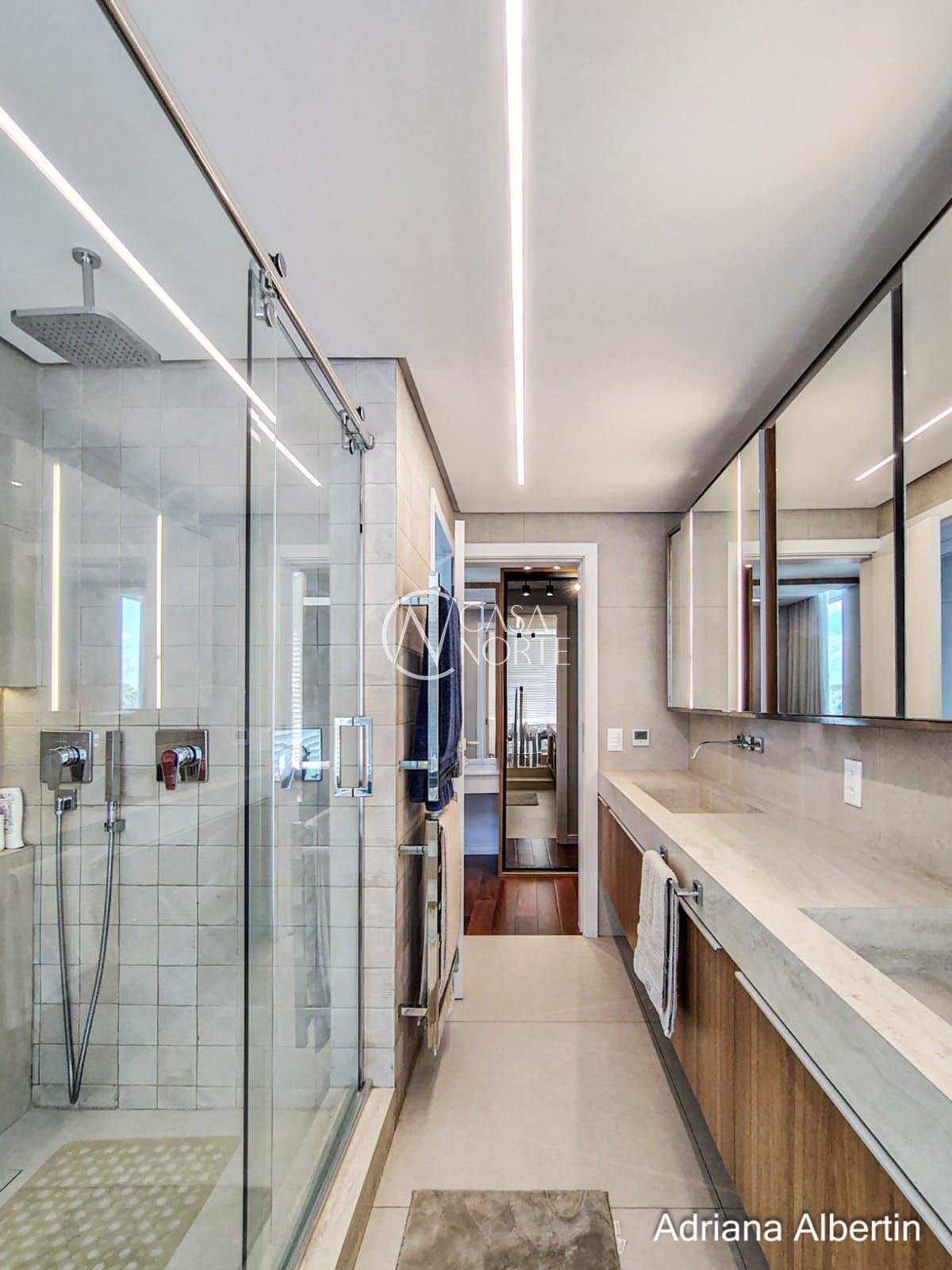 Logo na chegada, o hall de entrada já entrega a proposta da casa: ambientes amplos, acabamentos de alto padrão e uma vista aberta que acompanha praticamente todos os espaços sociais.