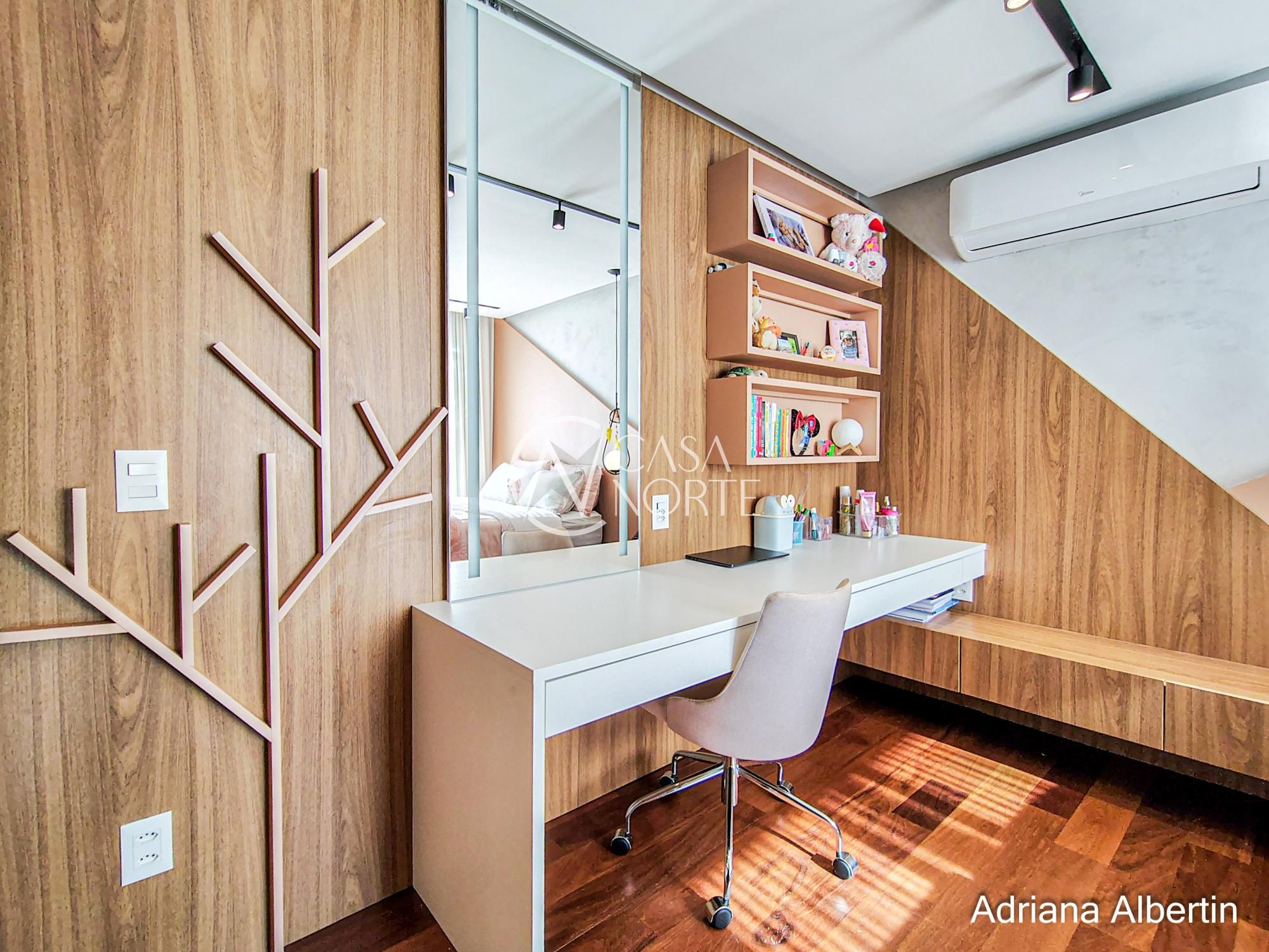 Ainda neste nível, a casa conta com escritório reservado e garagem para dois carros.