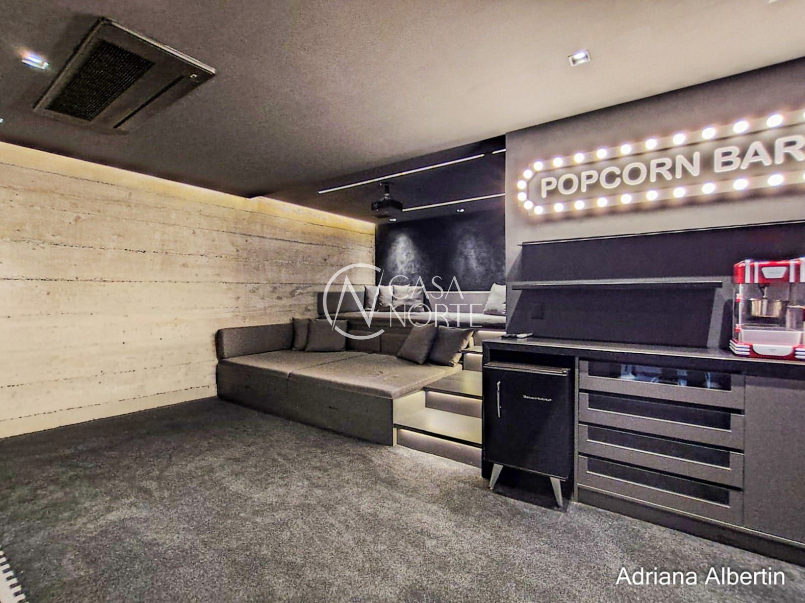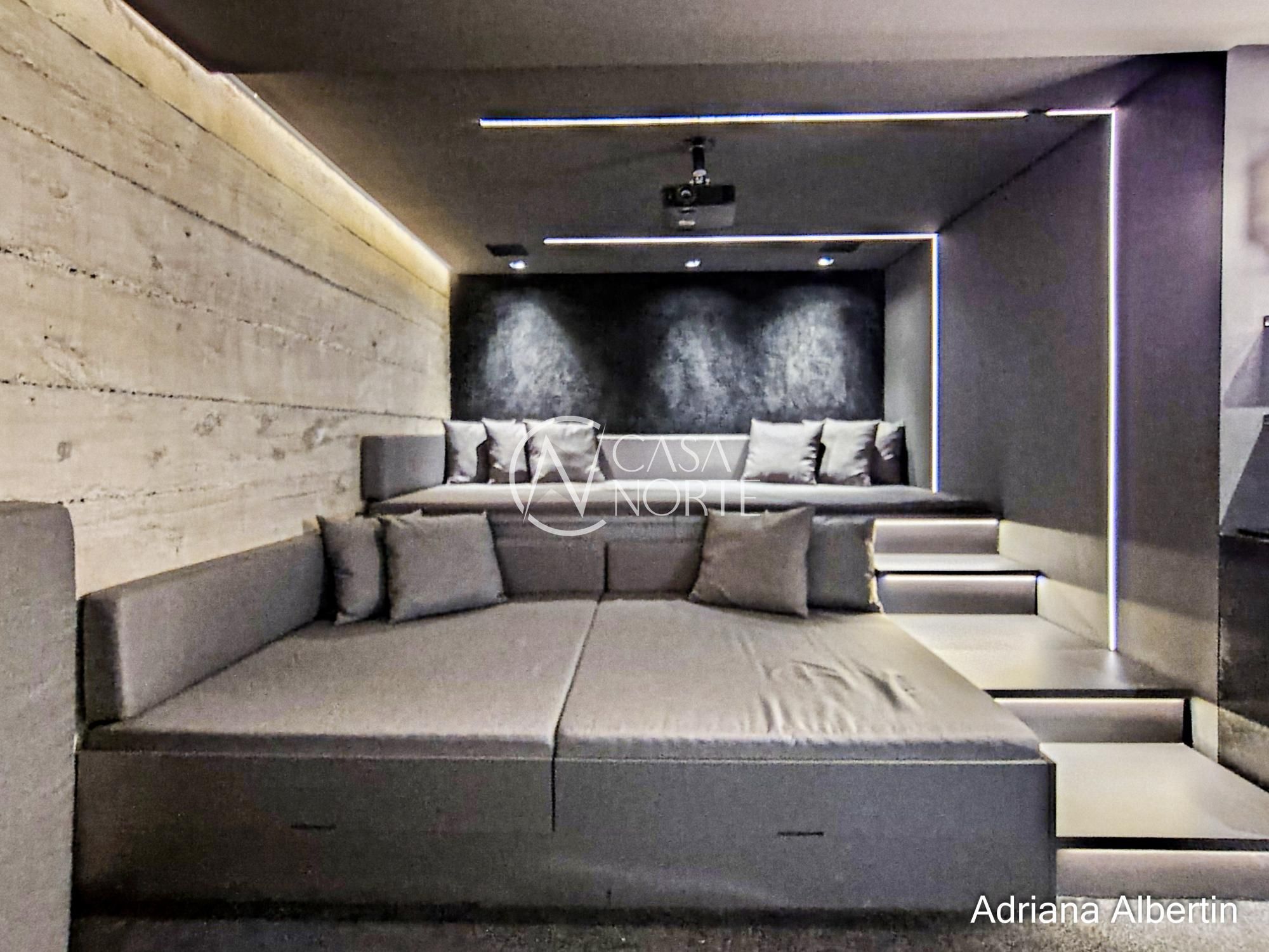 No pavimento inferior, a casa revela um diferencial raro: um verdadeiro espaço de entretenimento. Ali você encontra sala de jogos, cinema e mais um espaço gourmet, ideal para recepções maiores ou momentos de lazer sem interferir na área íntima da casa.