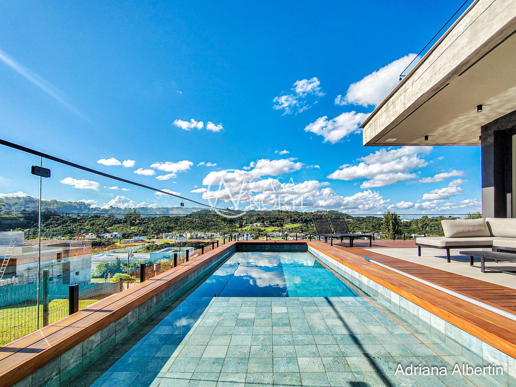 No andar principal, a área social conecta sala de jantar e espaço gourmet em um ambiente integrado, perfeito para receber. As portas se abrem para a área externa, onde a piscina se conecta diretamente com o gourmet — criando aquele cenário clássico de final de semana com amigos e família.