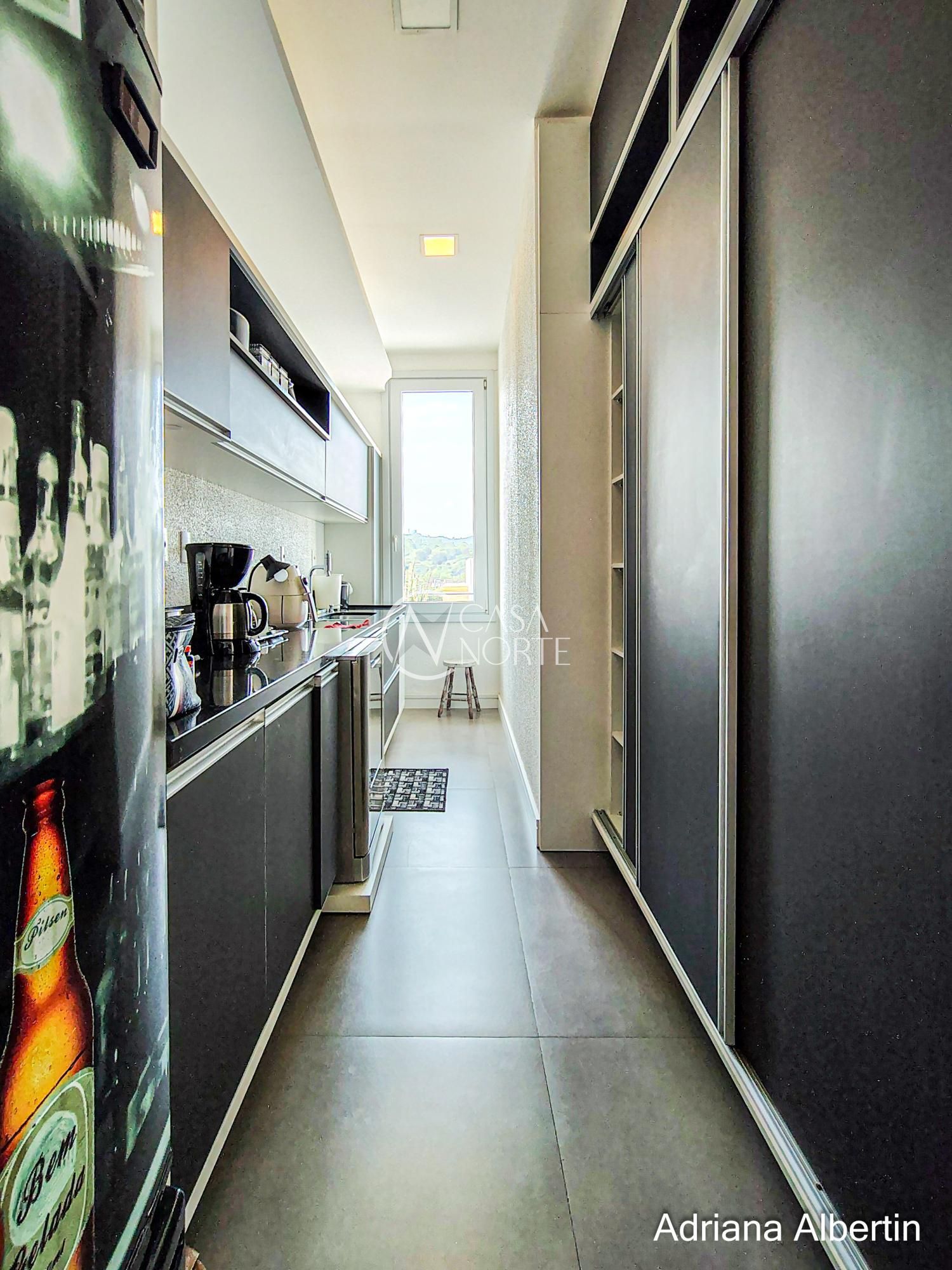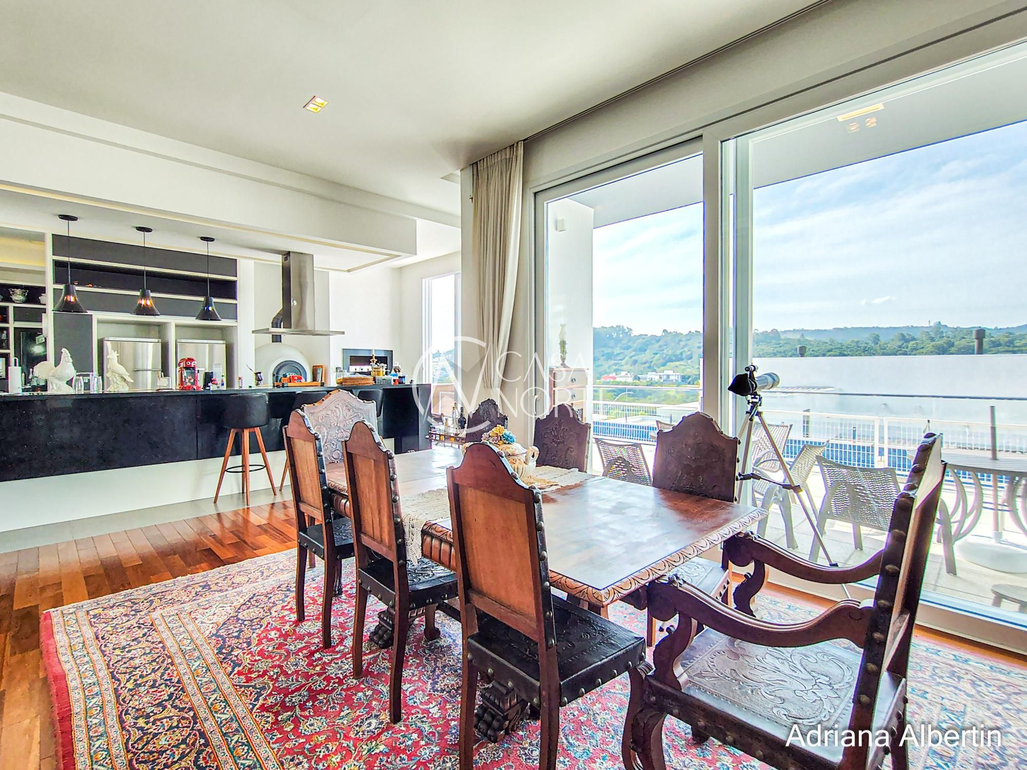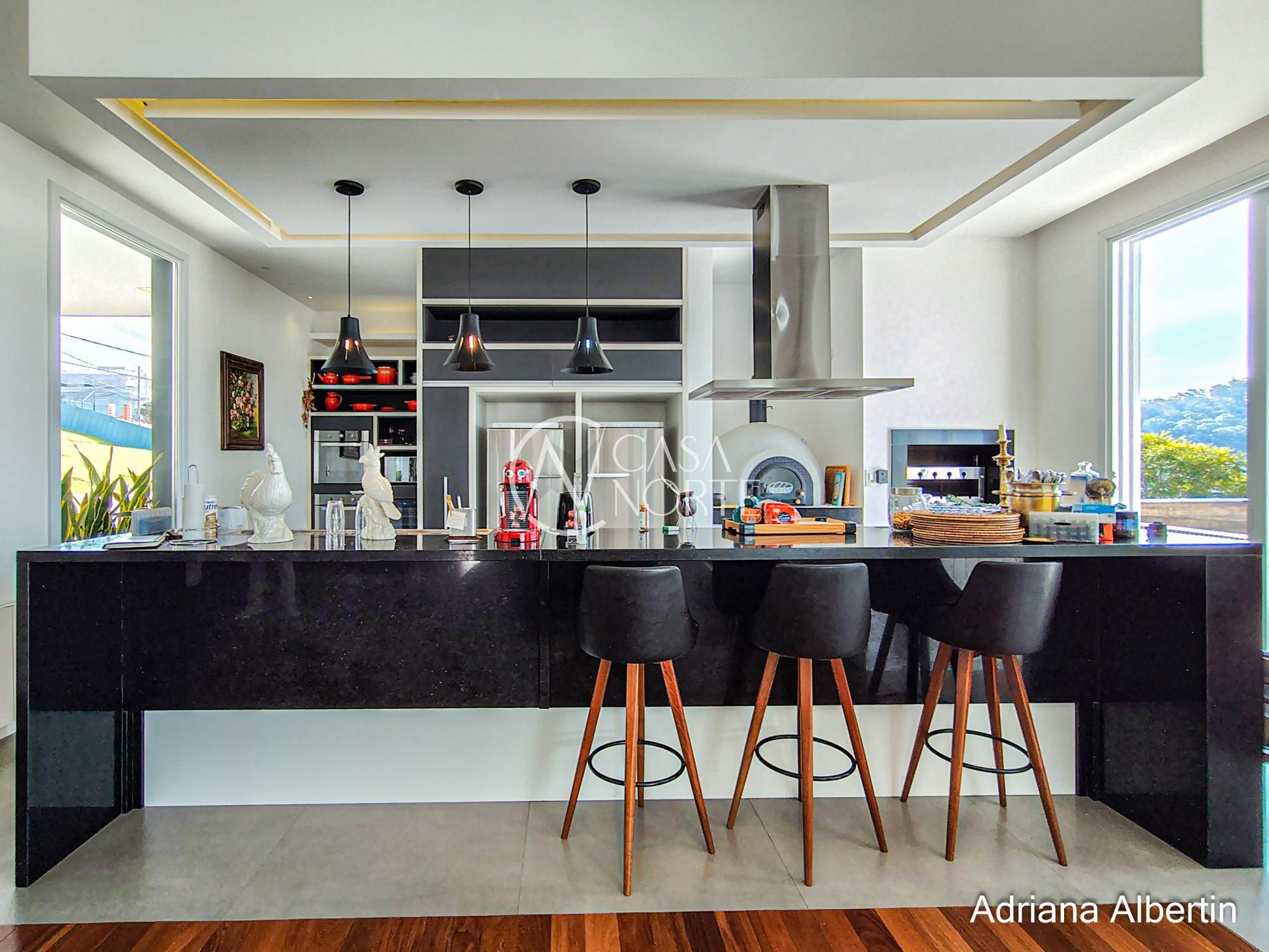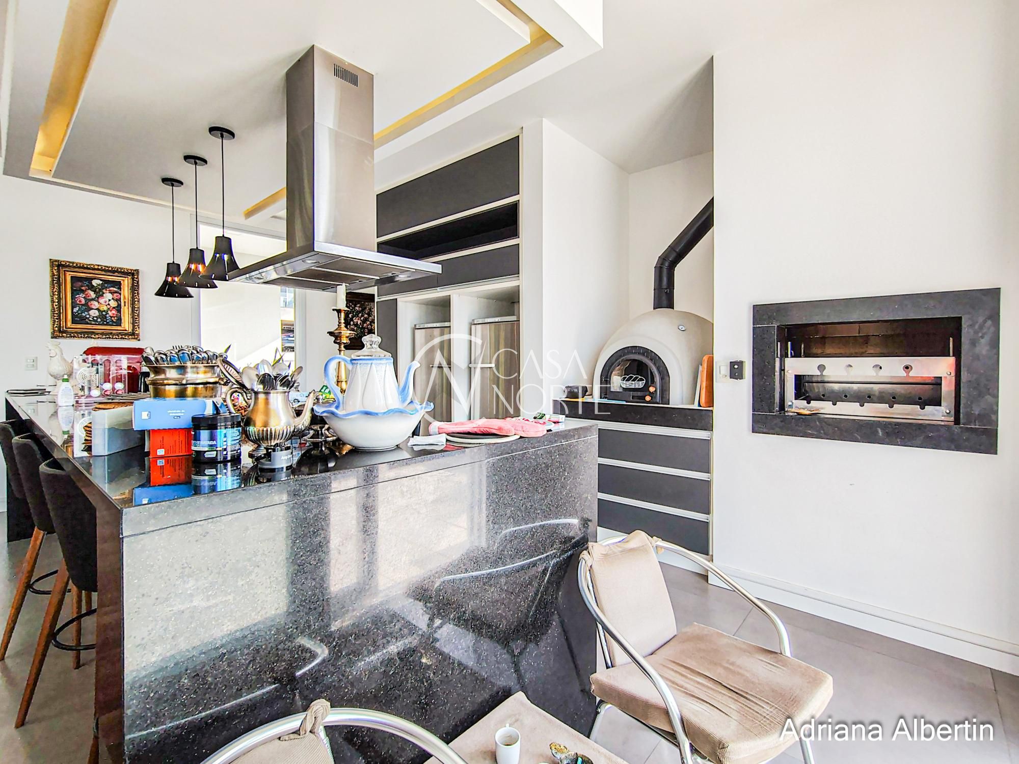 A cozinha se conecta direto com o espaço gourmet, que tem churrasqueira e forno de pizza — não é um ambiente isolado, é parte da casa.