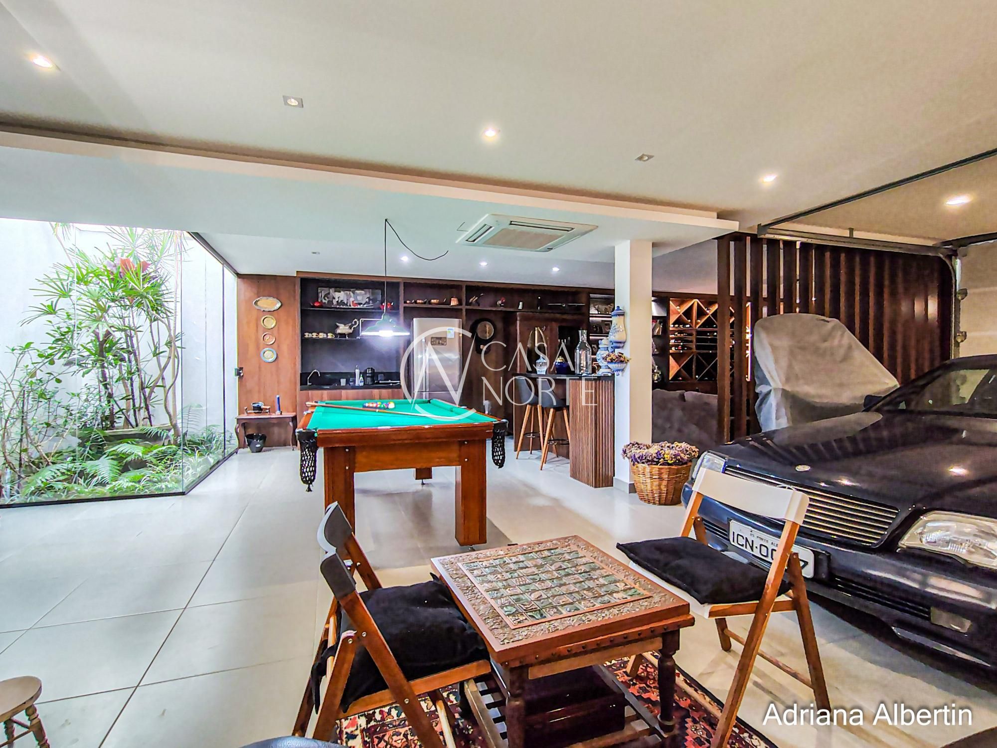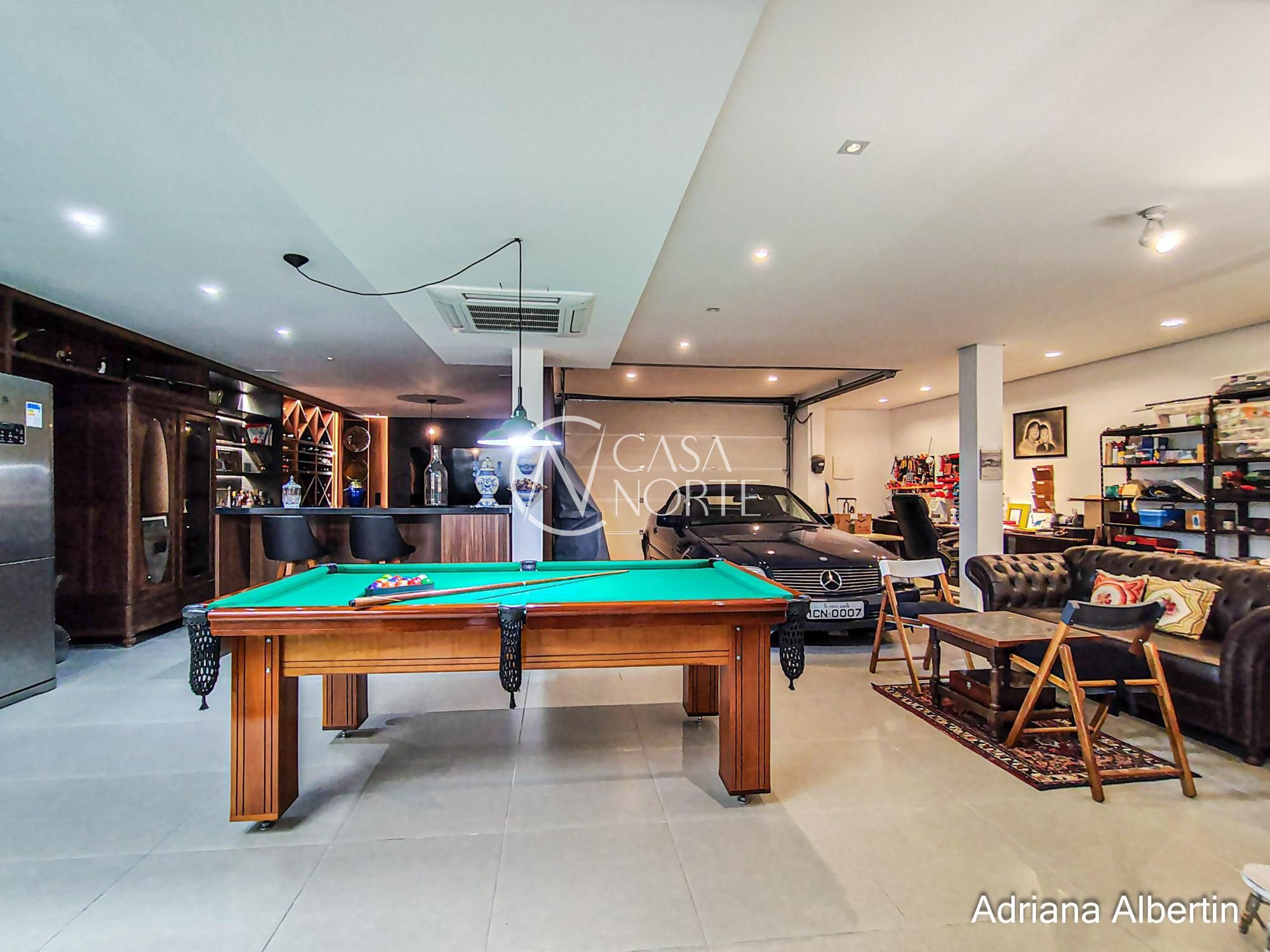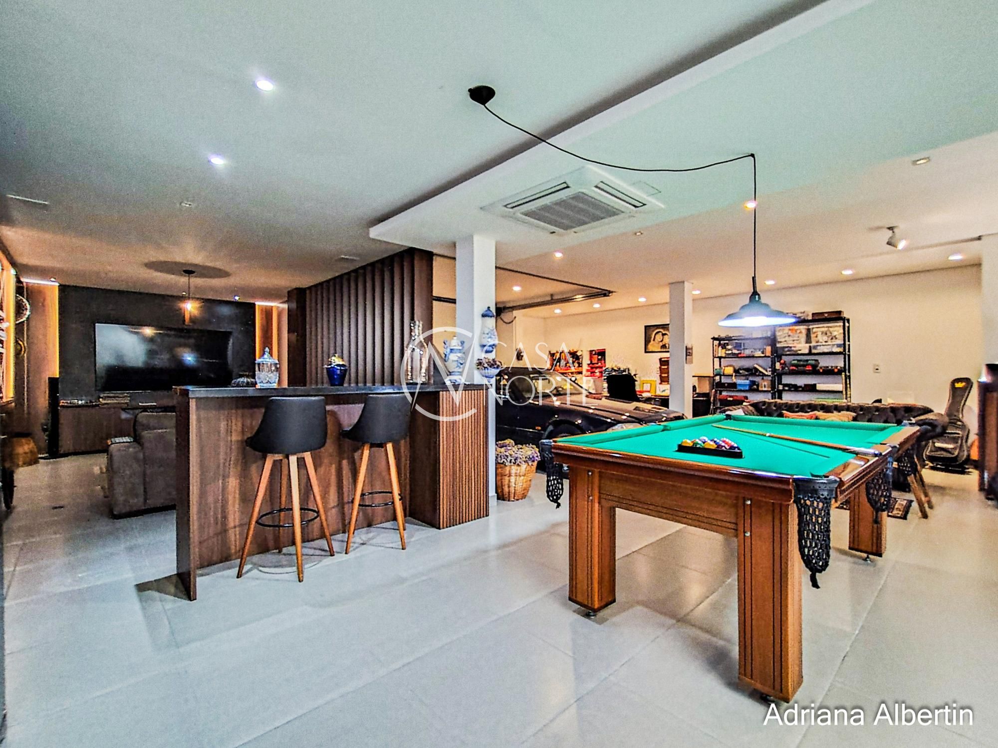 Na parte inferior, o diferencial que muda o jogo: salão amplo com mesa de sinuca e espaço de cinema. Aqui é onde a casa vira ponto de encontro. Conta também com uma lavanderia espaçosa e um banheiro auxiliar.